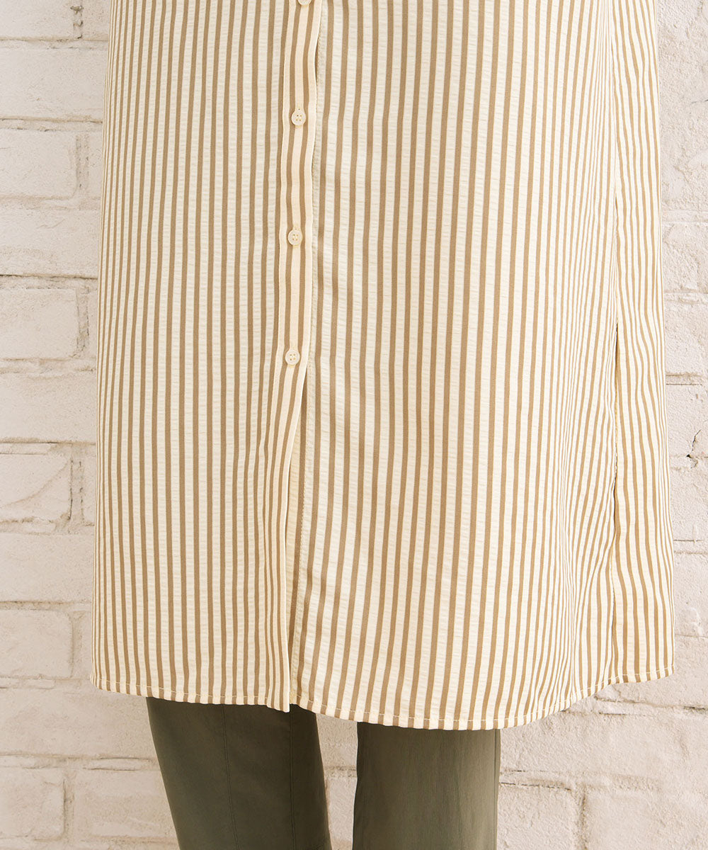 首元はバンドカラーですっきりと、前開きボタン仕様で羽織としても使える万能デザイン。