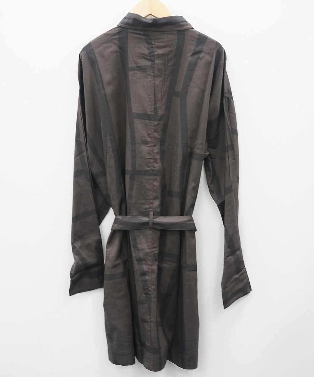 落ち着いたダークトーンに幾何学柄をのせた、洗練された印象のシャツチュニック。