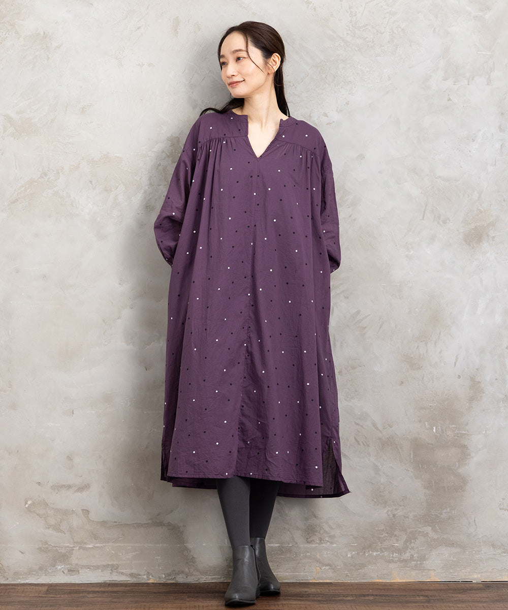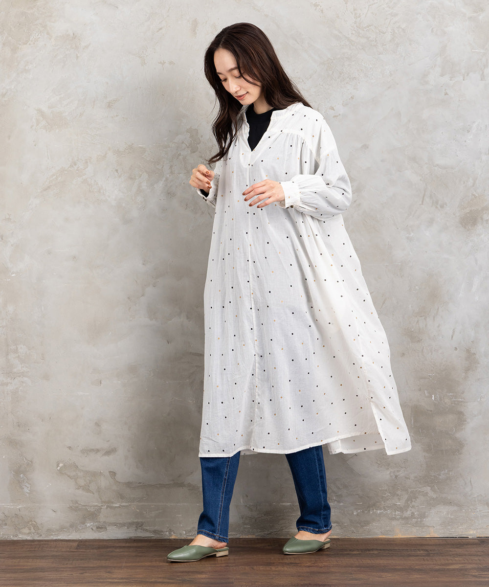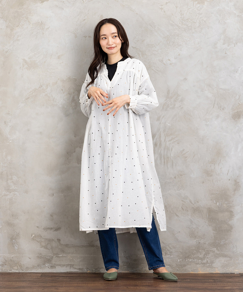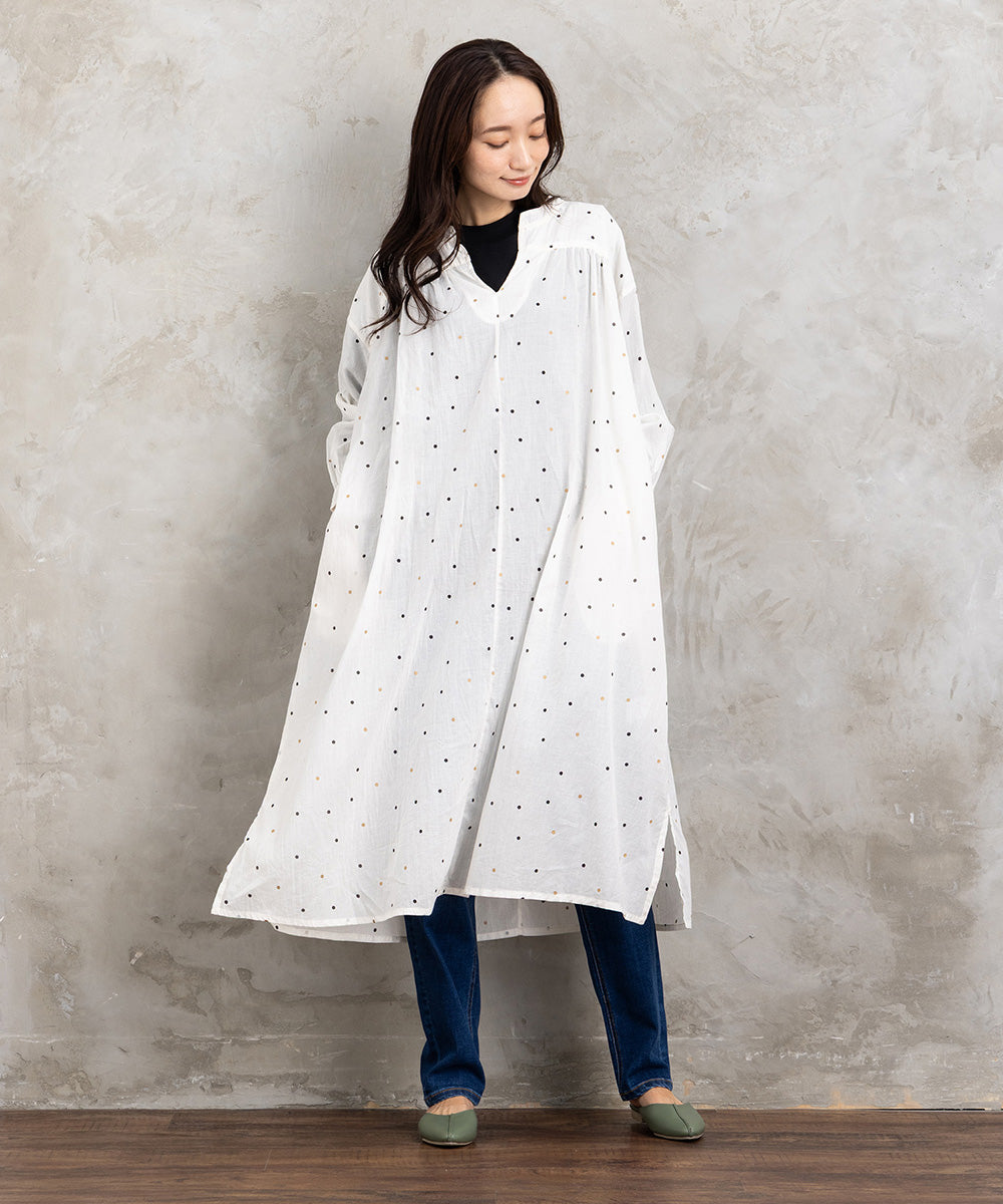 ドット柄を散りばめた優しい印象のコットンワンピース。