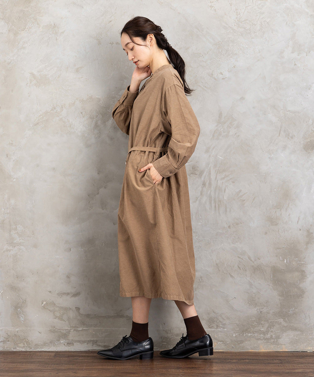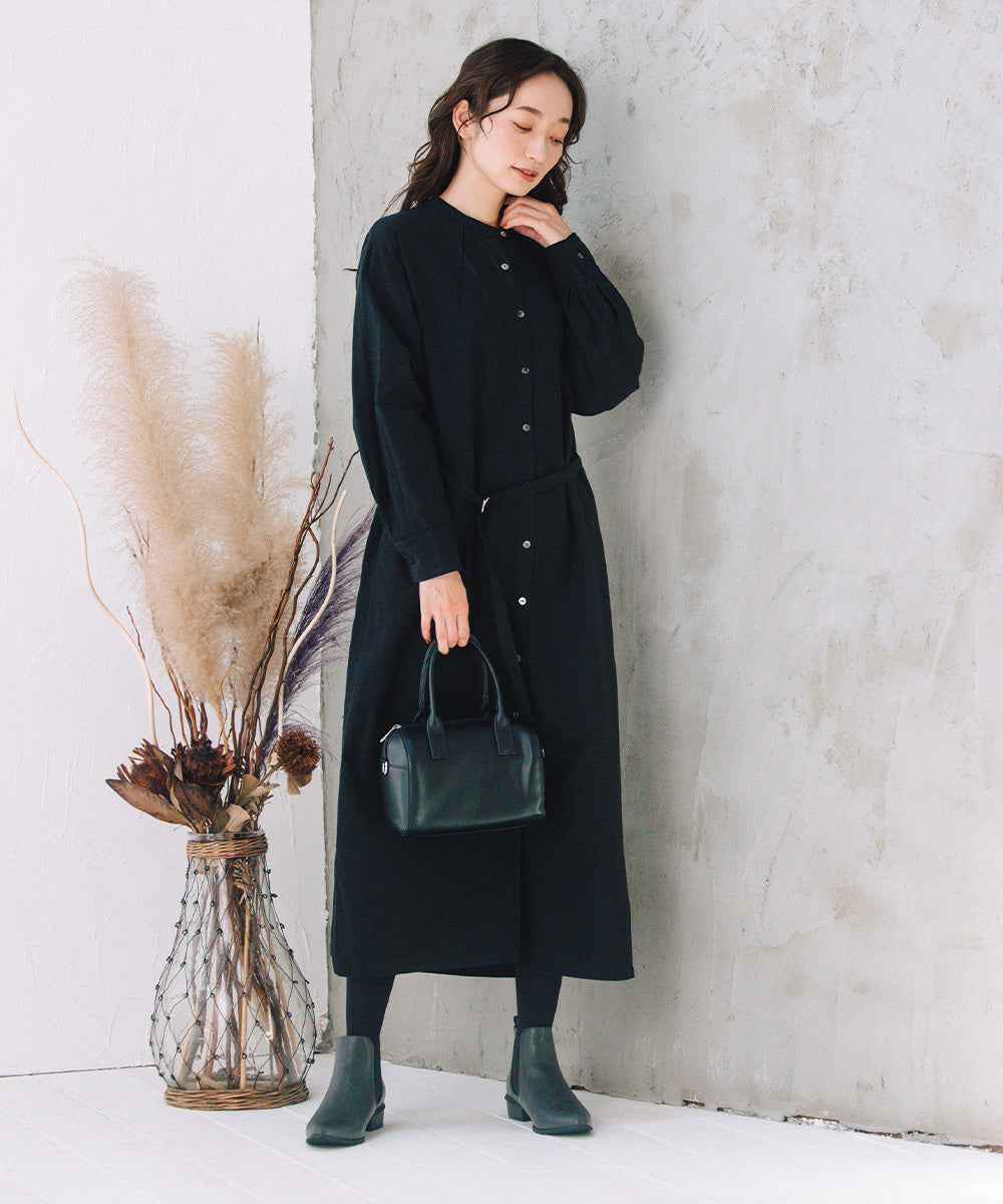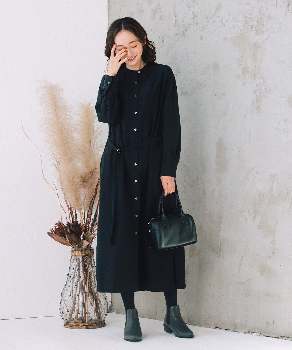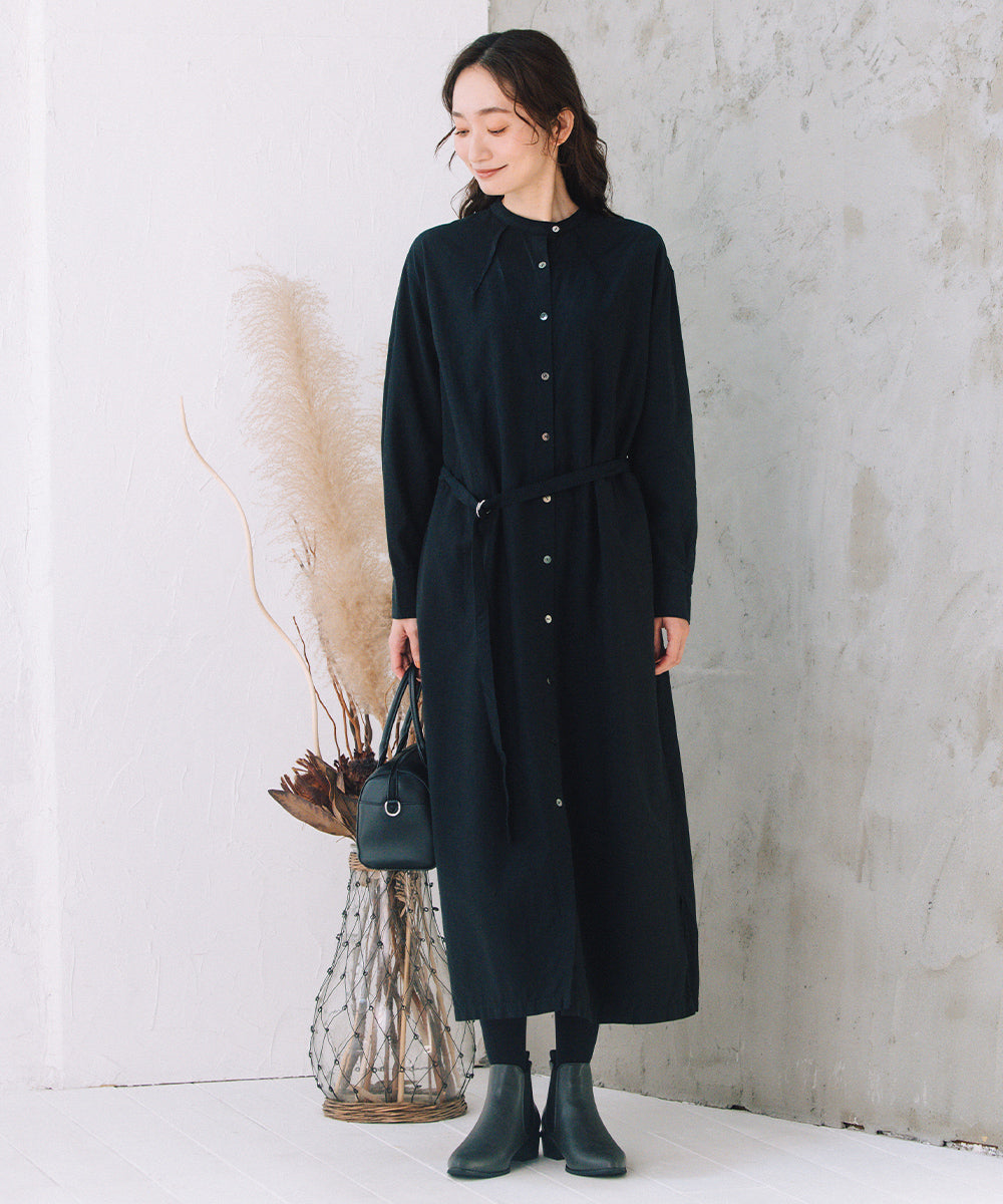 ノーカラーの首元と、ウエストマークできる共布ベルト付きで、着こなしの幅も広がります。