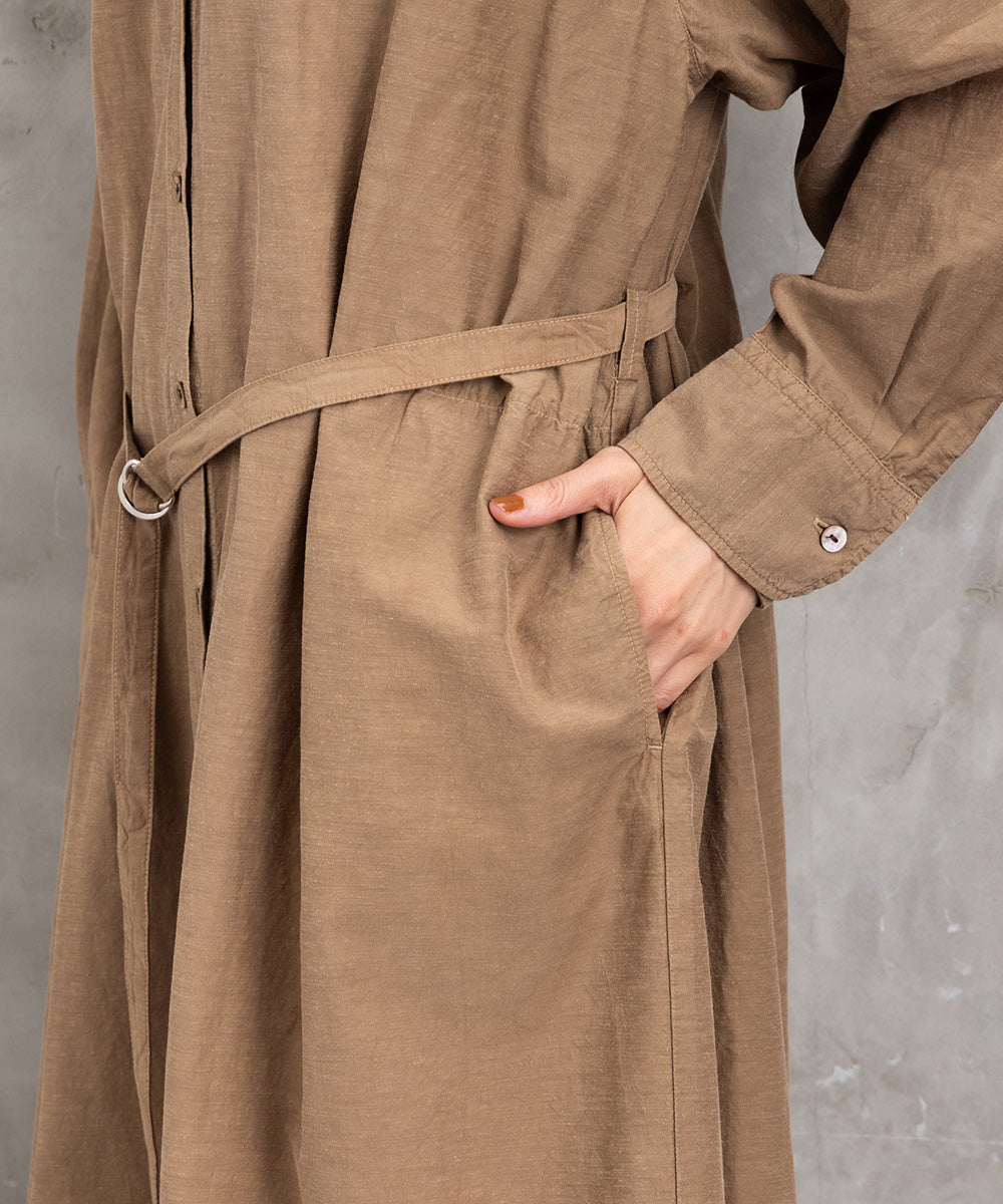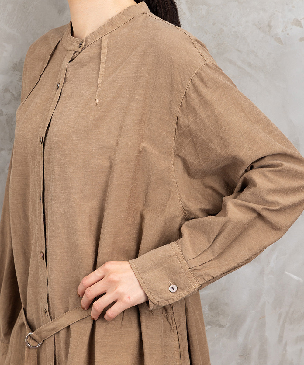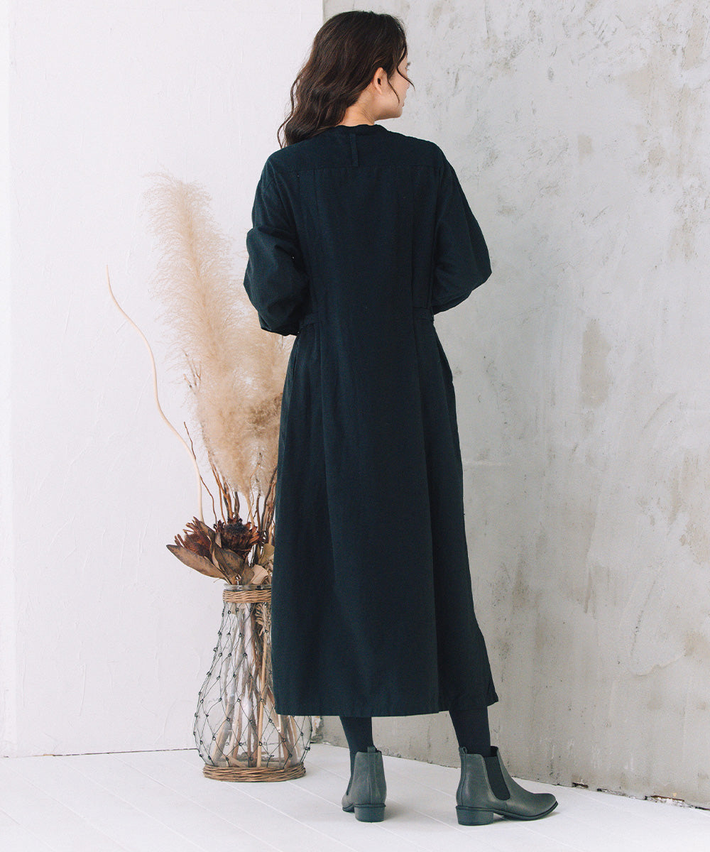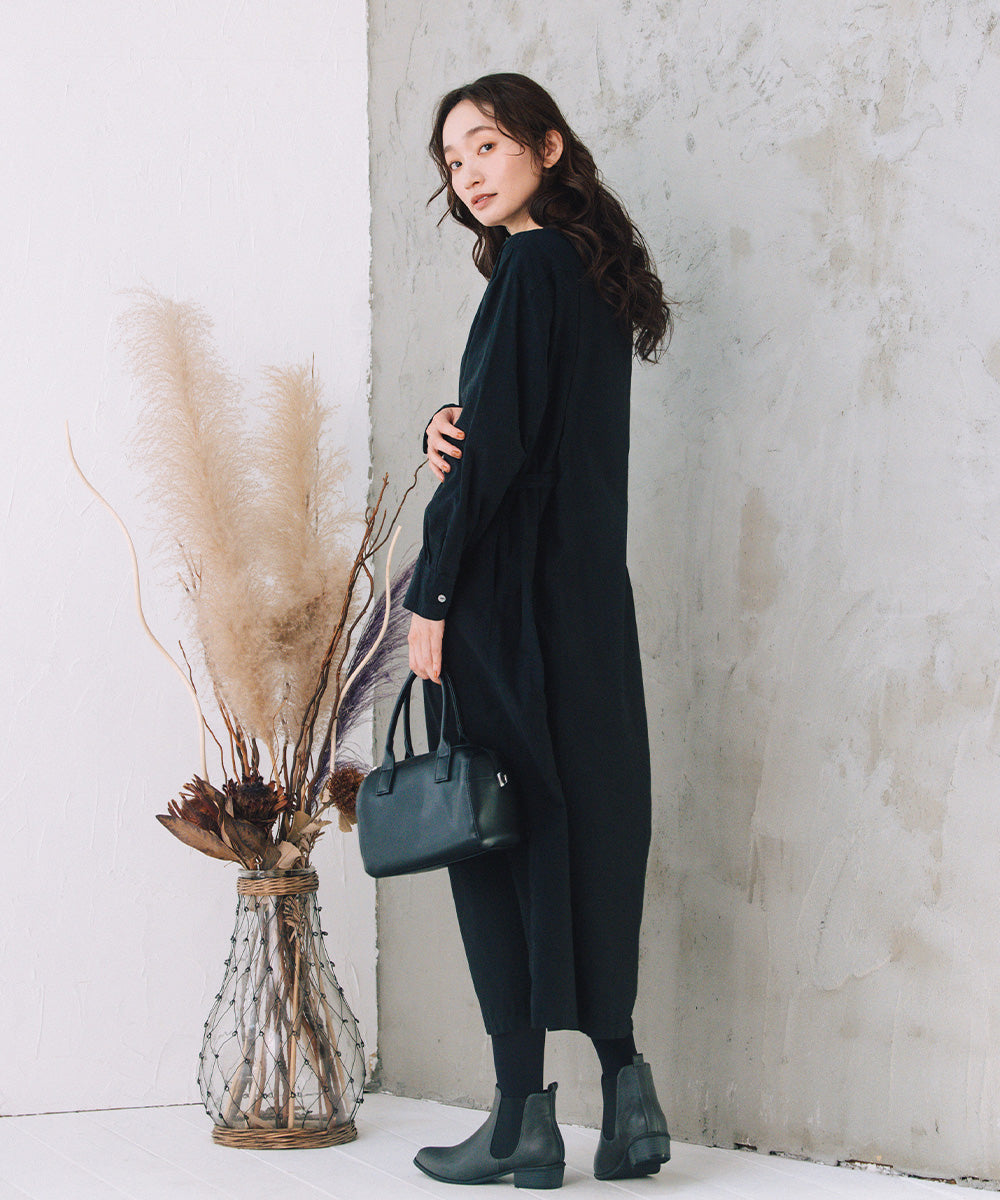 ノーカラーの首元と、ウエストマークできる共布ベルト付きで、着こなしの幅も広がります。