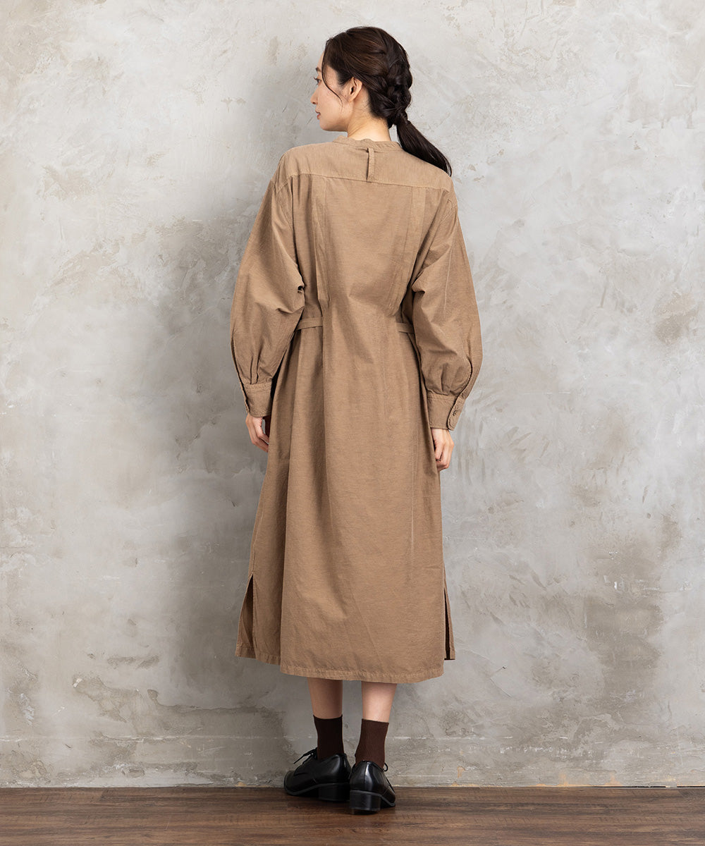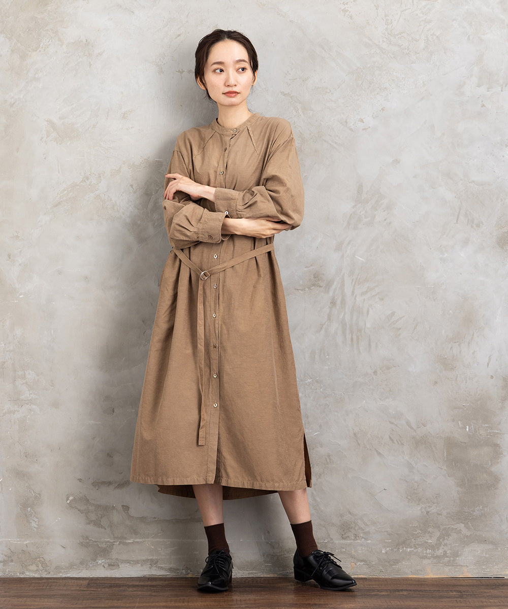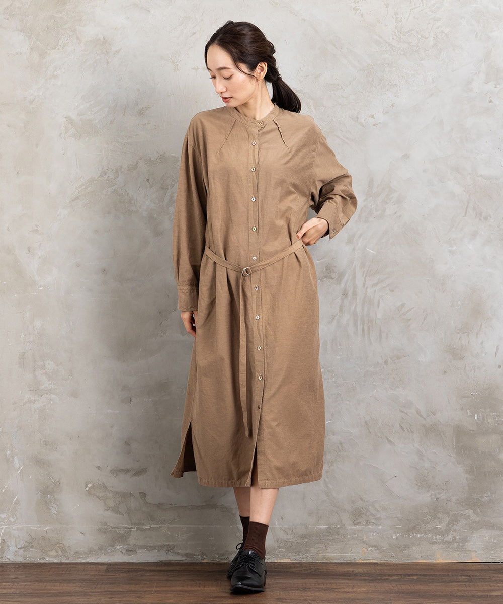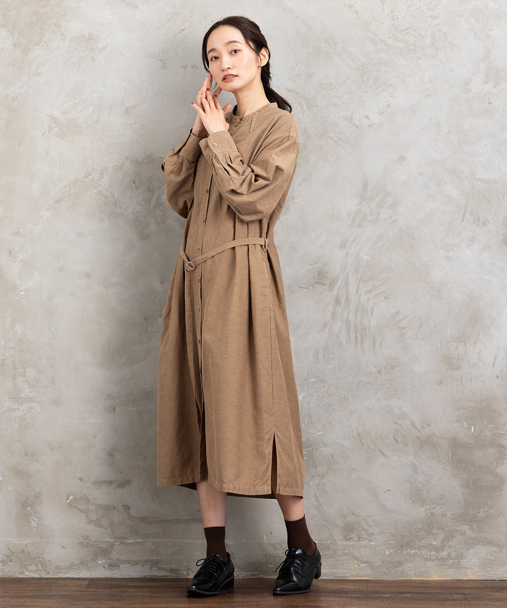 ・デザインポイント:ノーカラー、共布ベルト、ボタンフロント