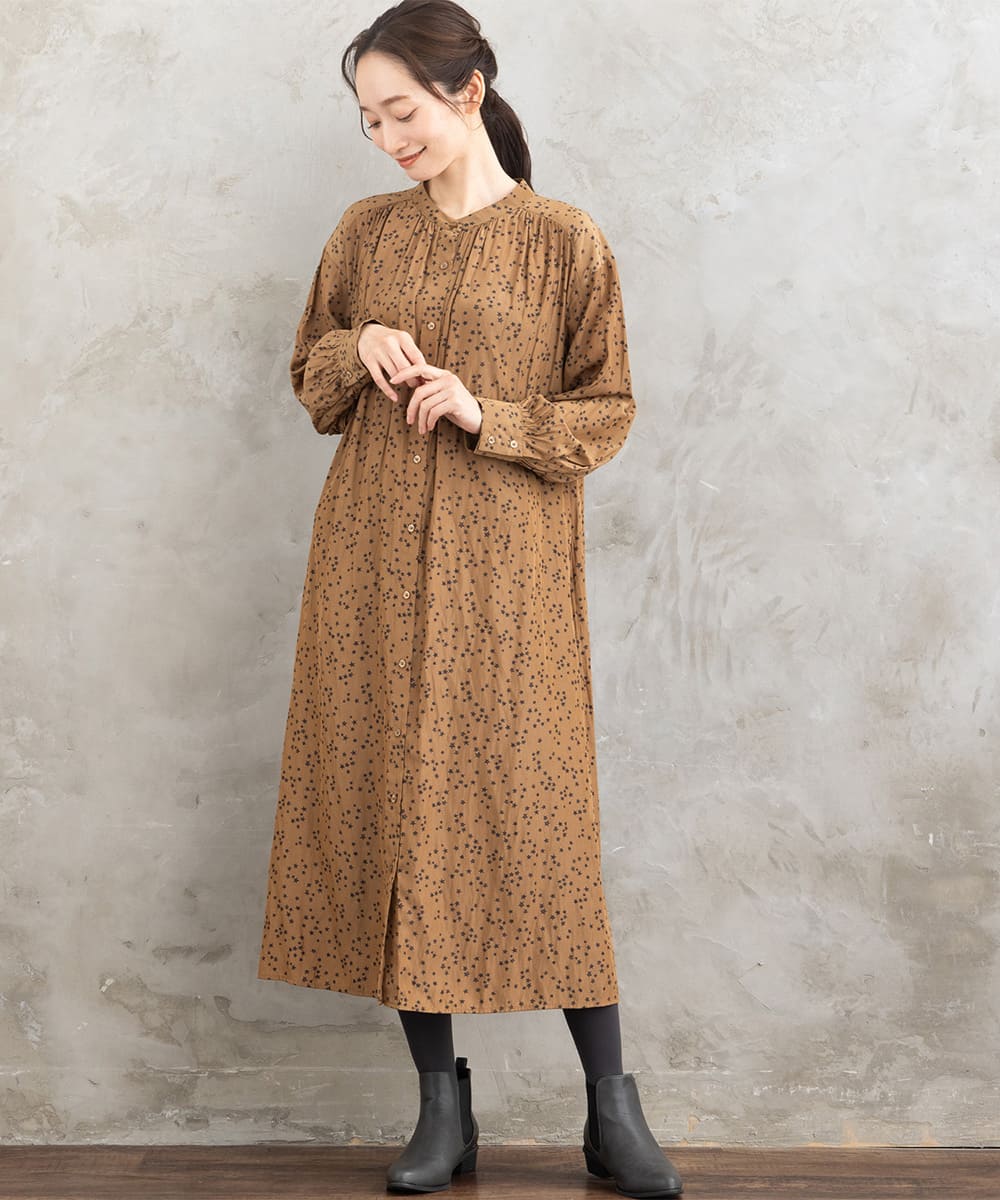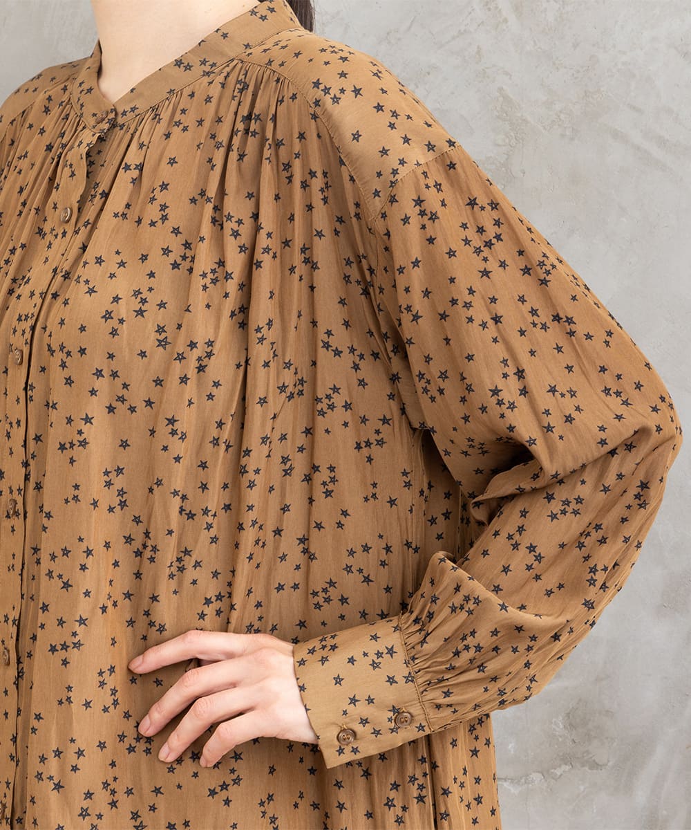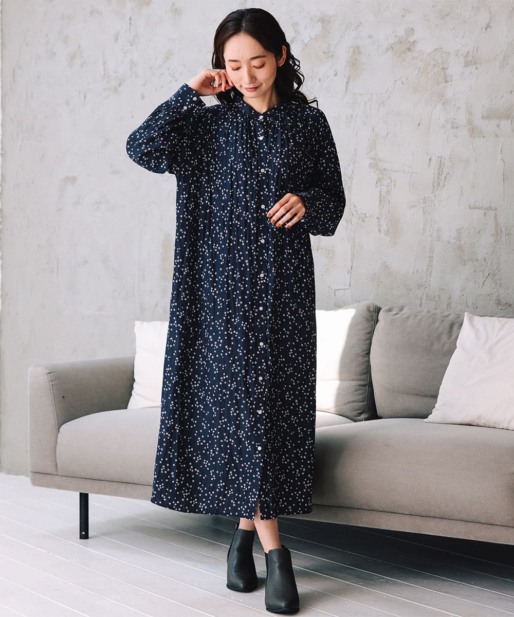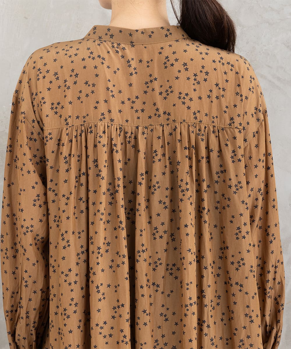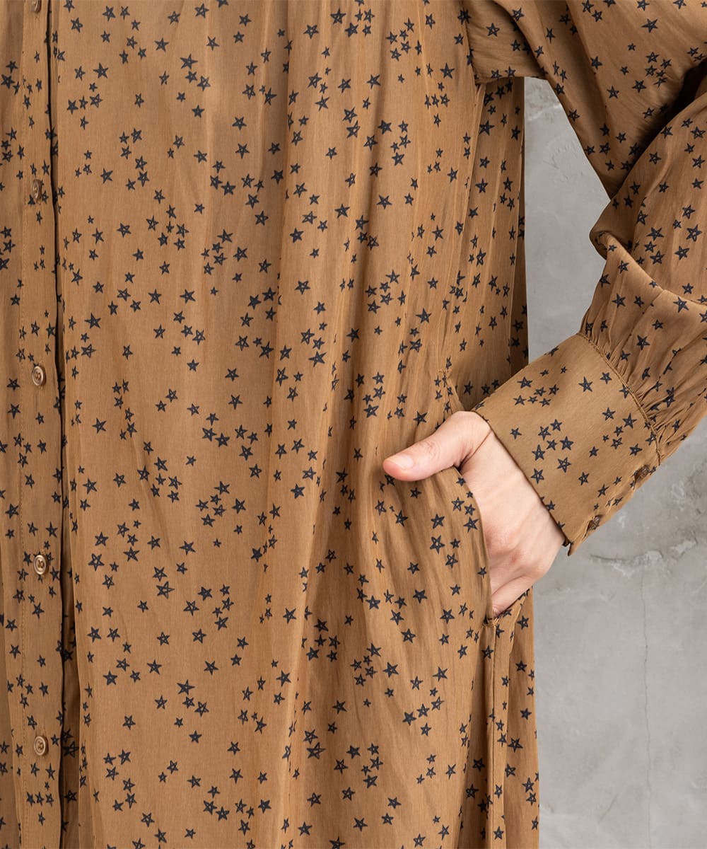 ・デザインポイント:ギャザー入り、星柄、ロング丈、フロントボタン