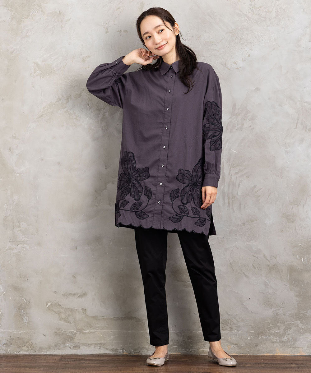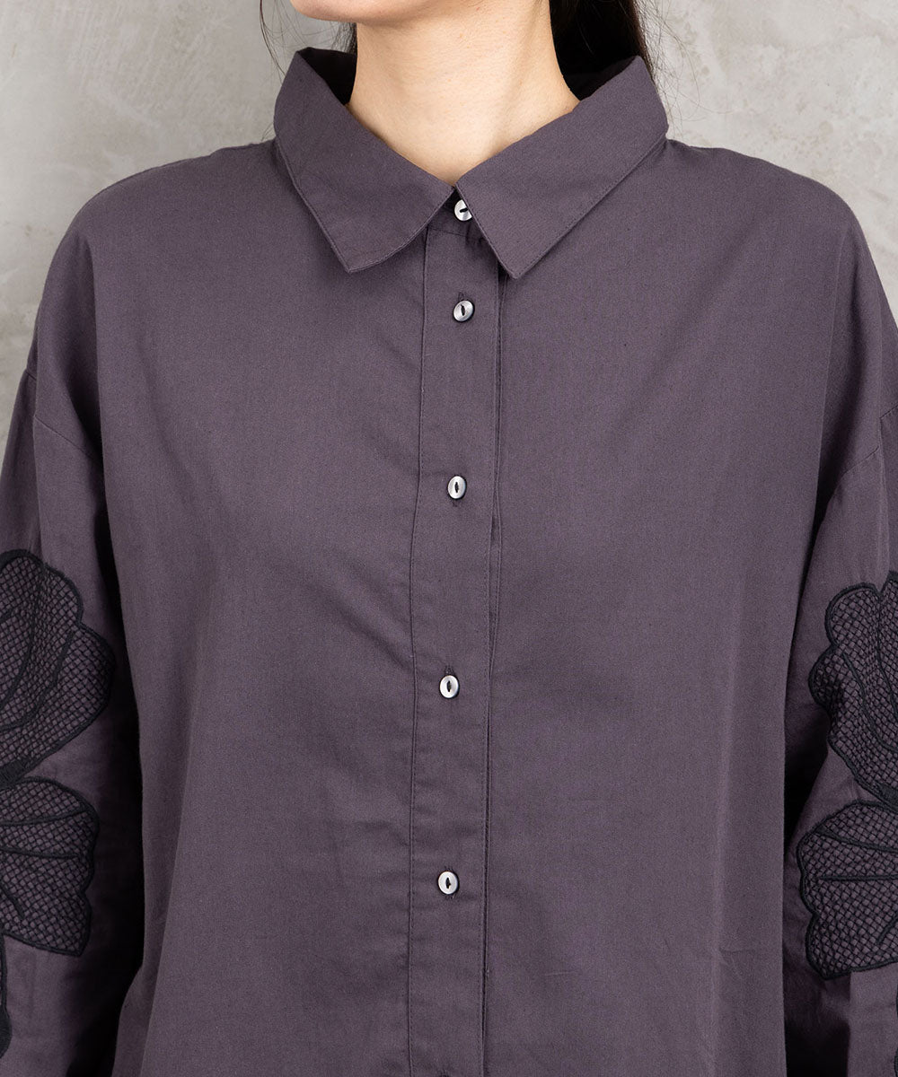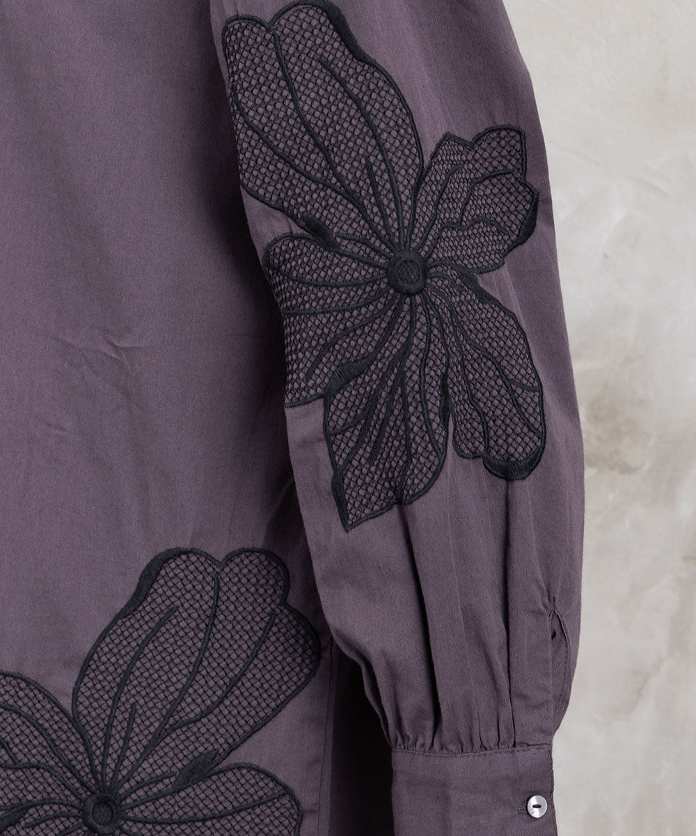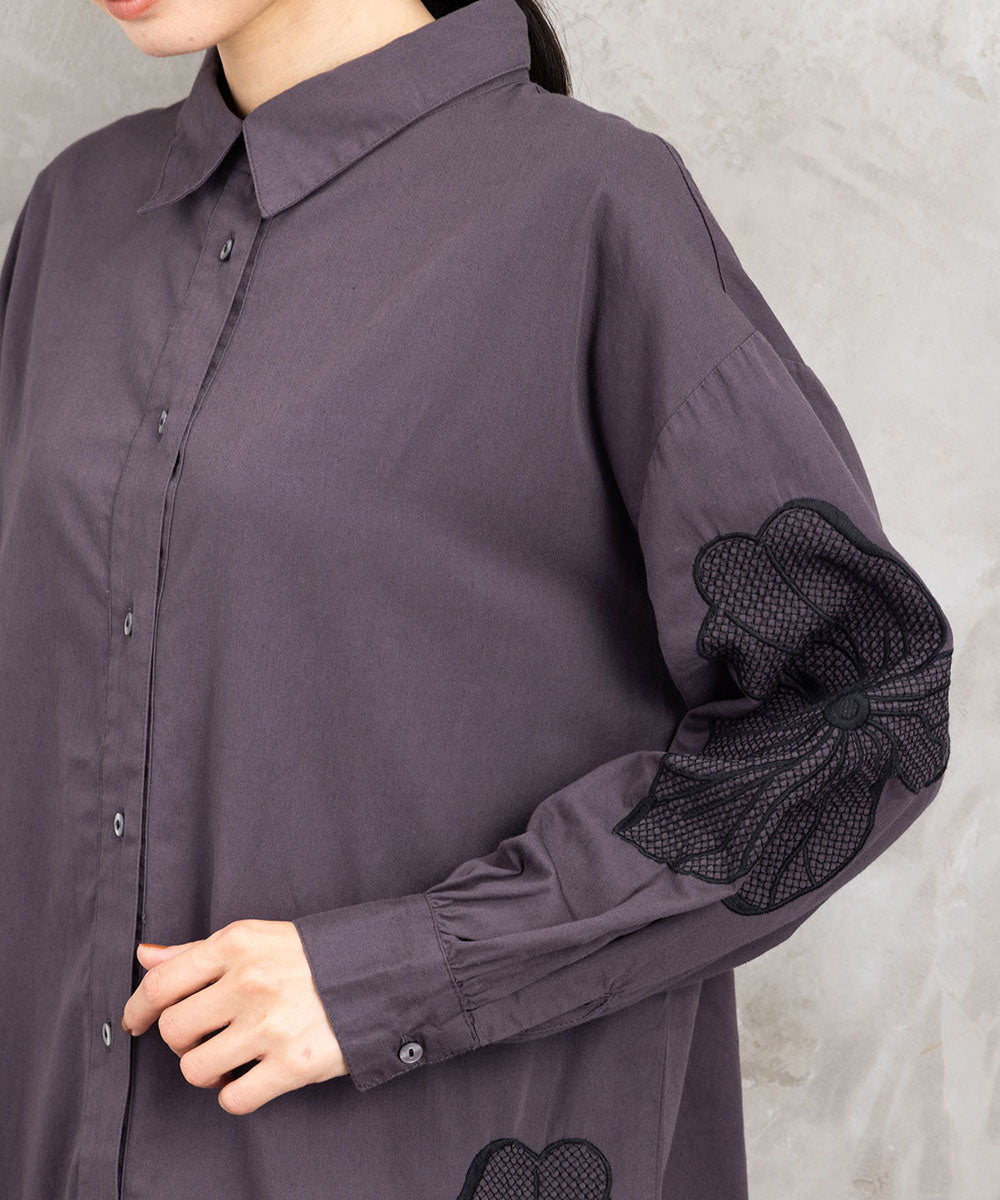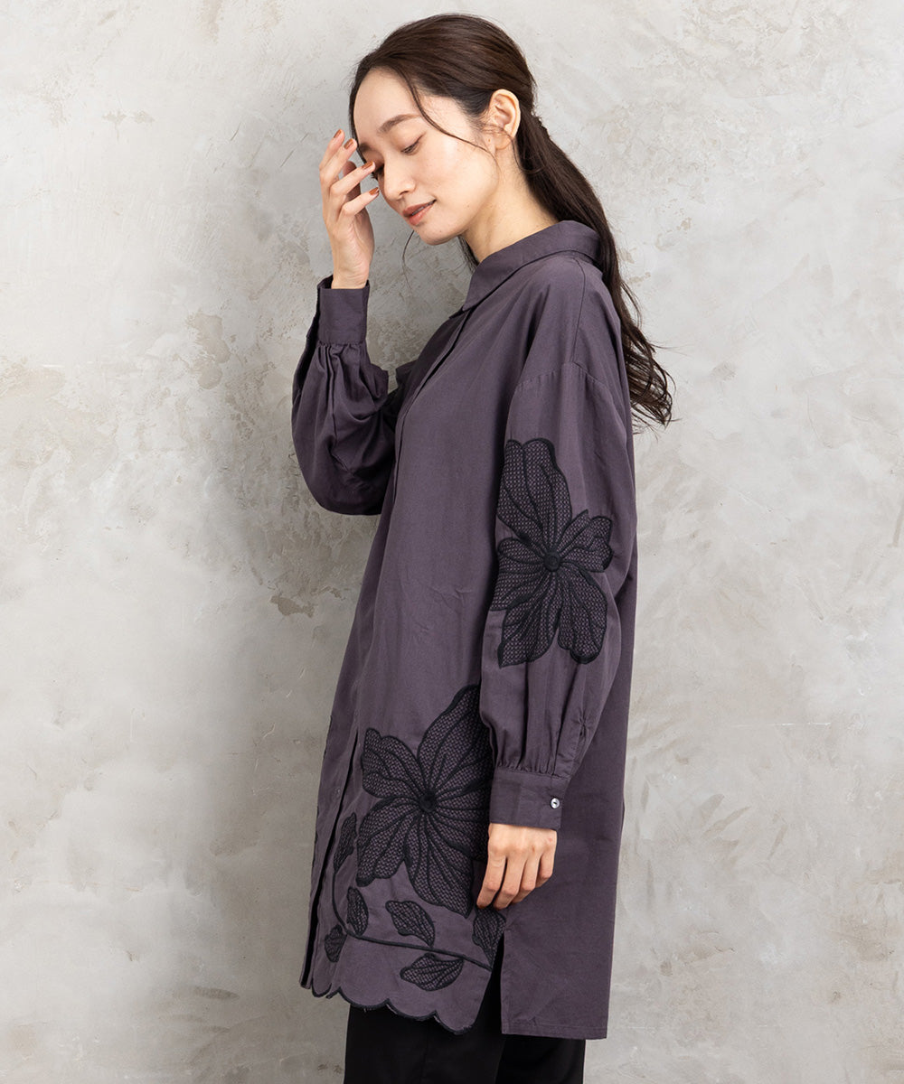 シンプルなシャツワンピースに、大きめのフラワーモチーフ刺繍を施した印象的な1枚。