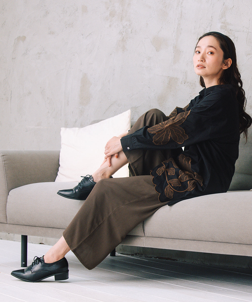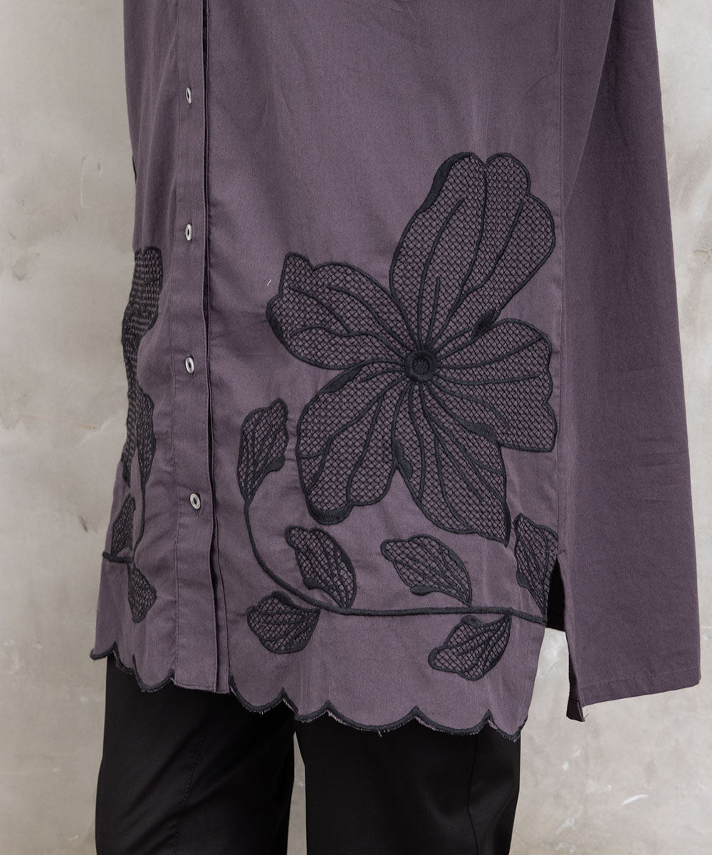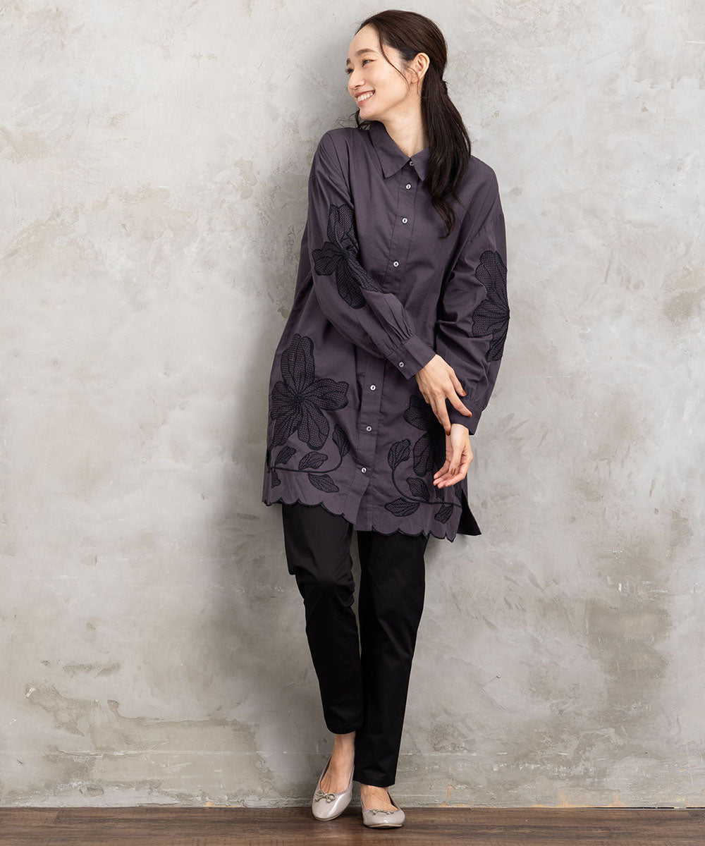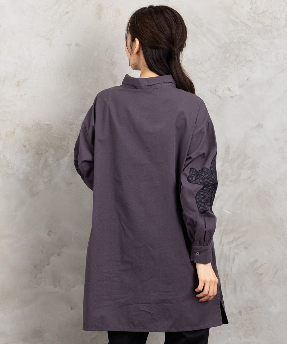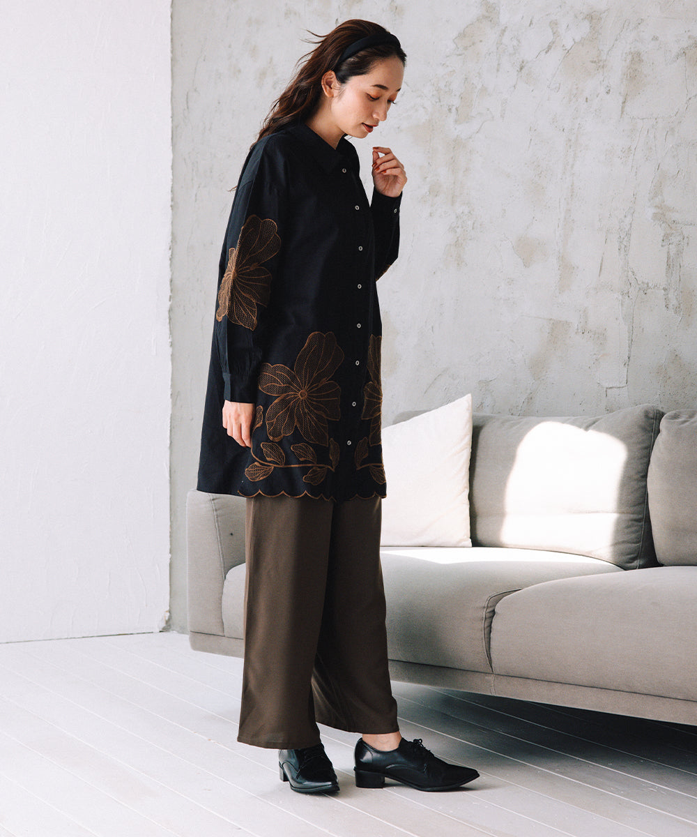 シンプルなシャツワンピースに、大きめのフラワーモチーフ刺繍を施した印象的な1枚。