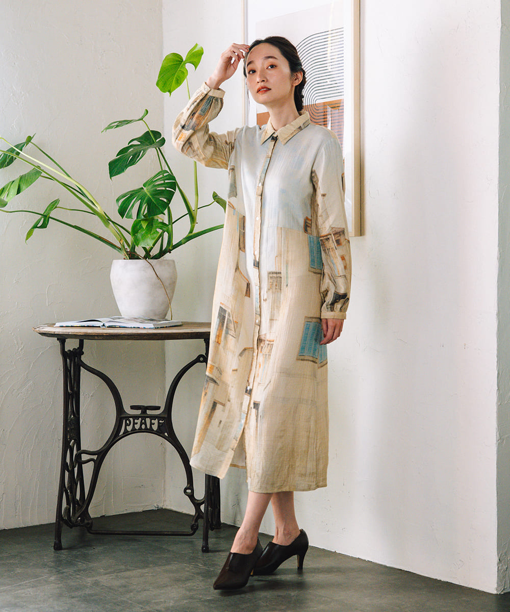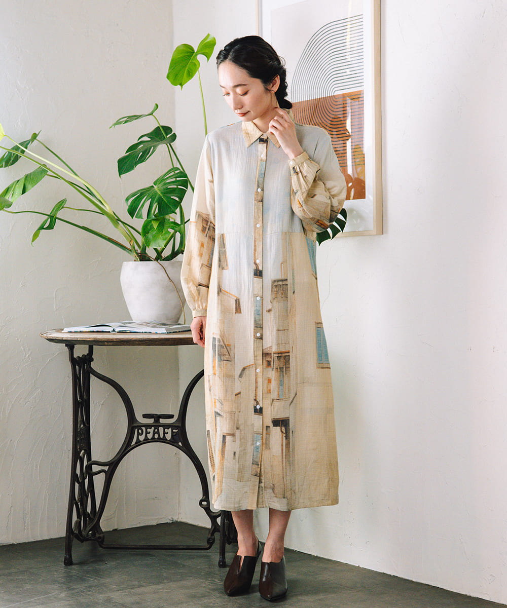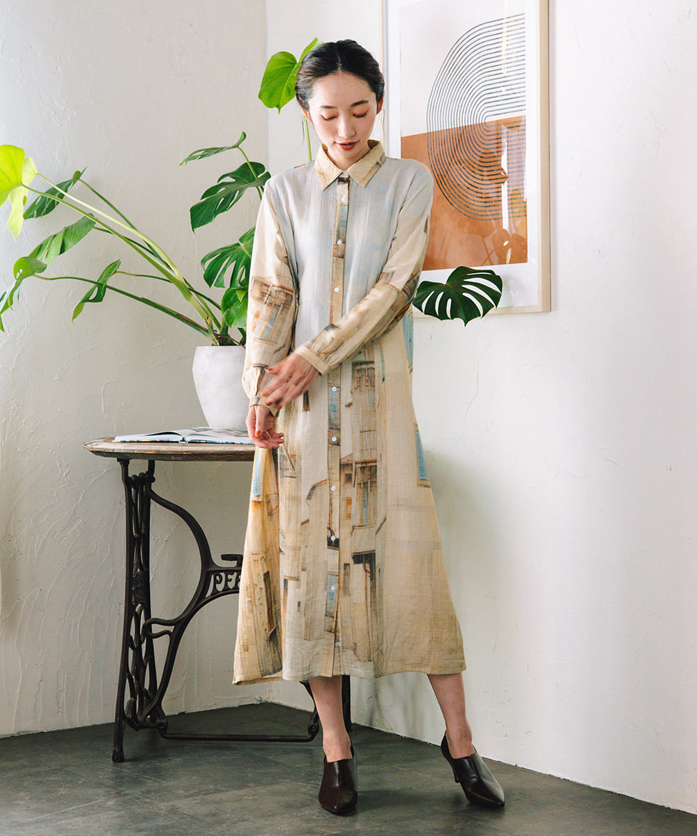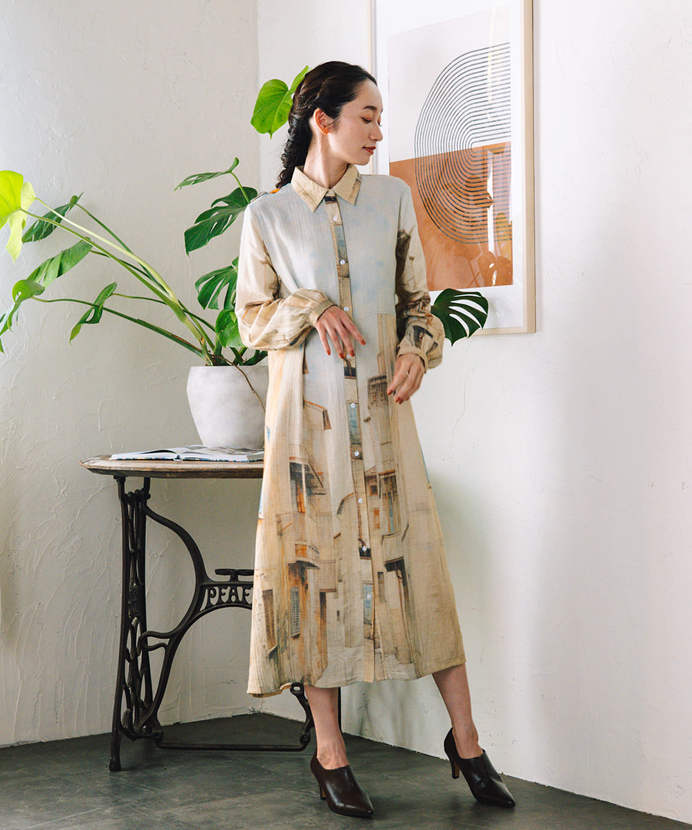 まるで絵画のような建物モチーフのプリントが印象的な、ロング丈のシャツワンピース。