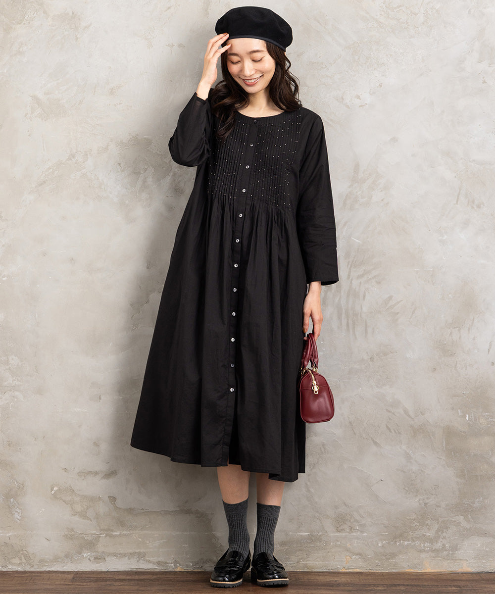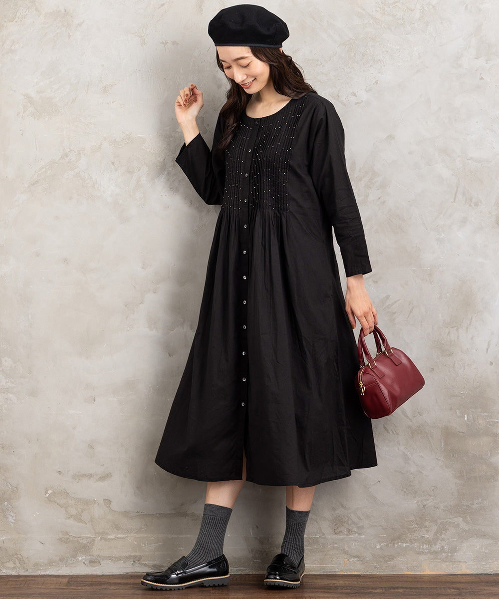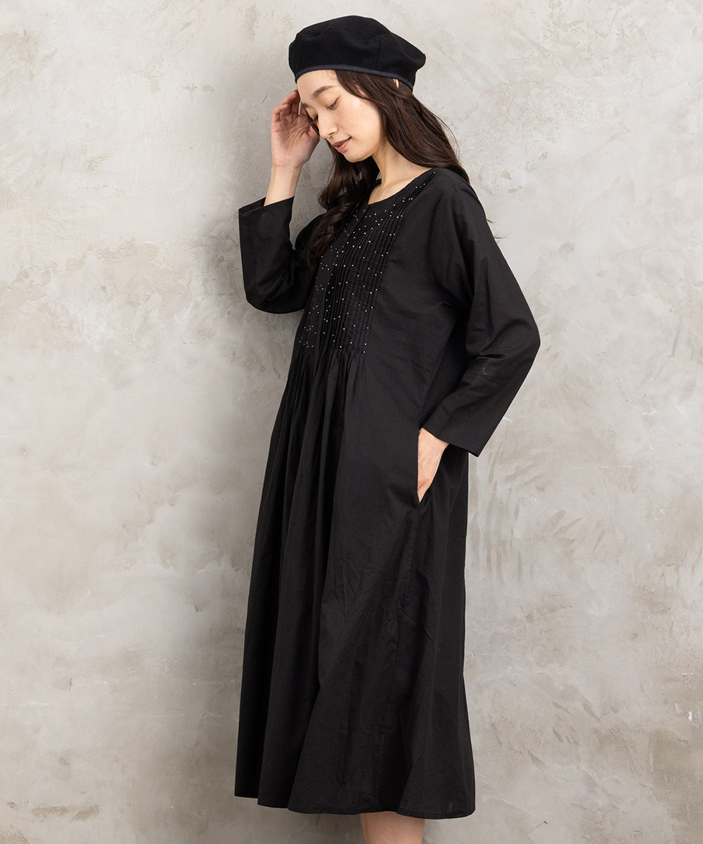 フロントに施された繊細なピンタックとビーズ刺繍が、シンプルながらも華やかさを添えるブラックワンピース。