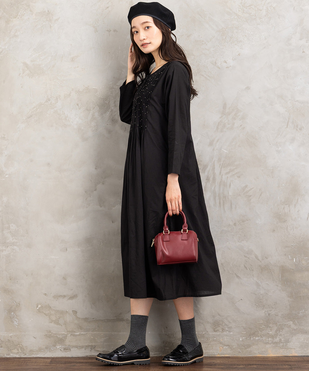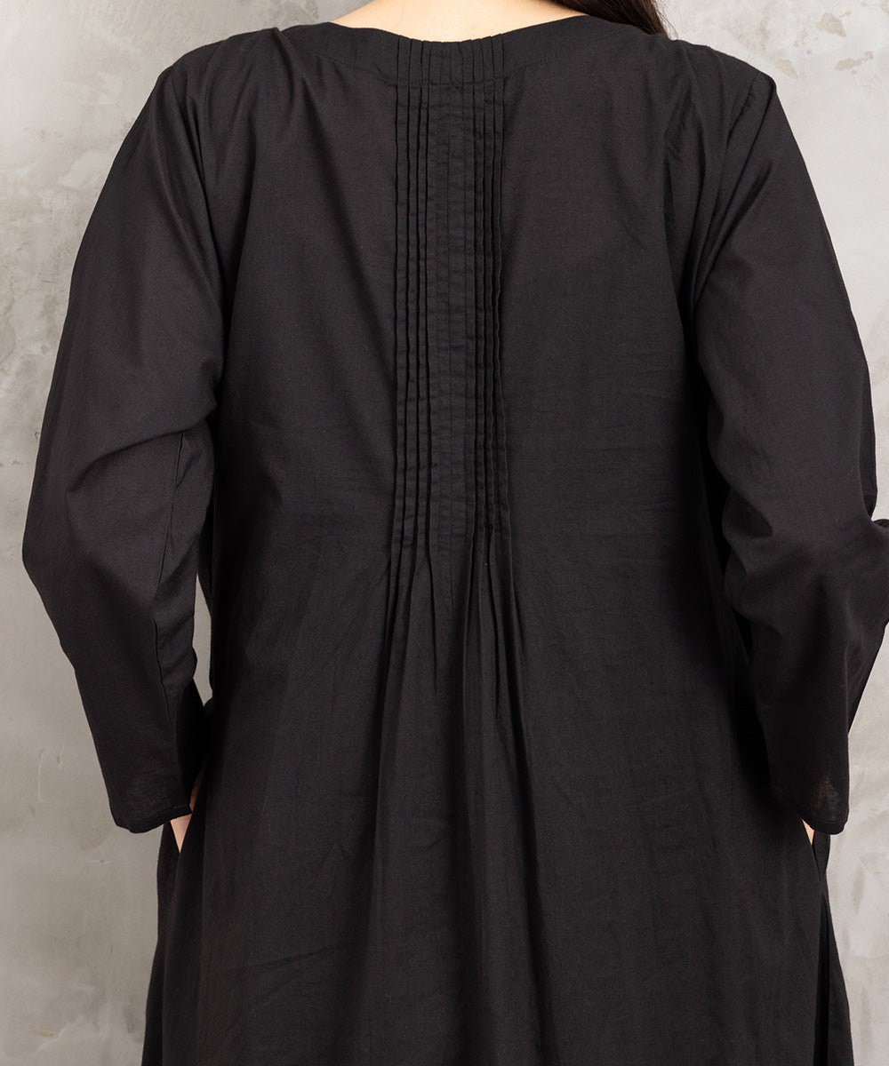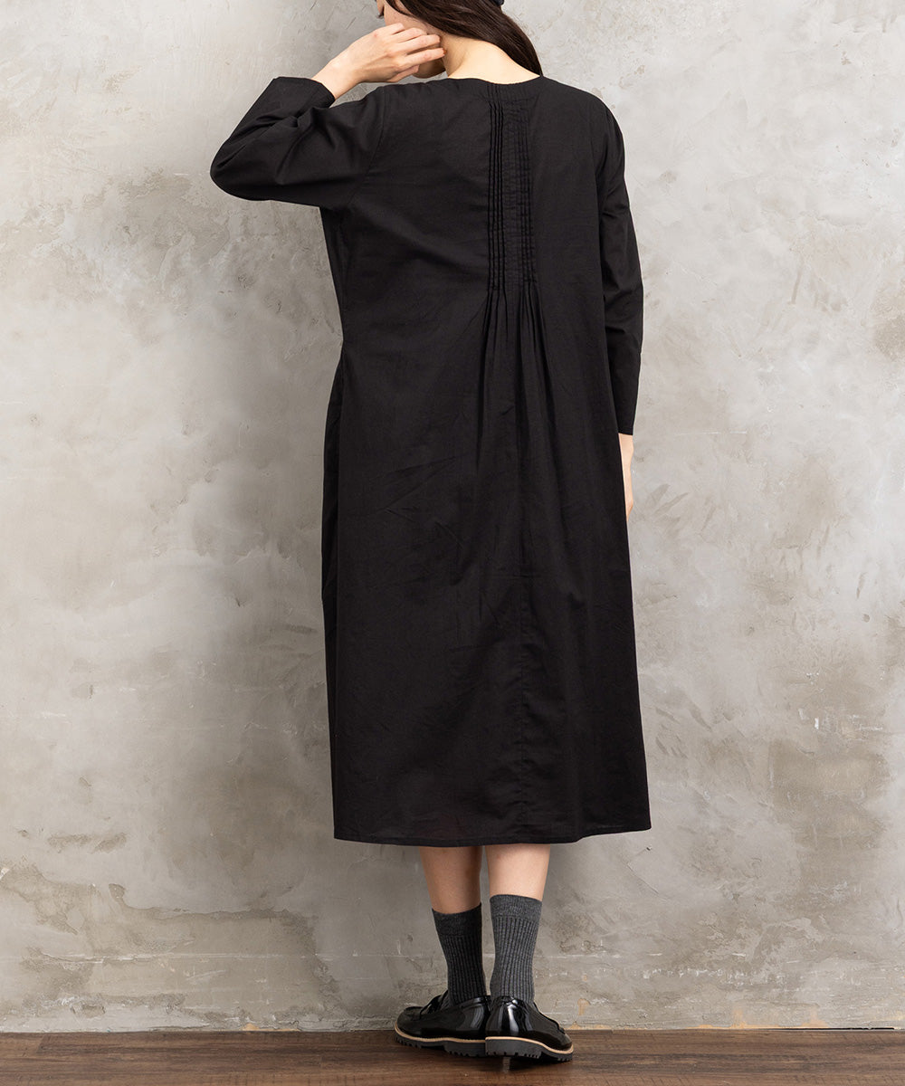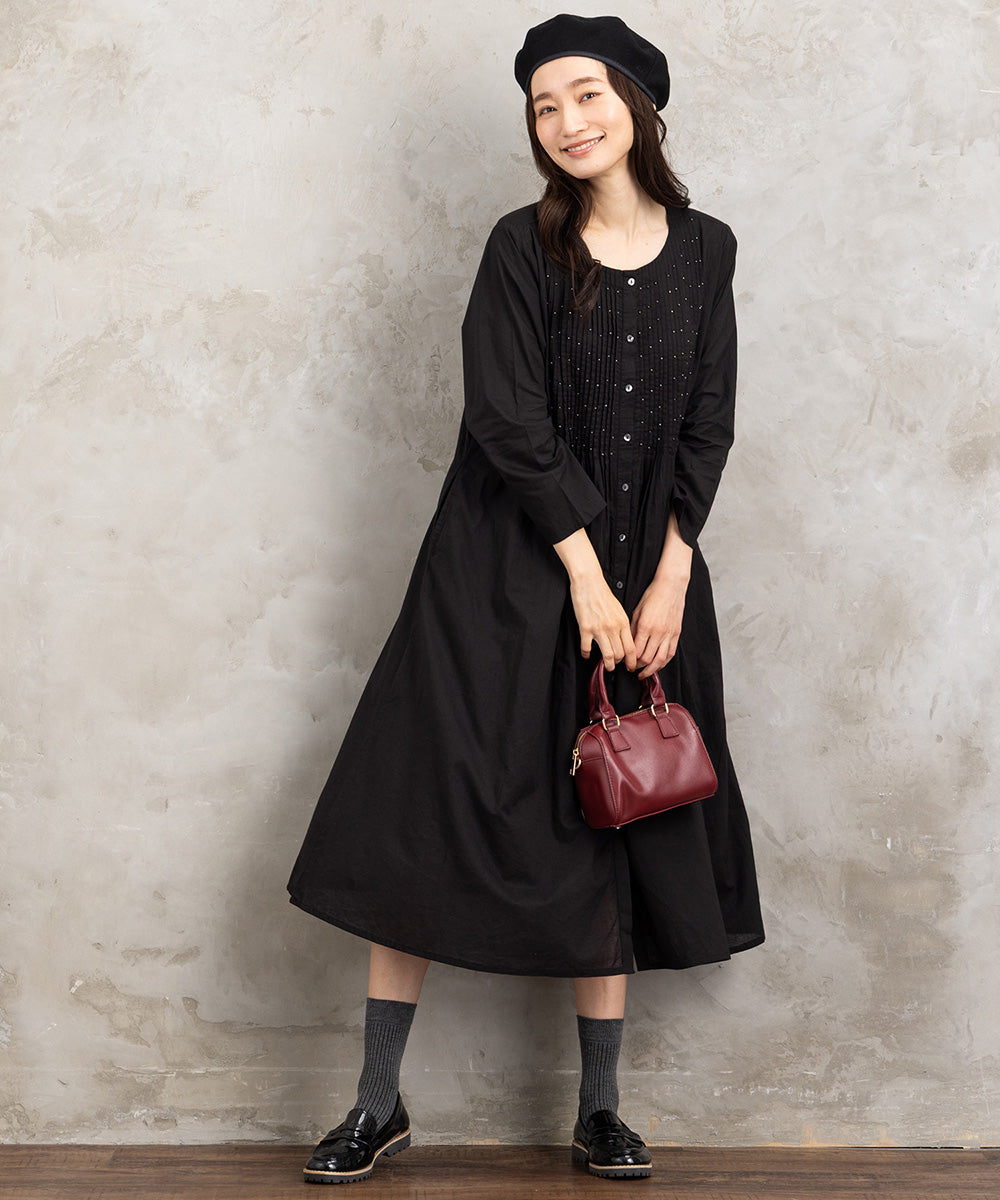 フロントに施された繊細なピンタックとビーズ刺繍が、シンプルながらも華やかさを添えるブラックワンピース。