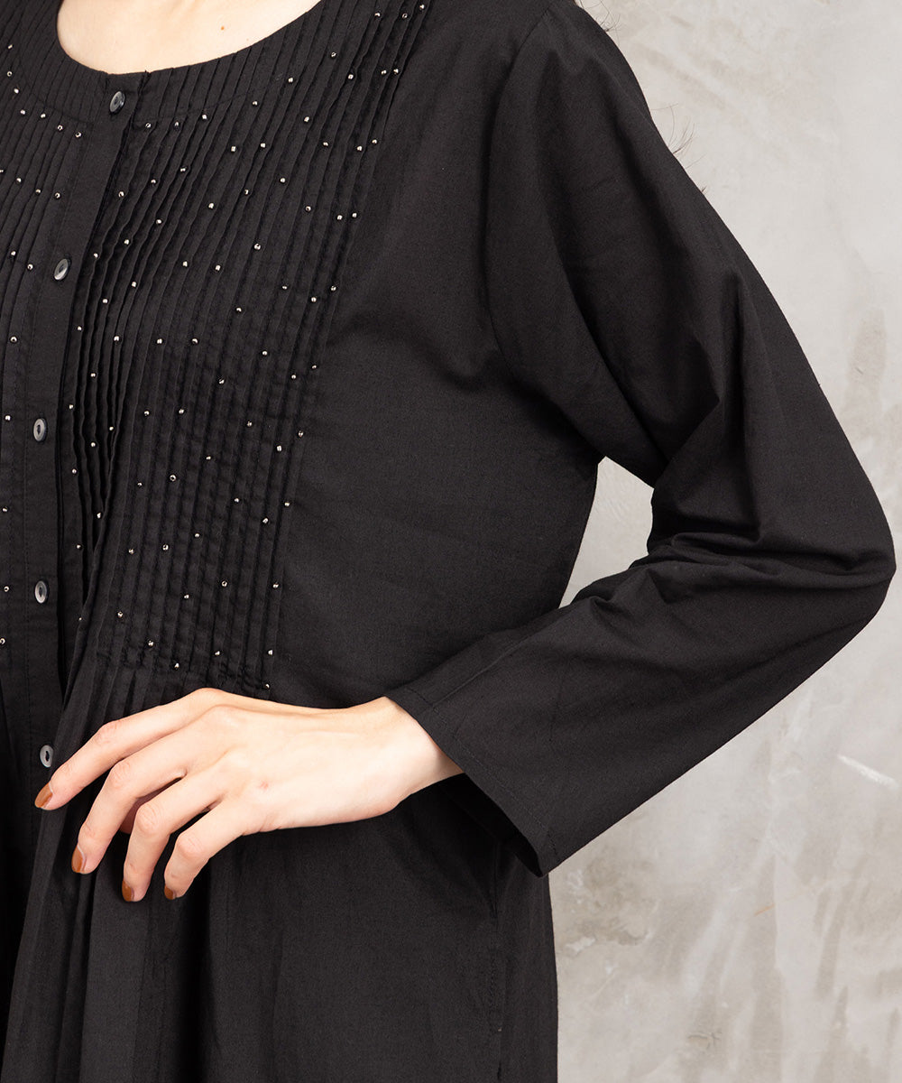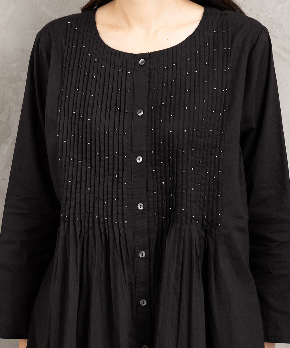 ・デザインポイント:ピンタック、ビーズ刺繍、前開きボタン