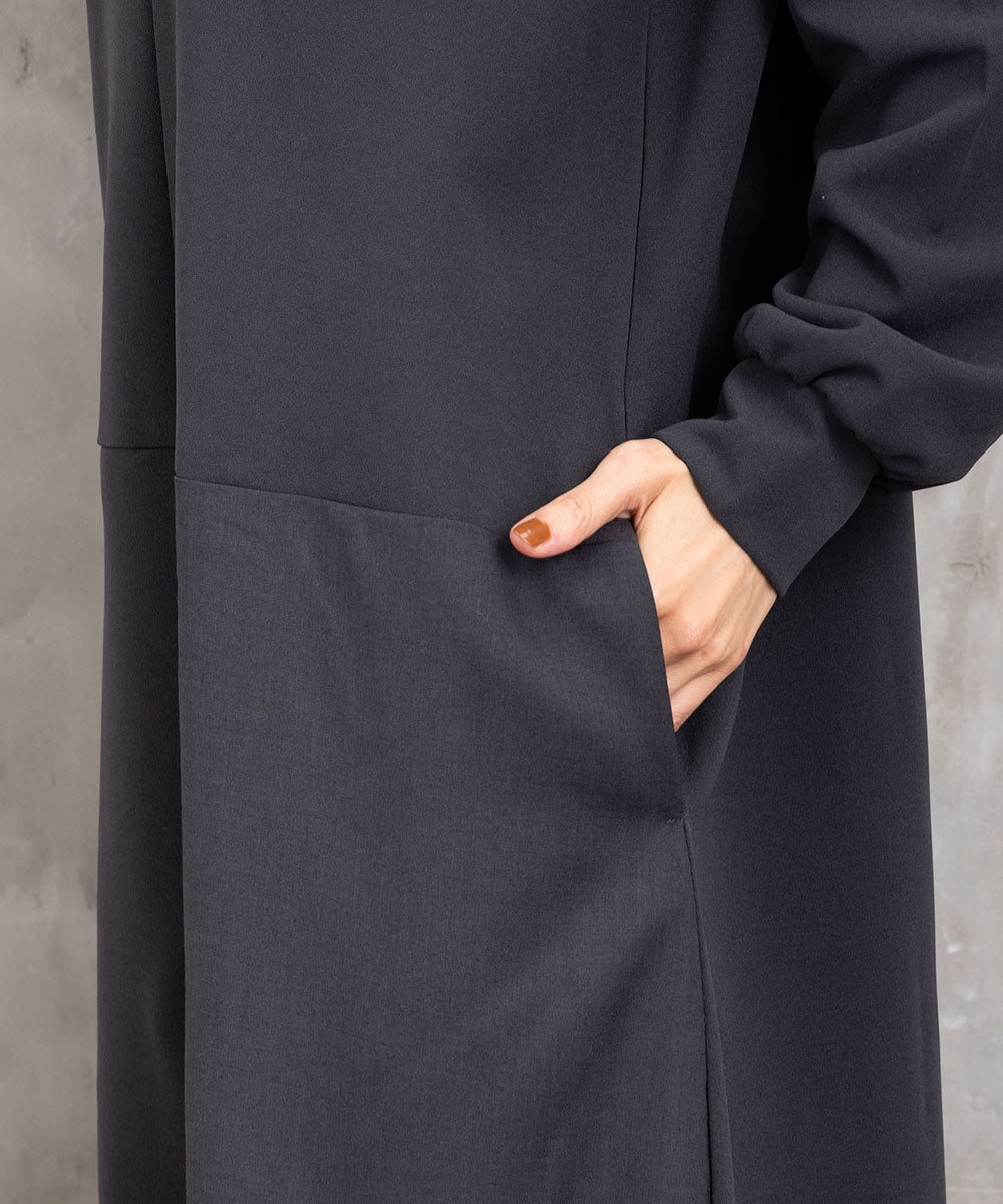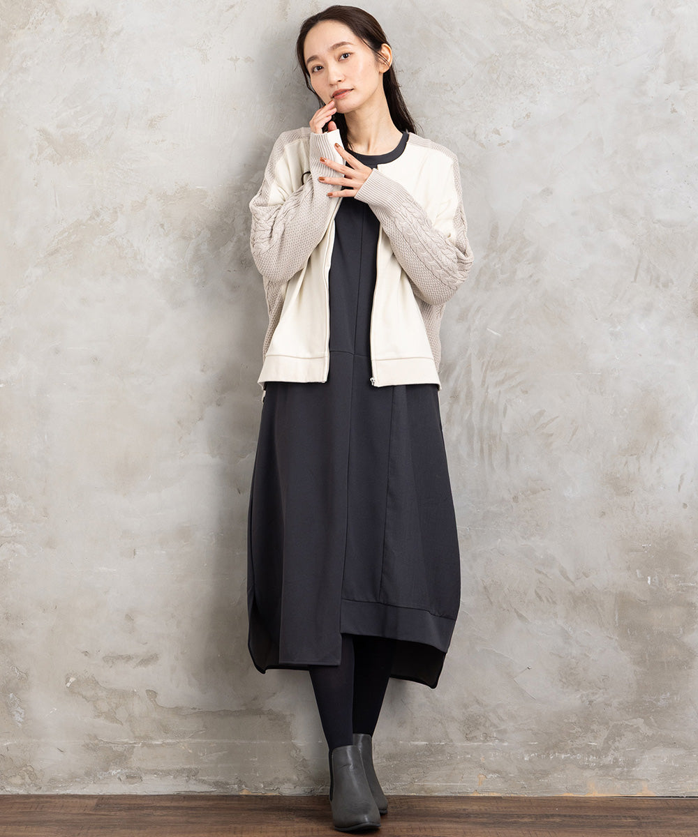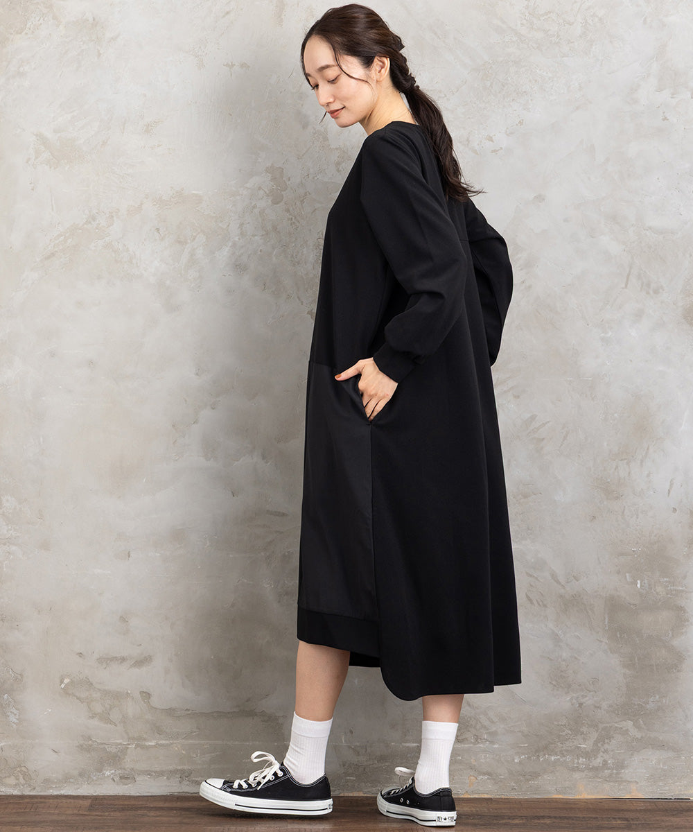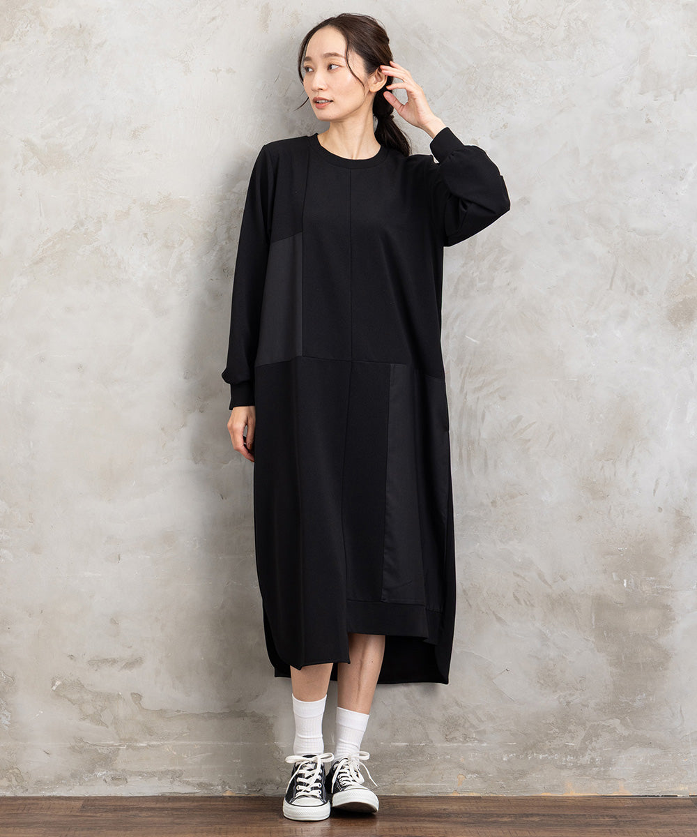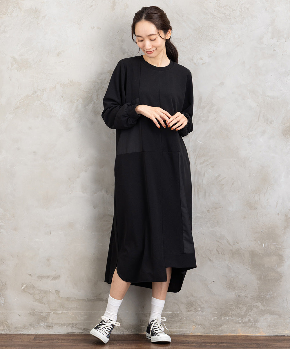 【動きのあるシルエット、異素材コンビアシメワンピース】