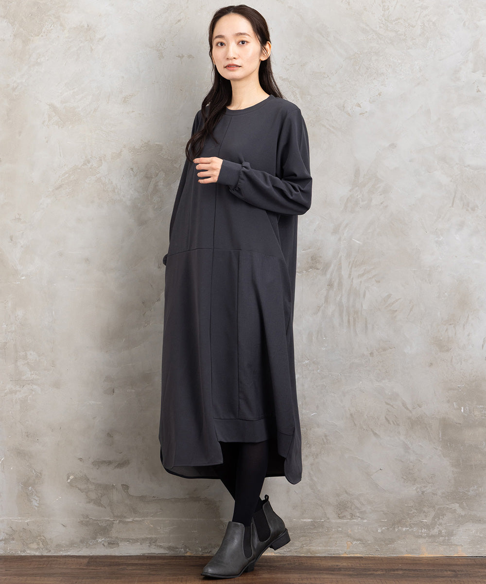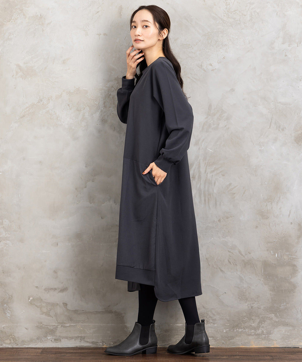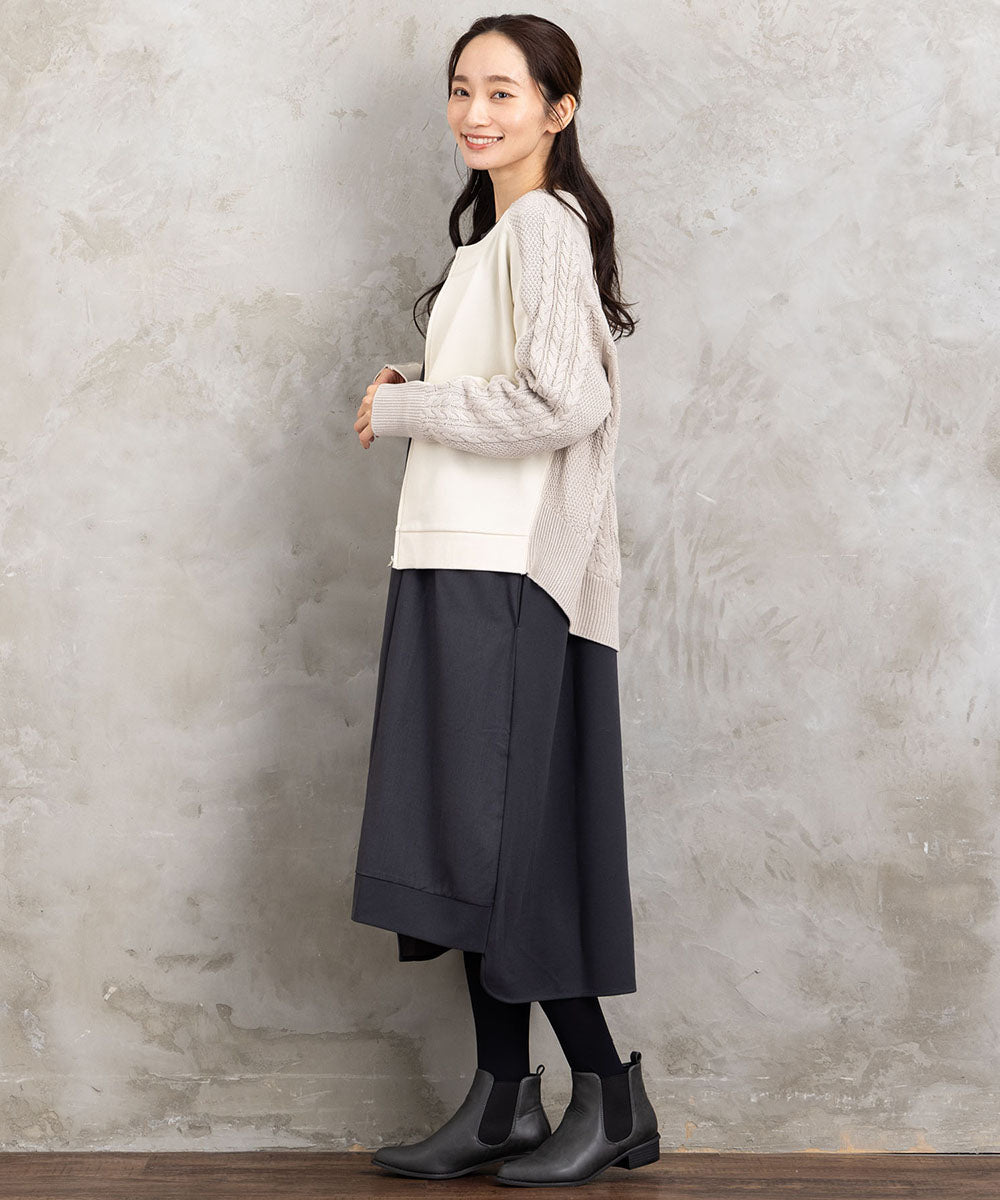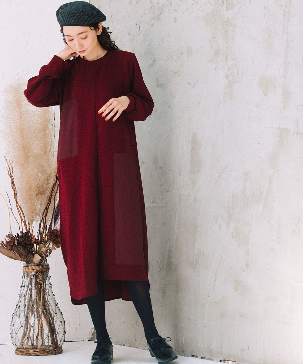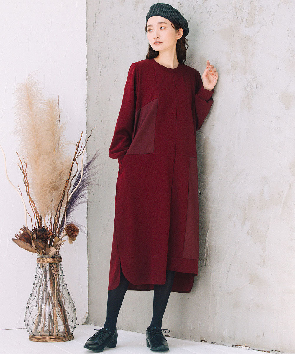 【動きのあるシルエット、異素材コンビアシメワンピース】