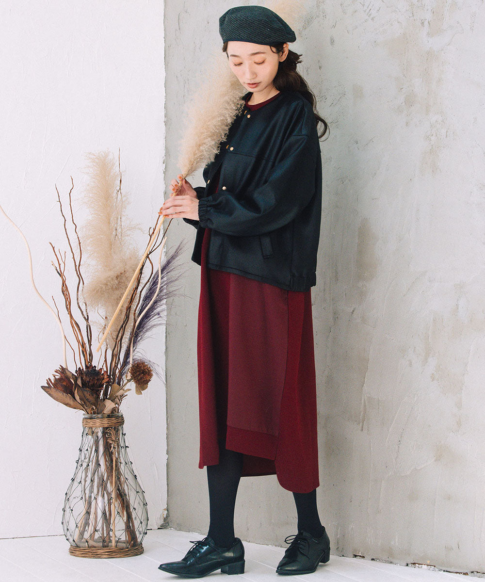 レギンスやスリムパンツを重ねれば、モード感のあるスタイリングに。