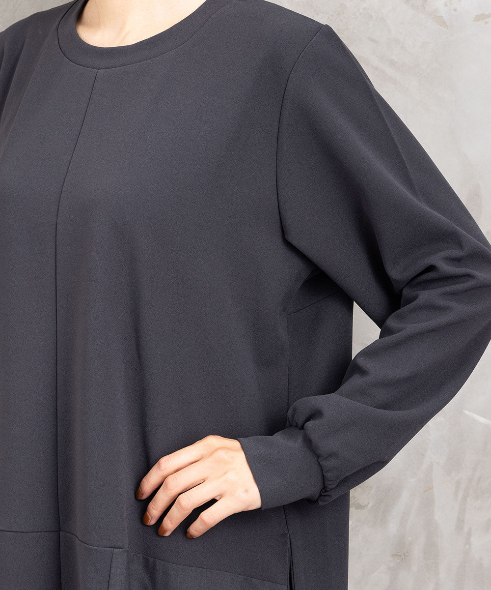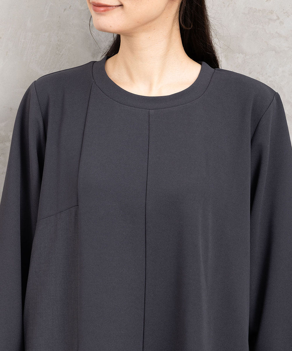 滑らかな素材とハリ感のある生地を切り替えた異素材デザイン。
