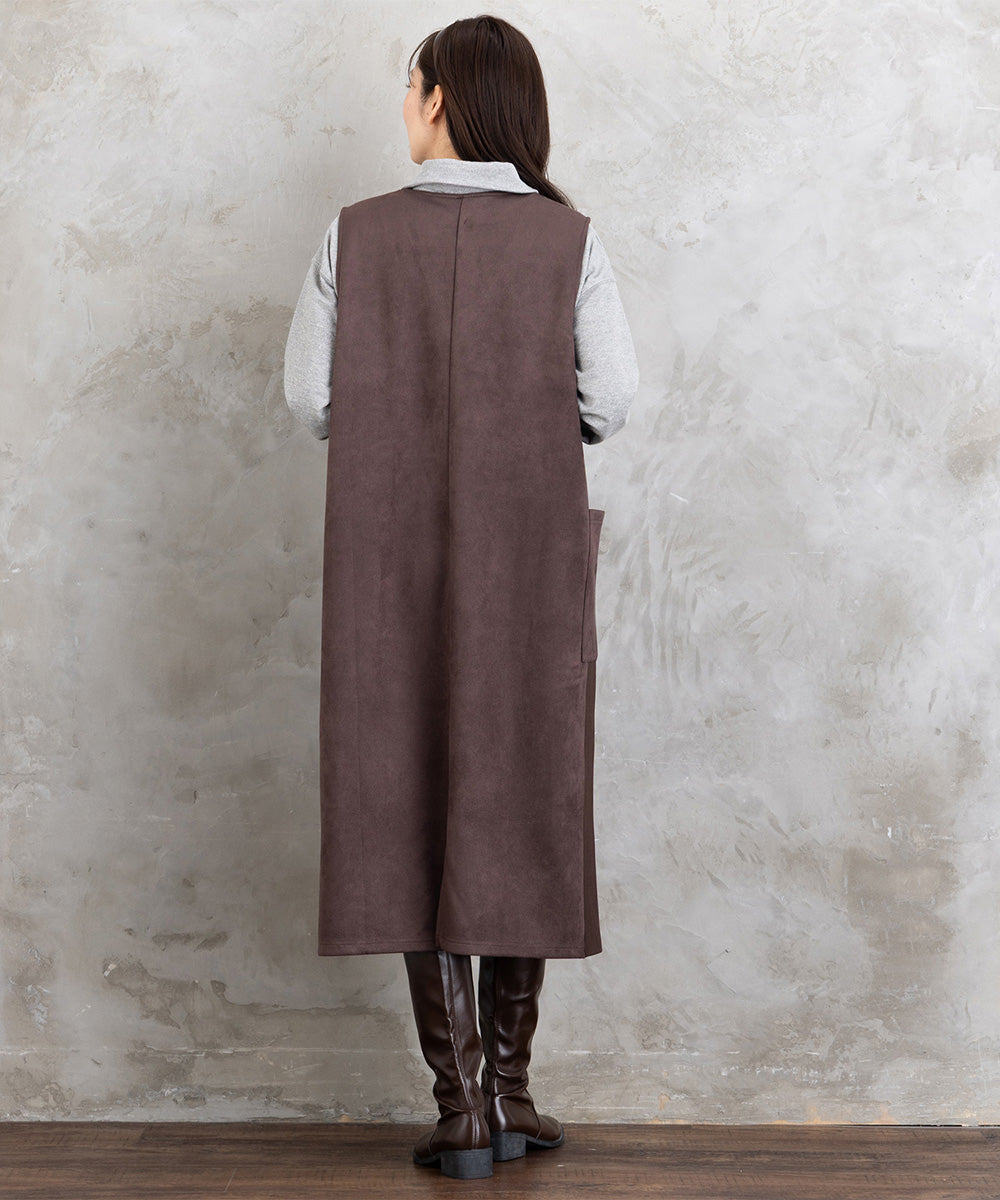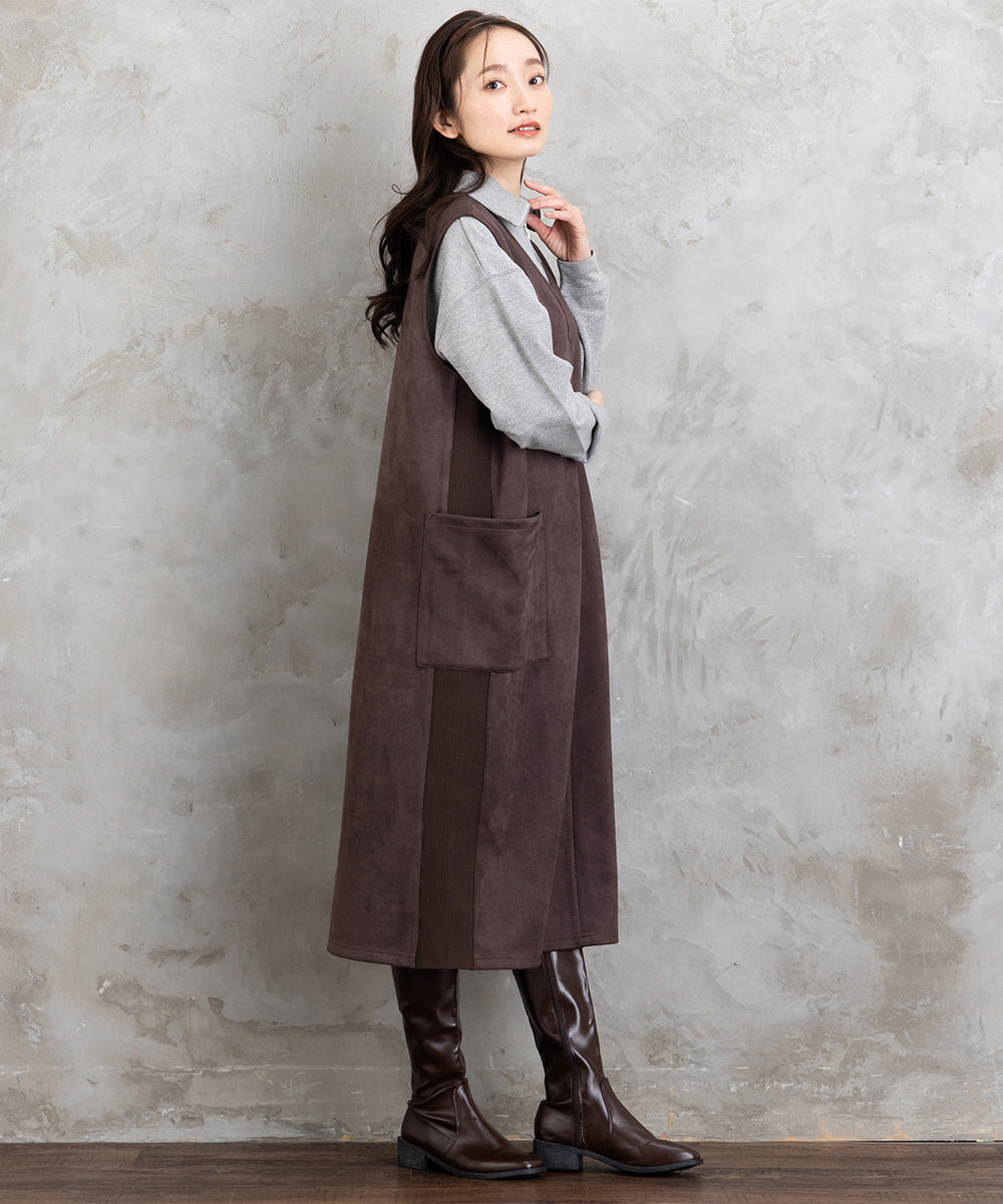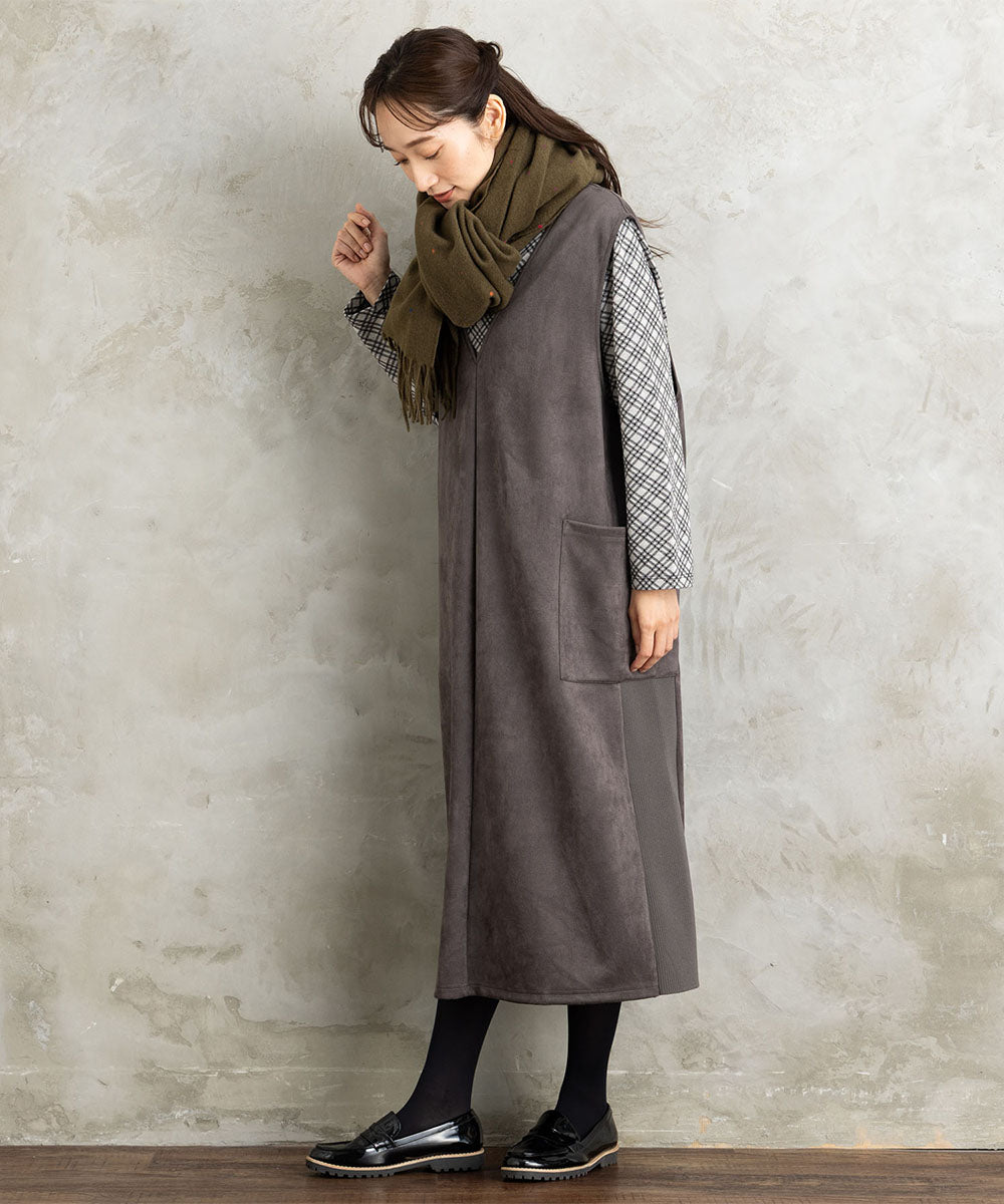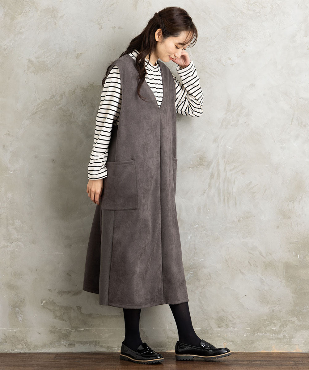 【柔らかく上品、マシュマロスウェードVネックジャンパースカート】