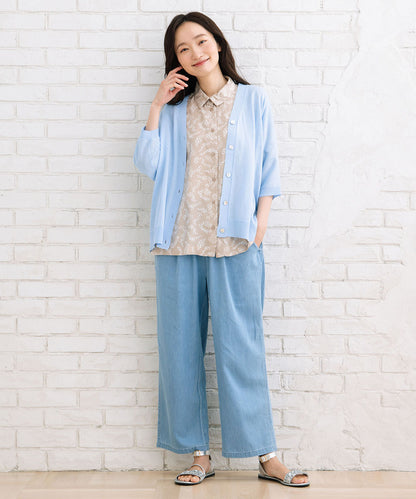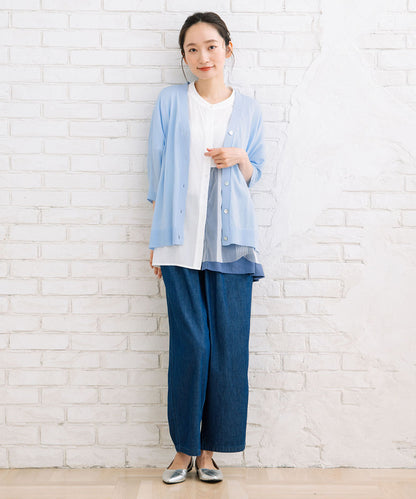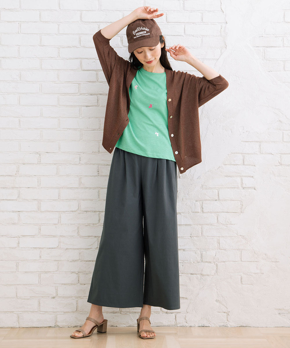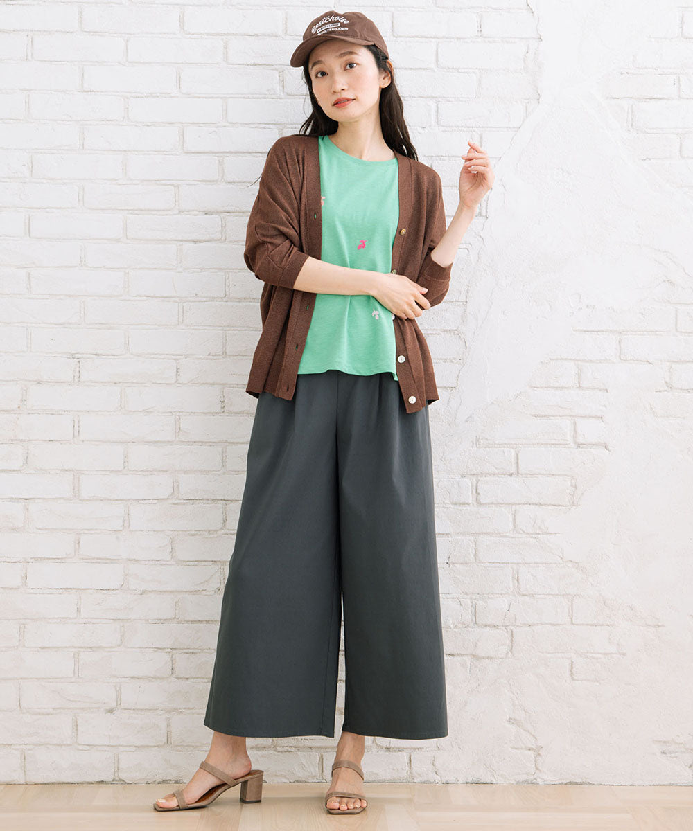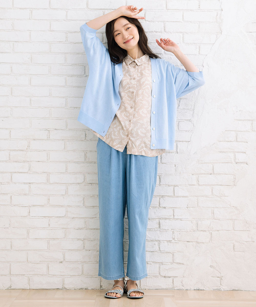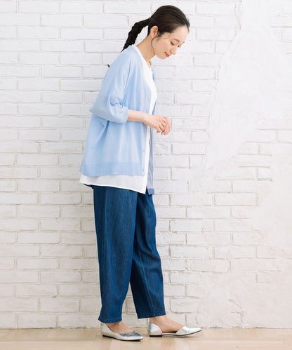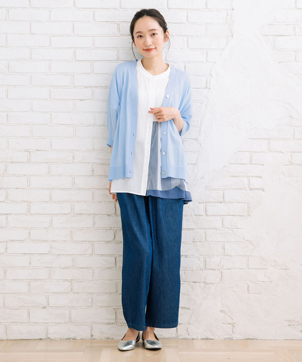 ギャザースカートからデニムなどカジュアルなパンツまで様々なスタイリングにはまる1枚です。