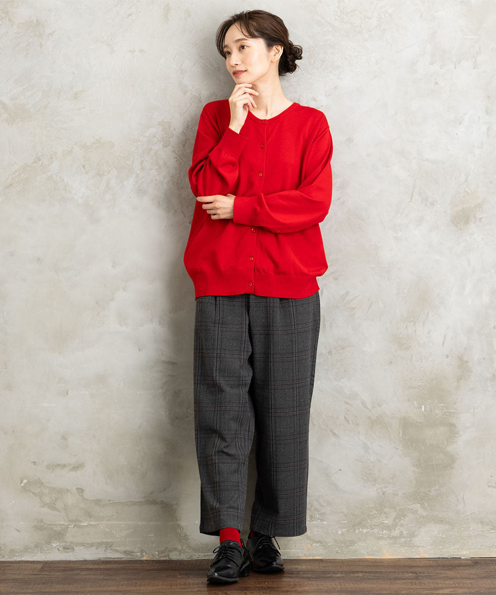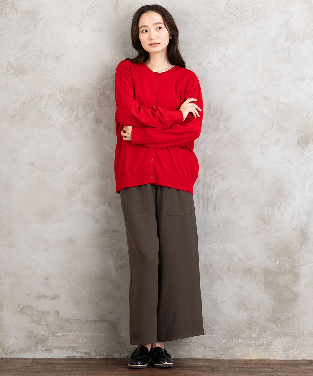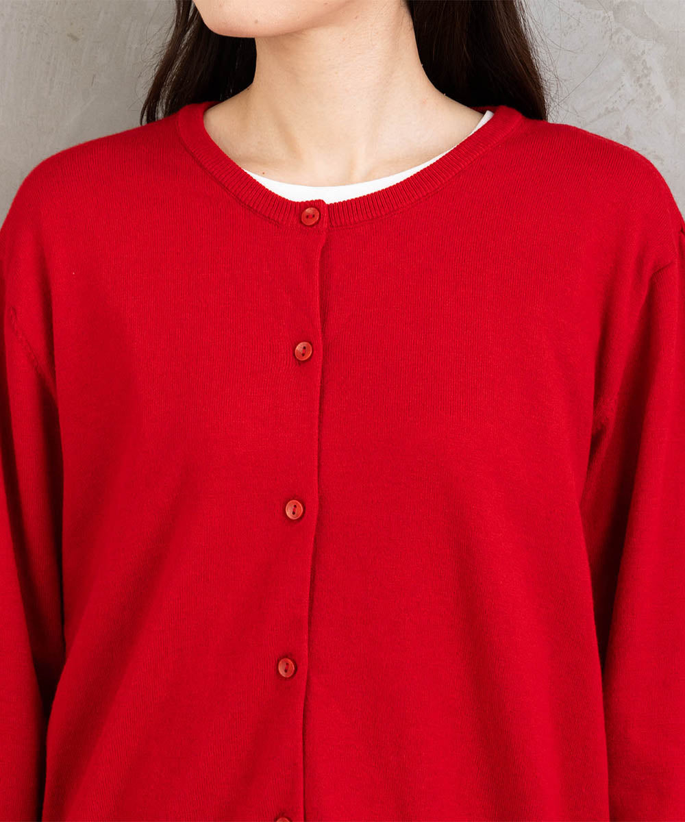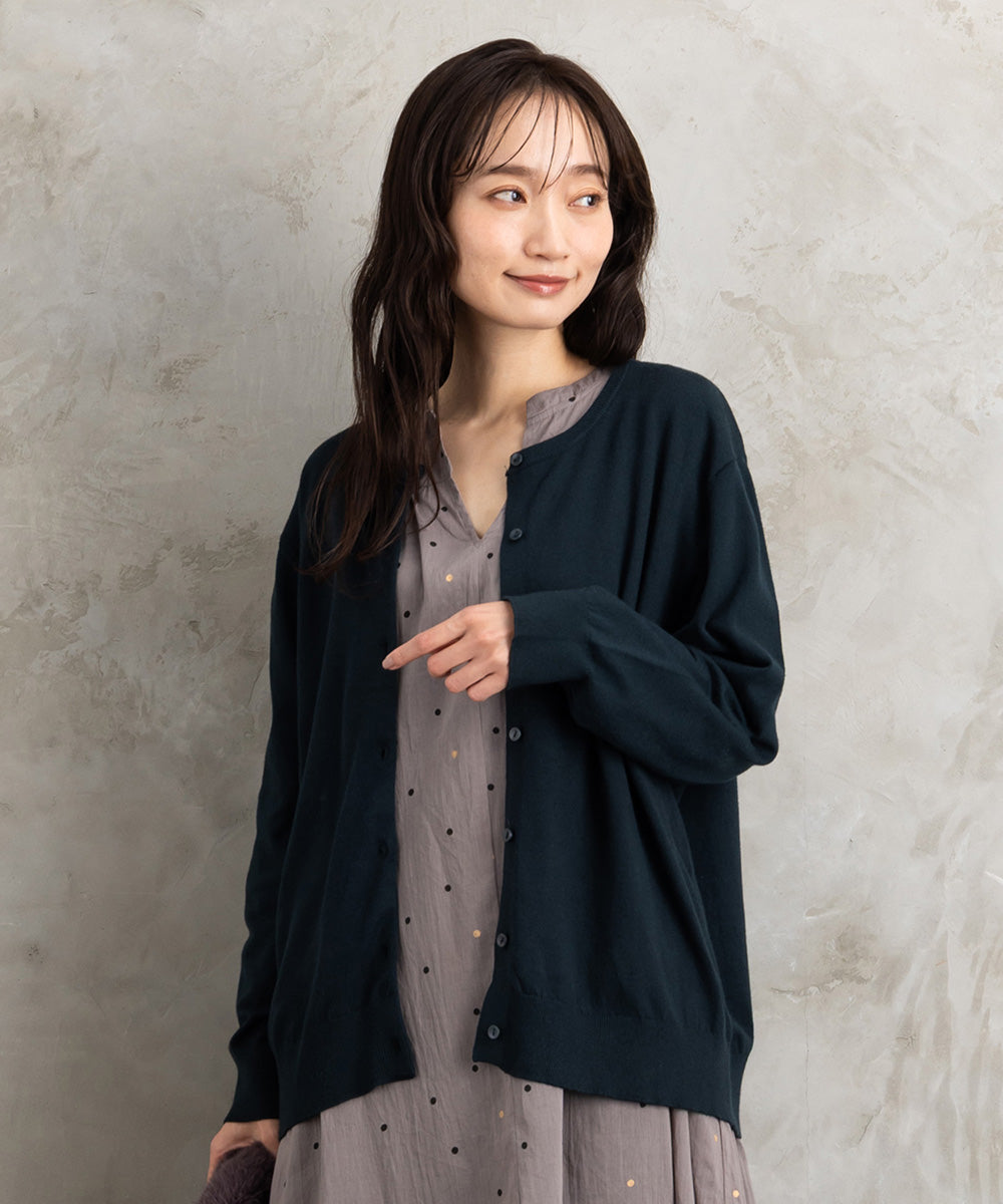 ベーシックなデザインで着回しやすいクルーネックカーディガン。