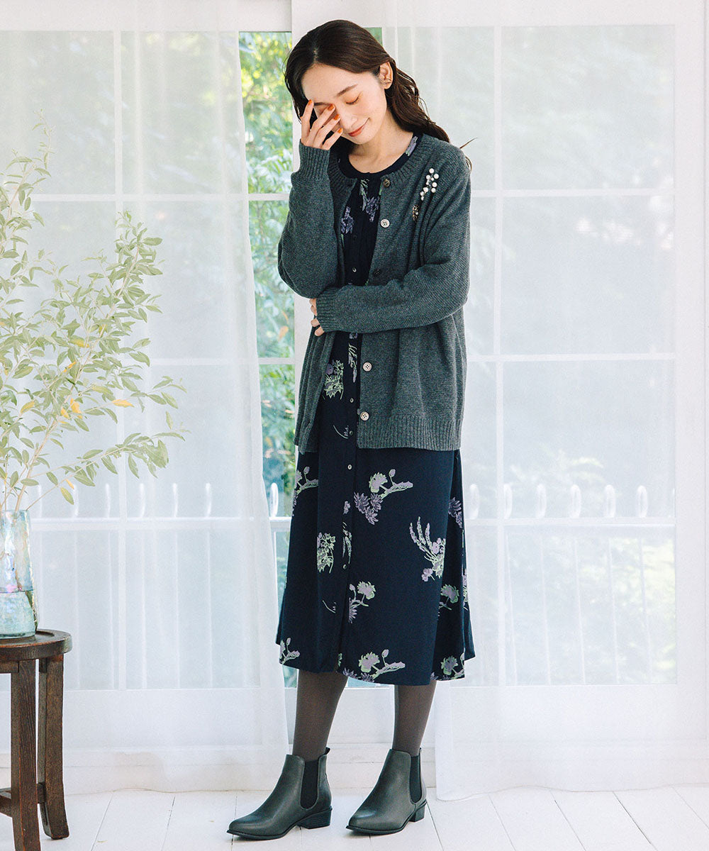 上品なビジューが胸元に輝く、アクセサリーいらずの主役カーディガン。