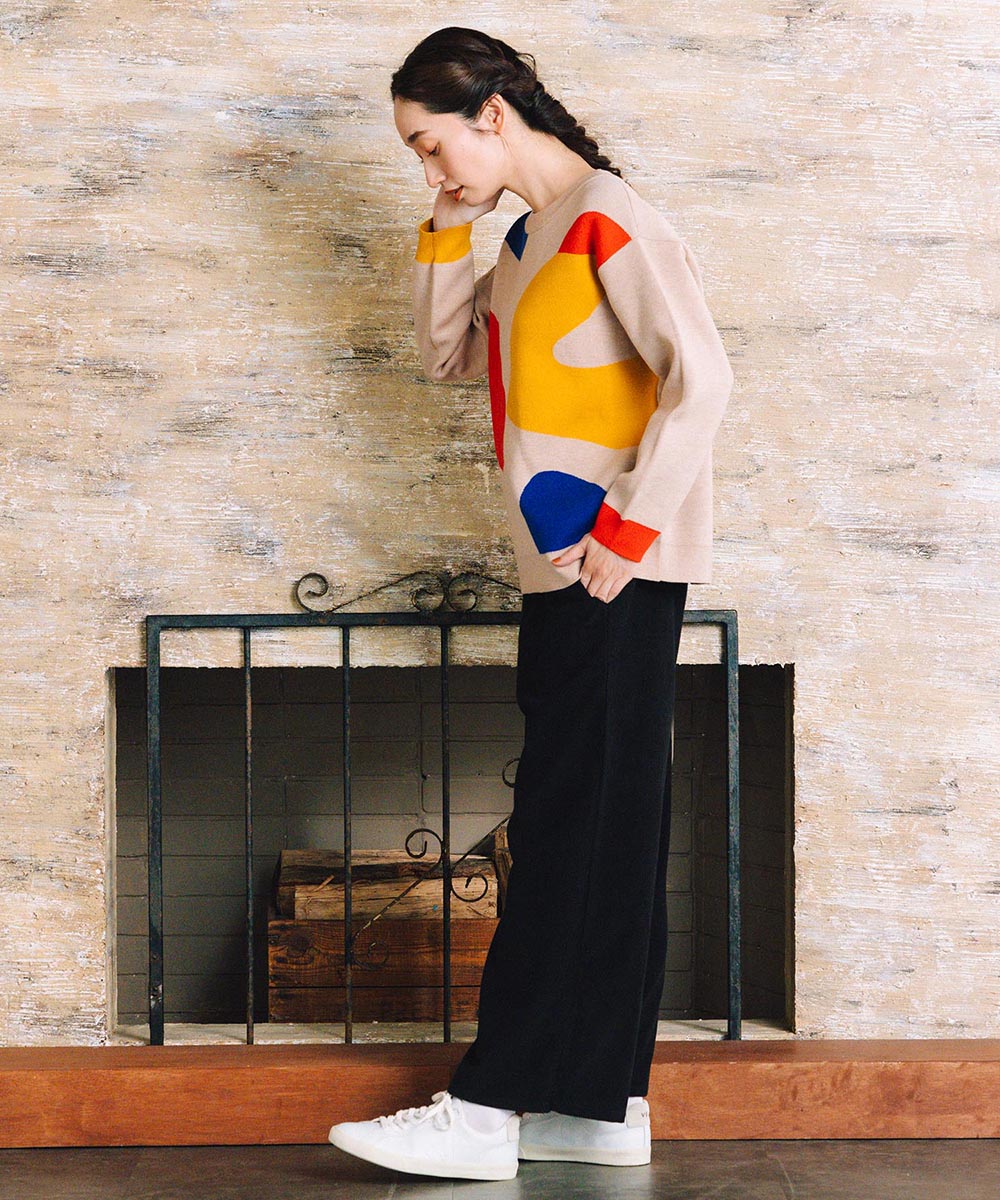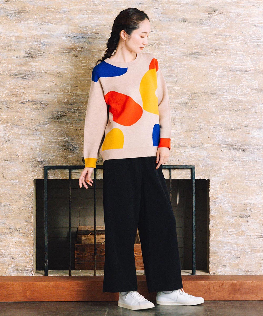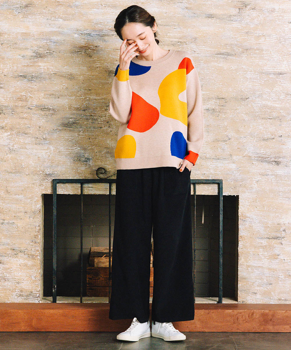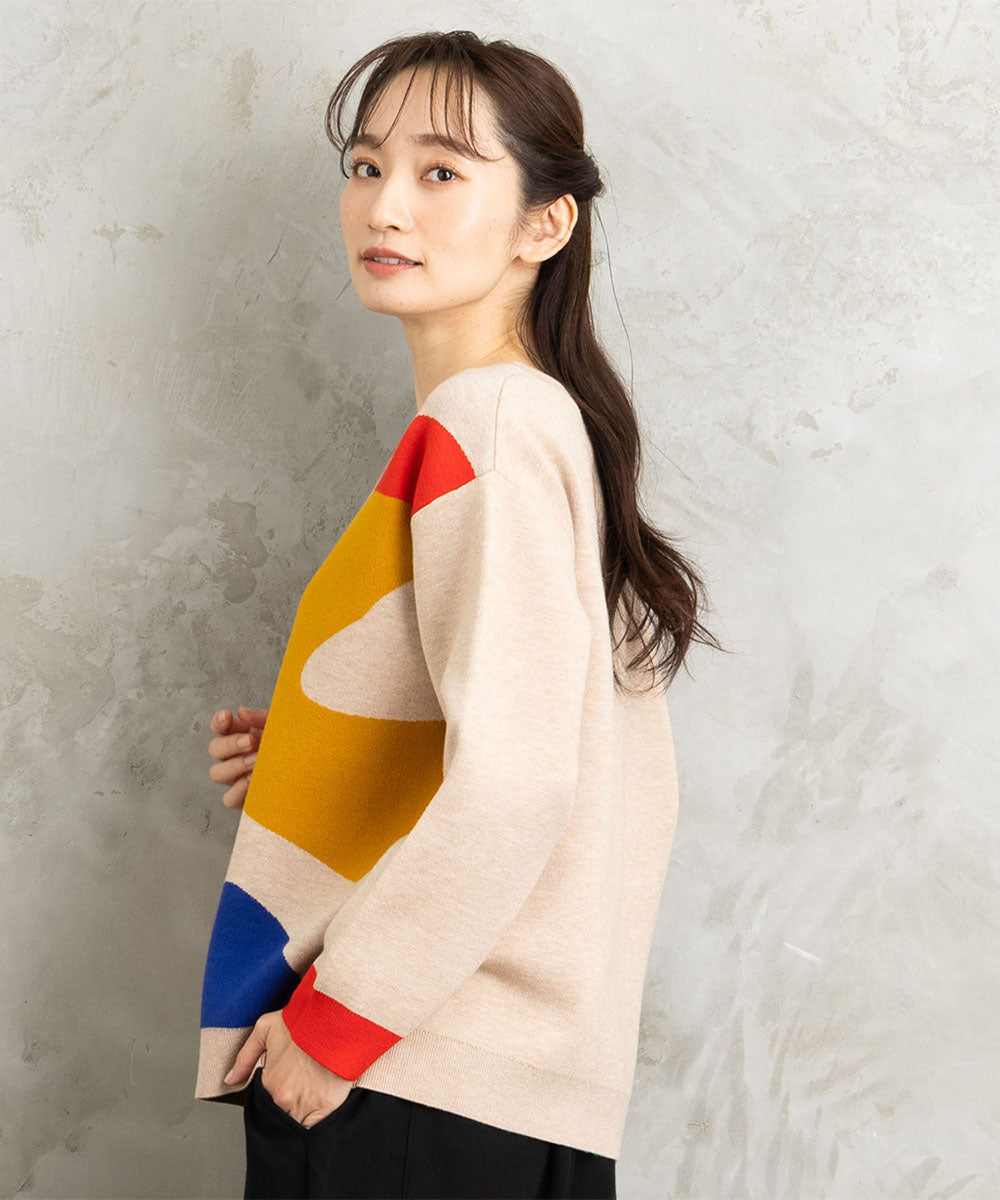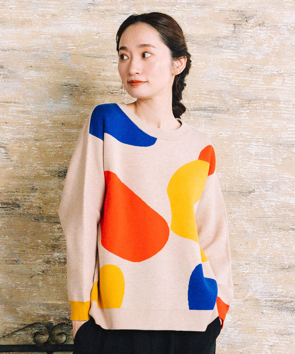 大胆なペイントタッチのカラーが目を惹く、アート感のあるニット。