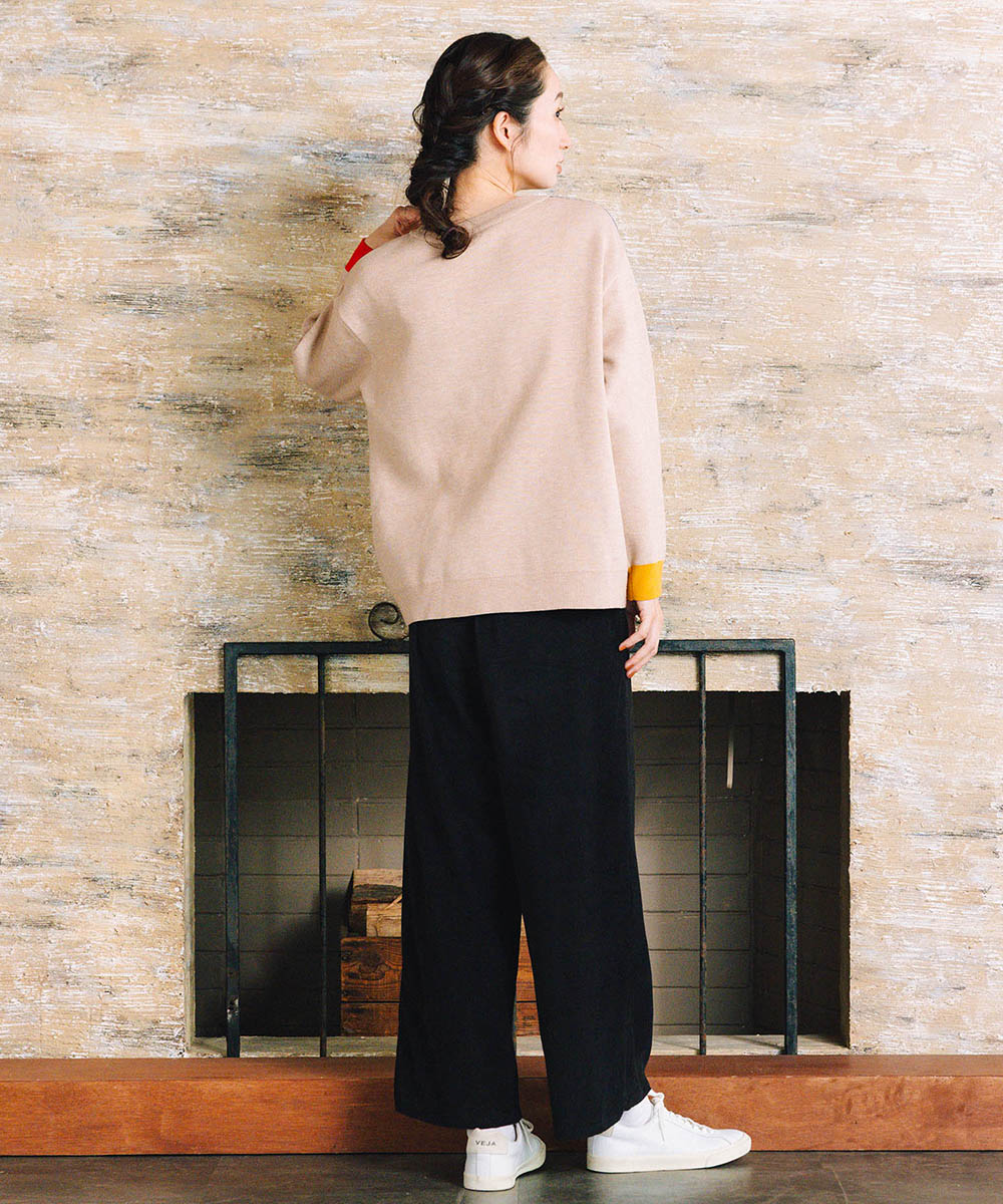 シンプルなデニムやワイドパンツを合わせて、主役ニットとしてコーディネート。