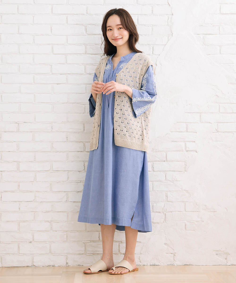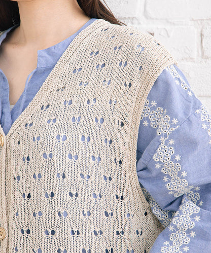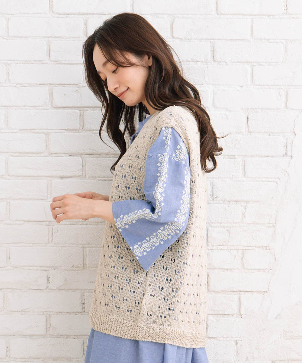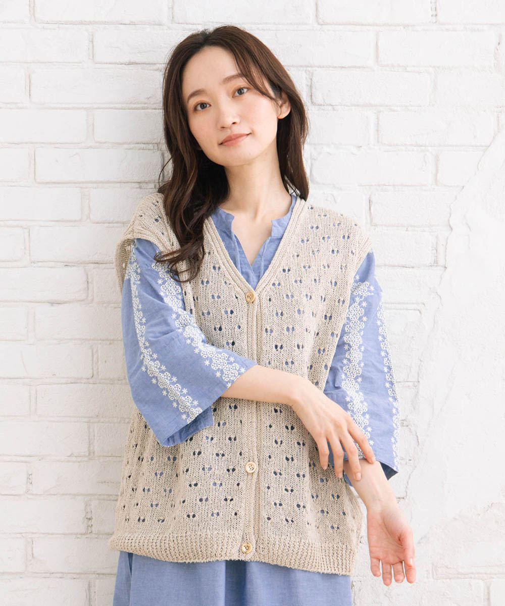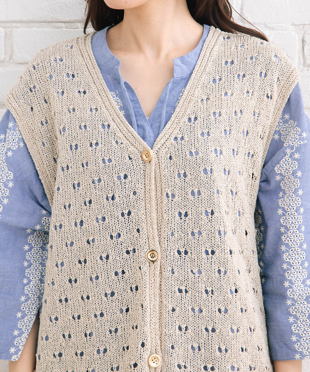 繊細なアイレット編みが、上品で女性らしい印象を与えます。
