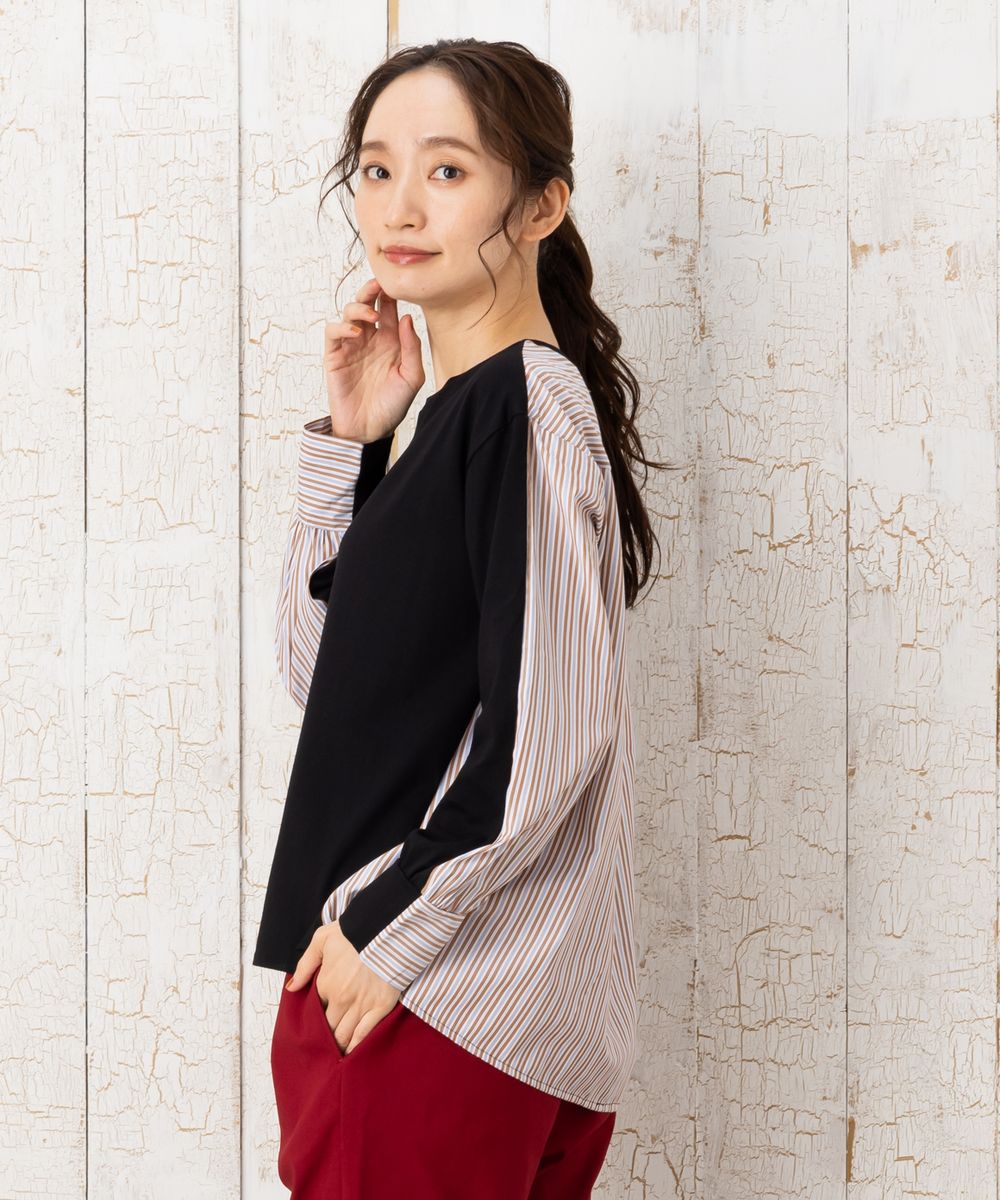 前身頃と袖部分は柔らかな天竺生地、後身頃はストライプの布帛生地を使用しています。