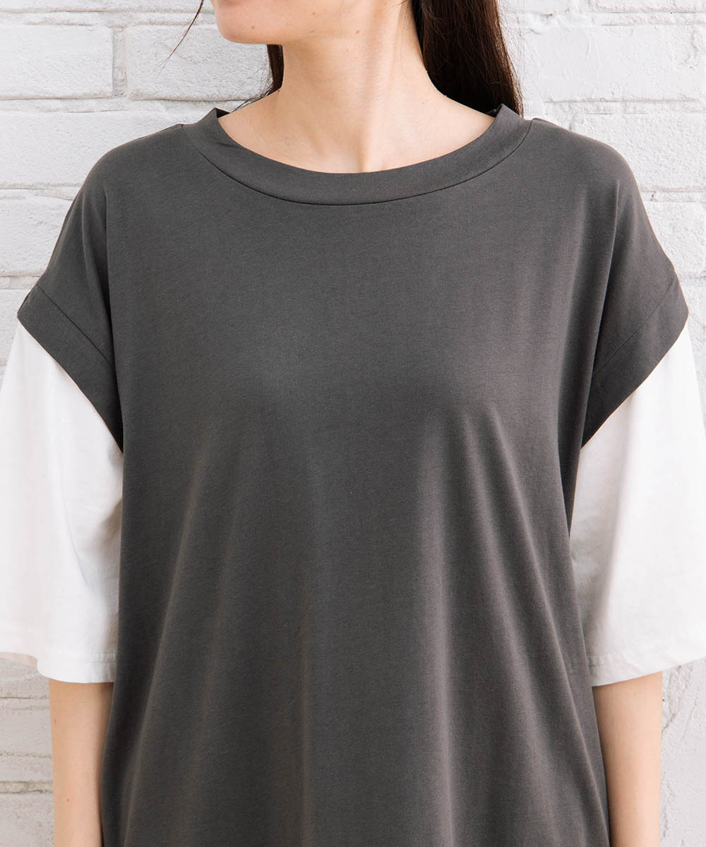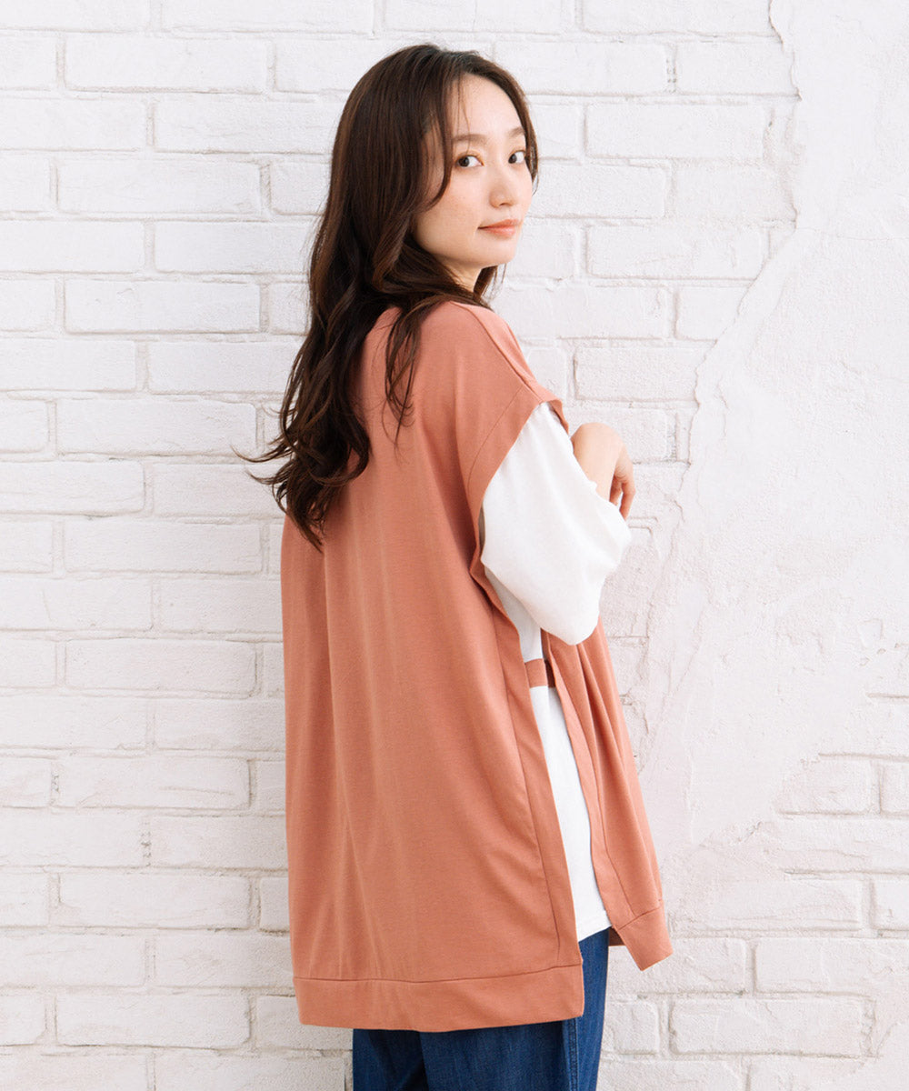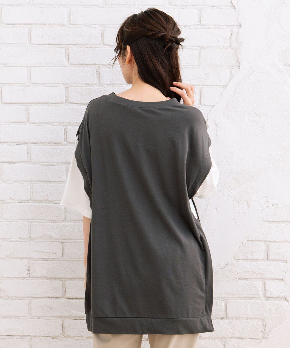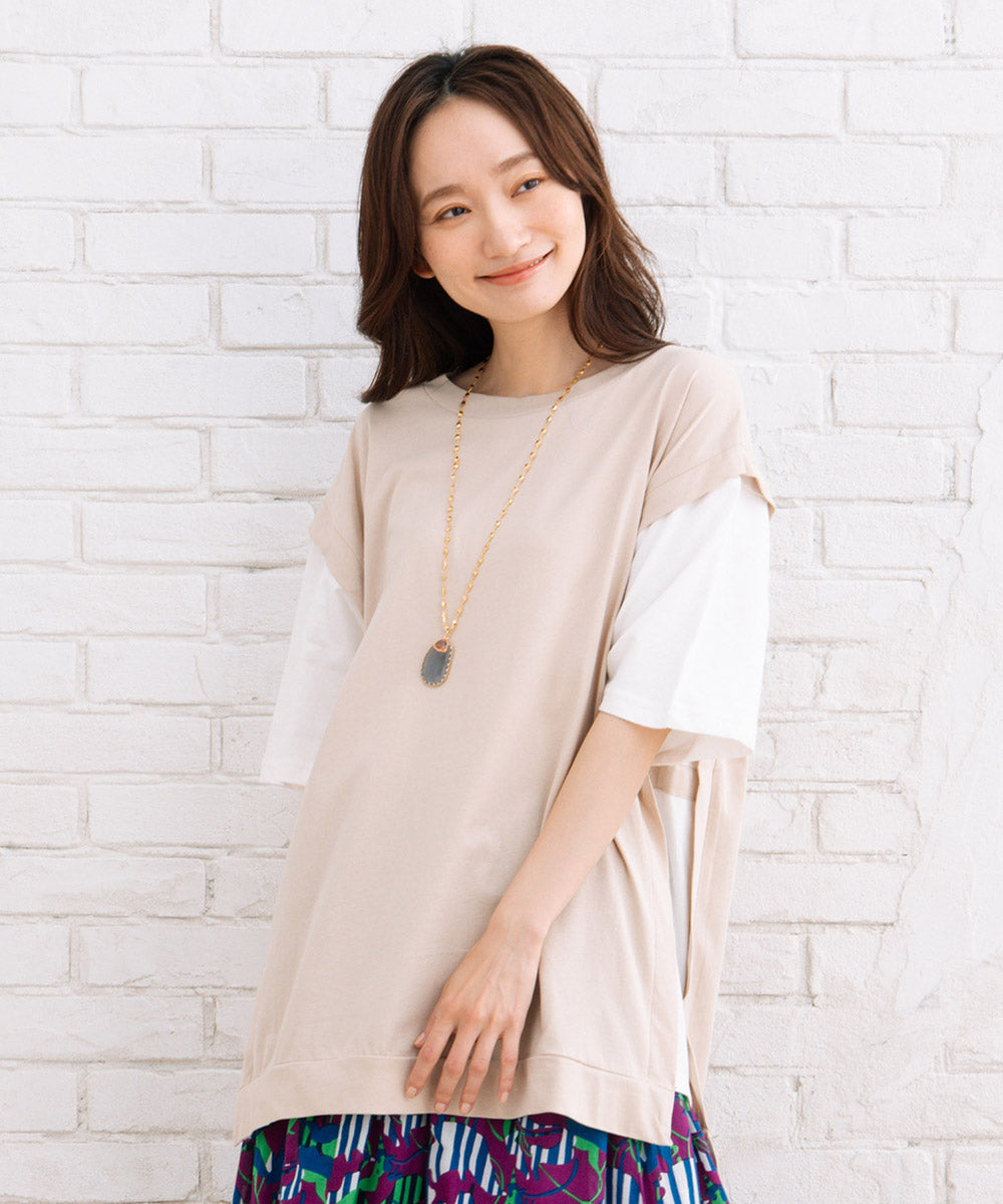まるでTシャツにベストを重ね着しているような、おしゃれなレイヤード風なアイテムです。