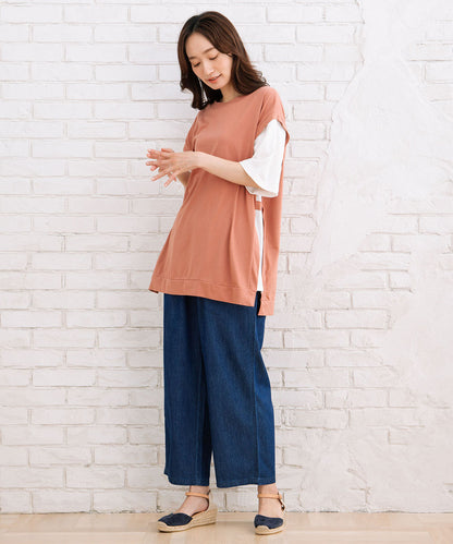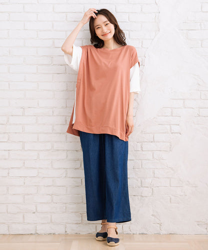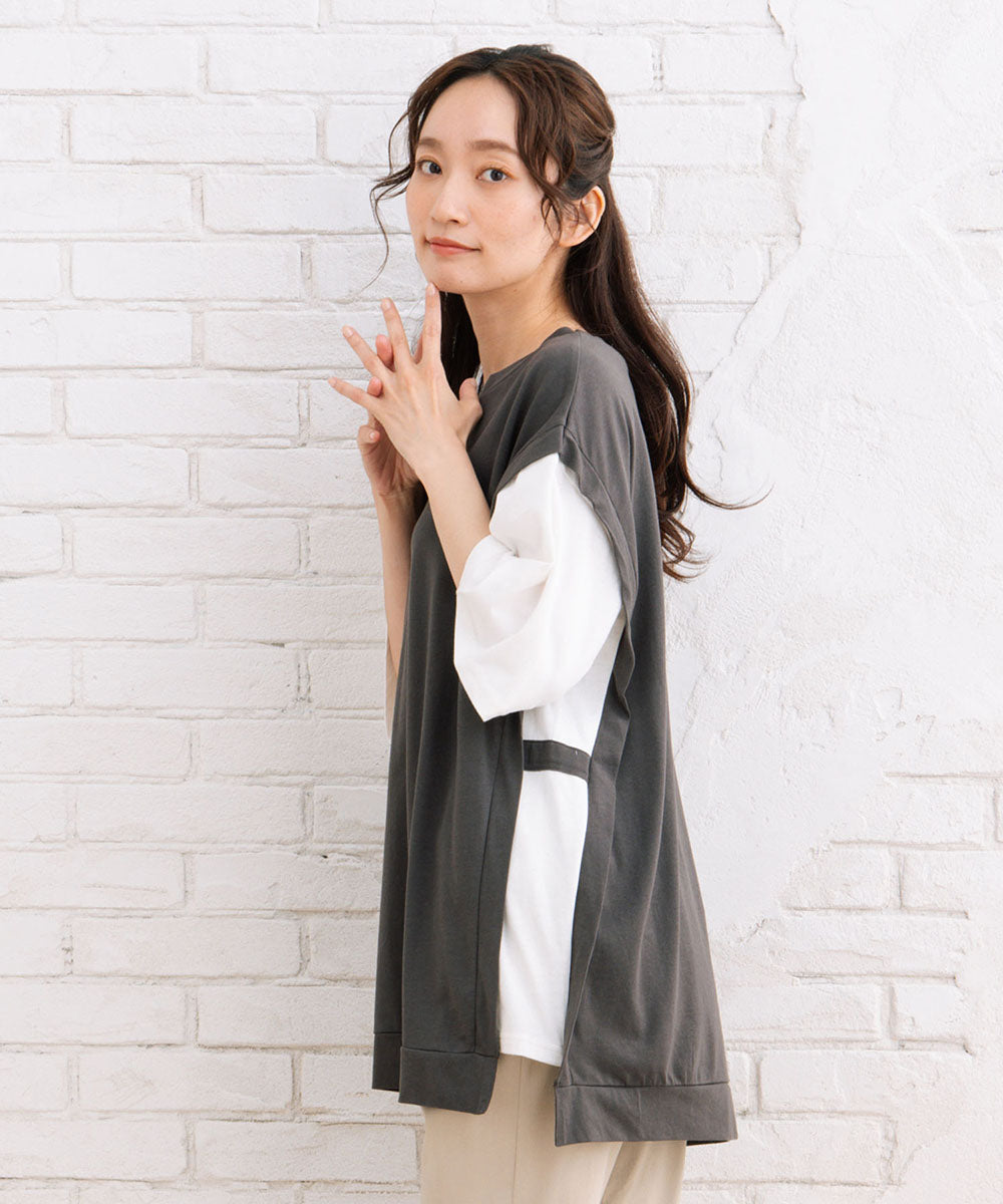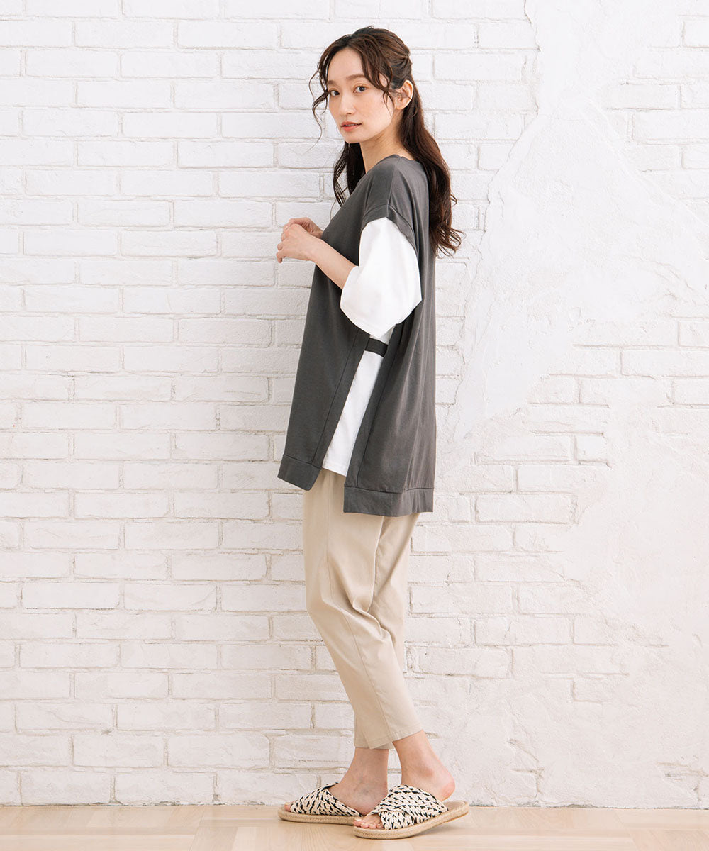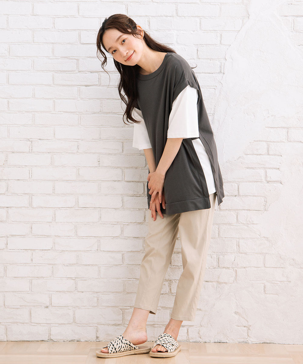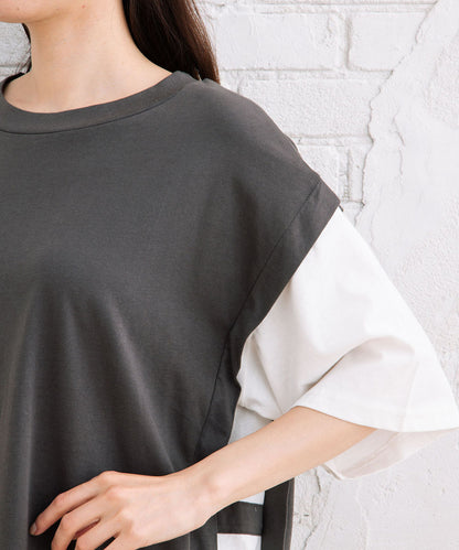まるでTシャツにベストを重ね着しているような、おしゃれなレイヤード風なアイテムです。