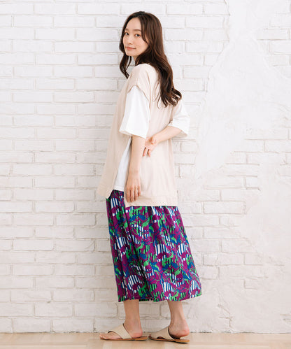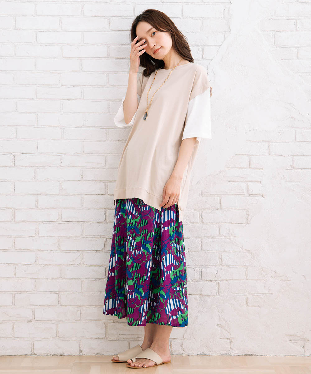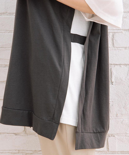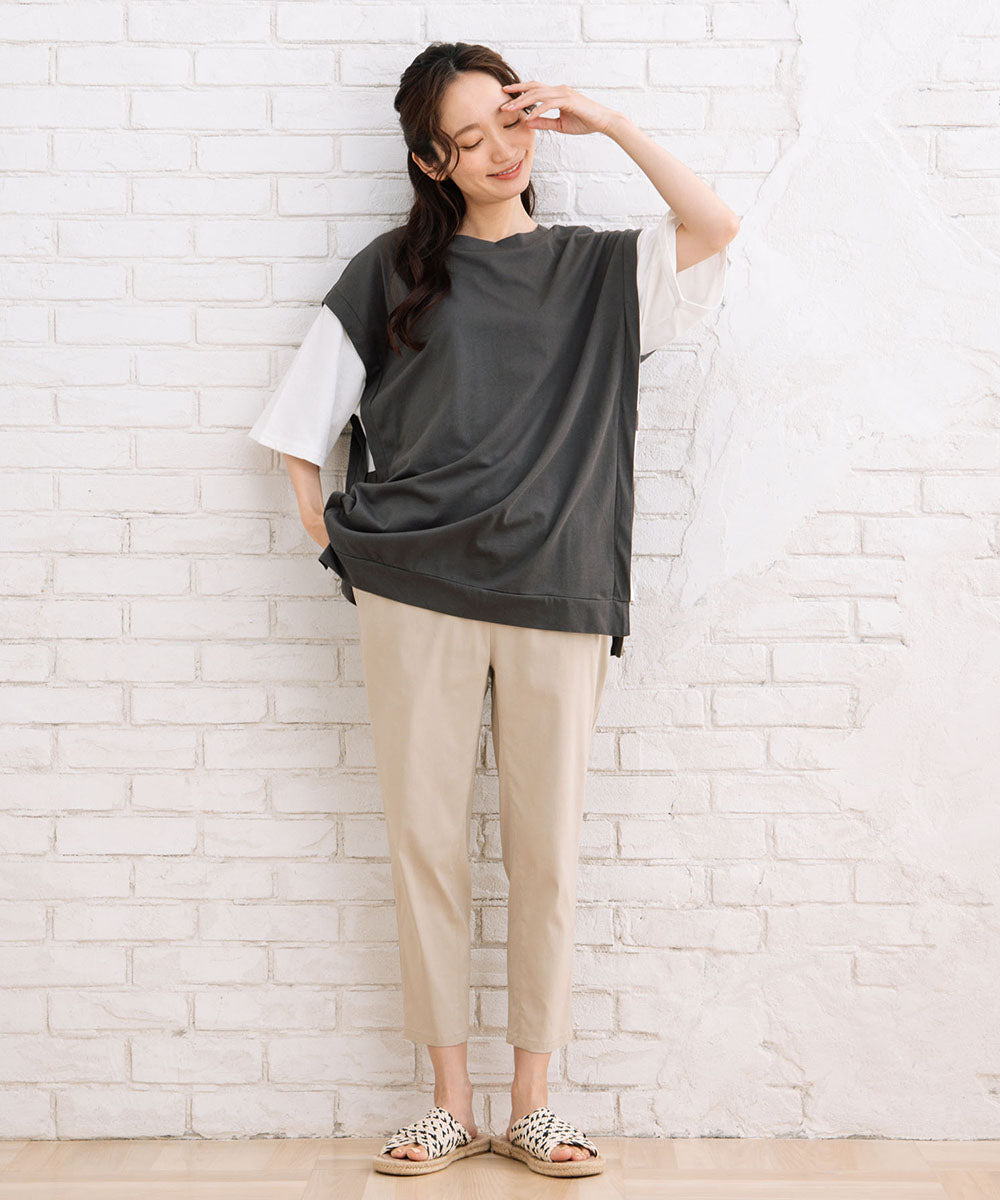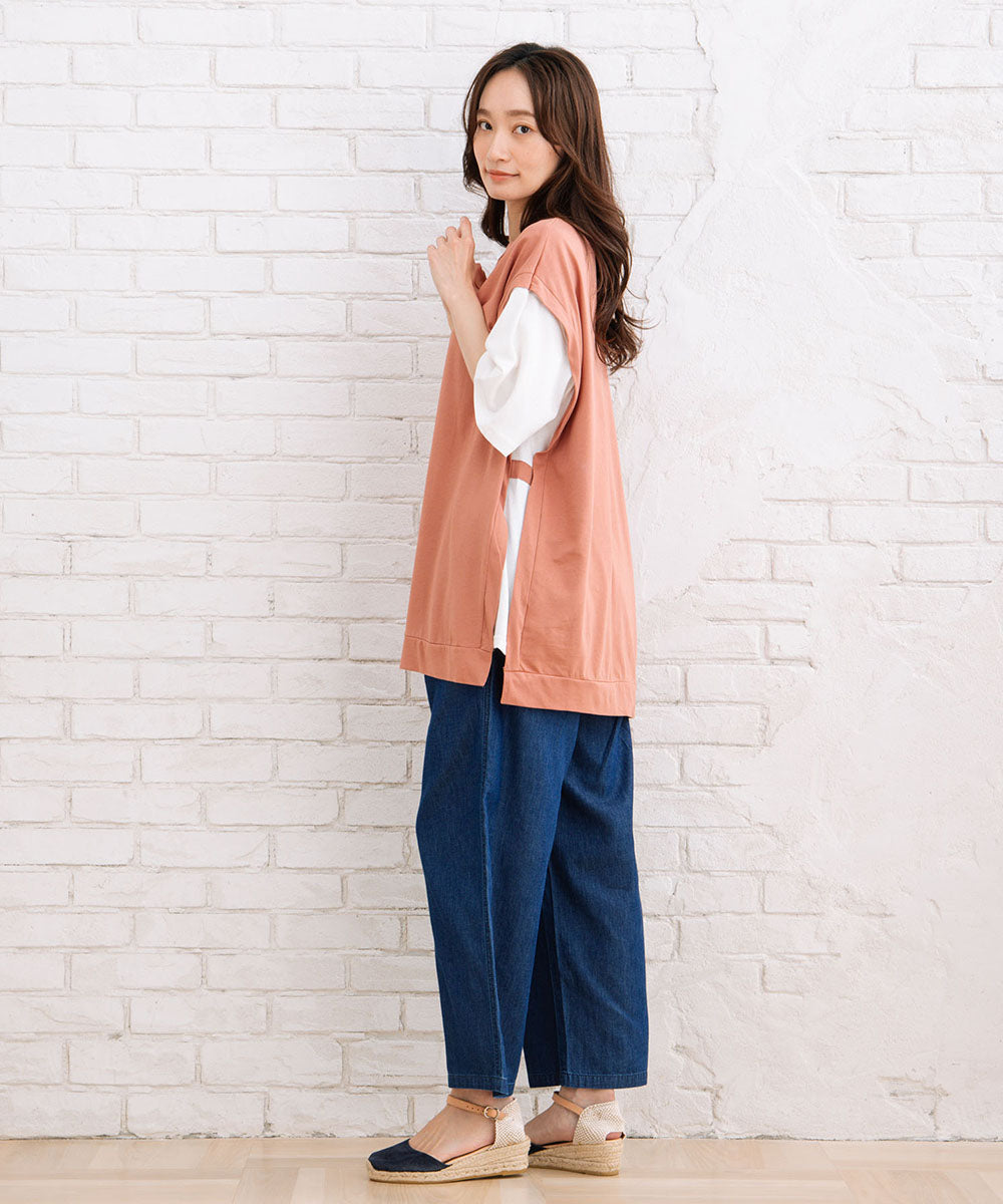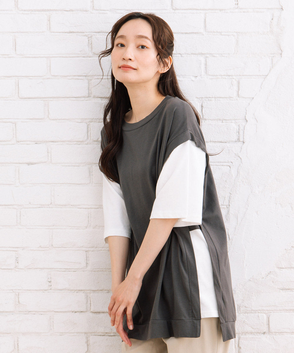 まるでTシャツにベストを重ね着しているような、おしゃれなレイヤード風なアイテムです。