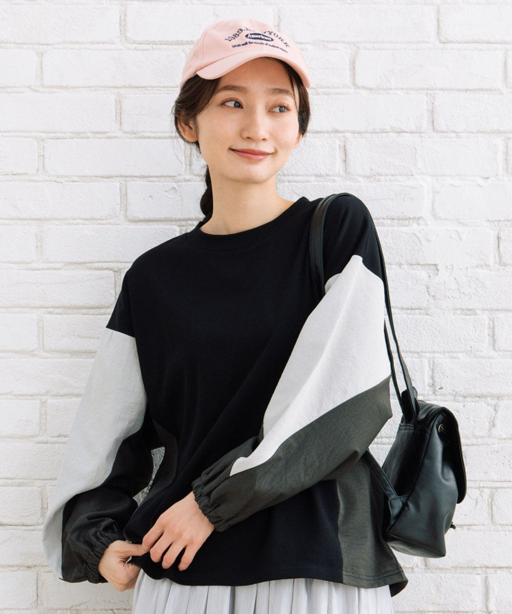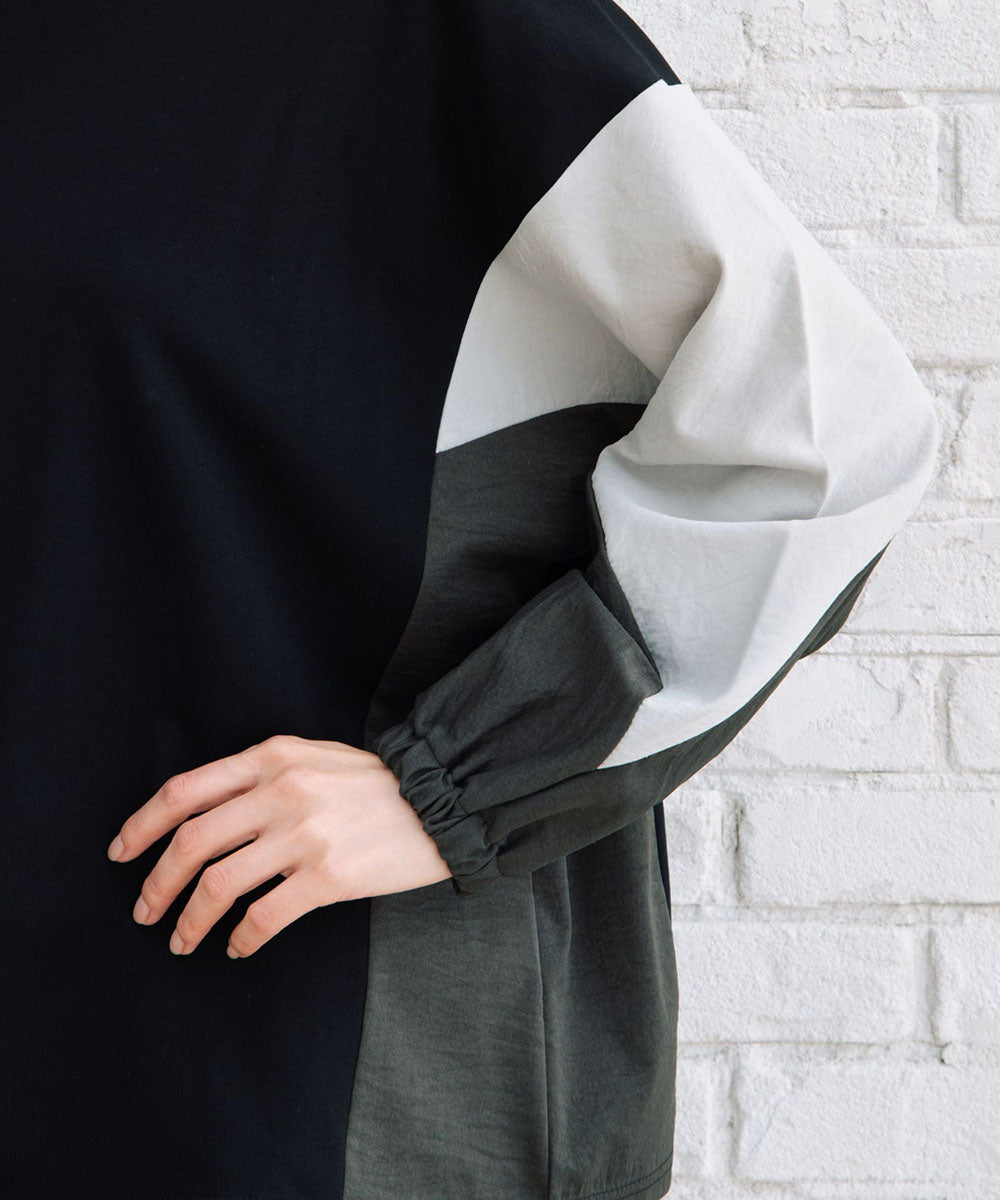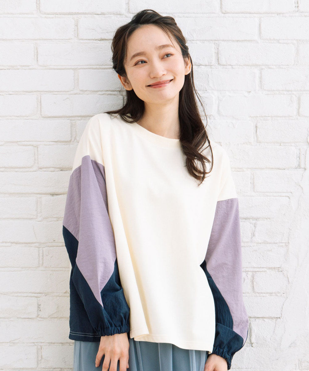袖の異素材切り替えがアクセントのブロッキングスウェット。