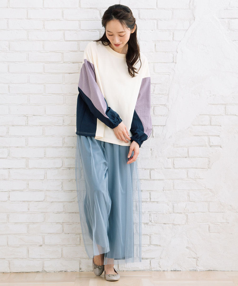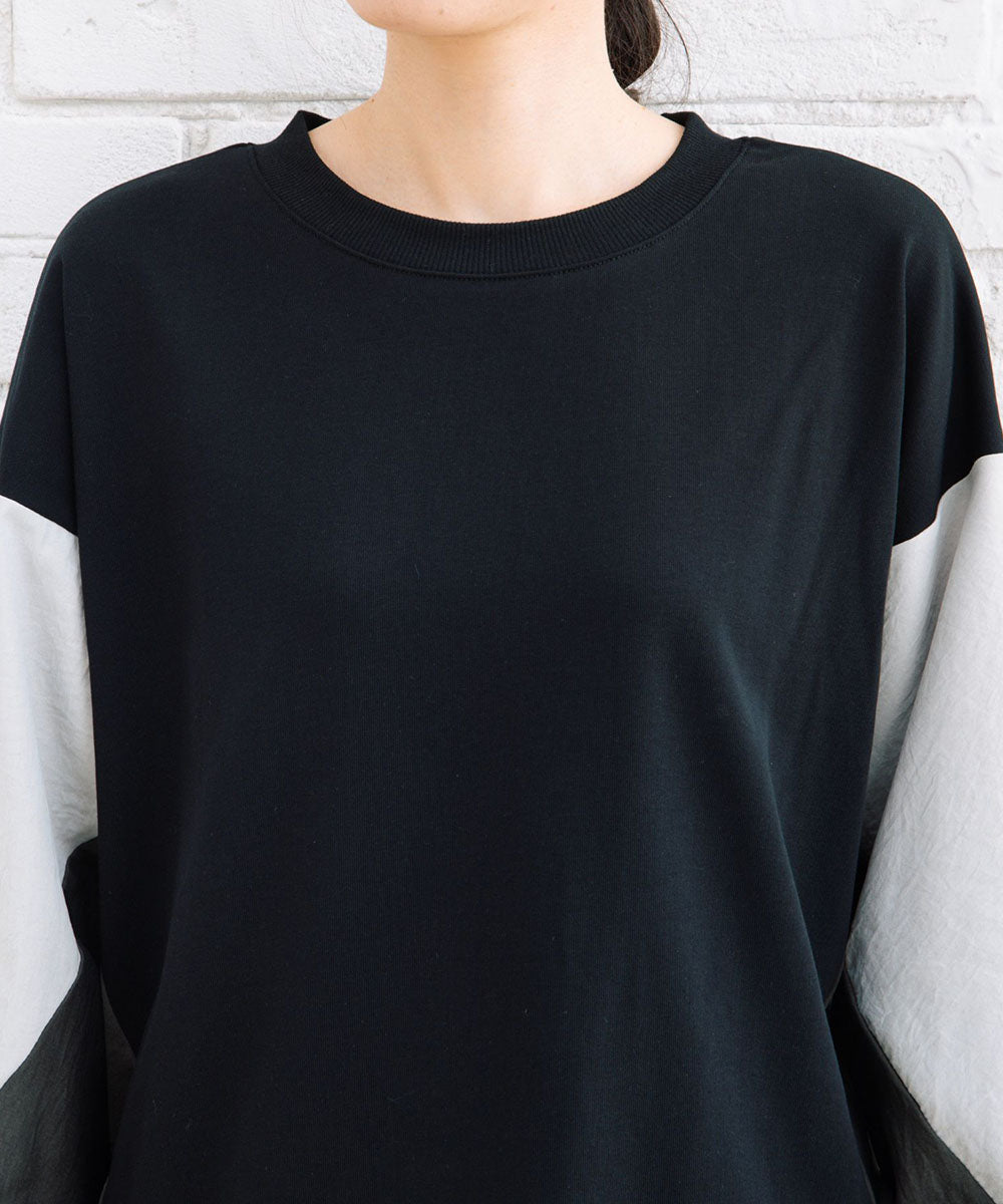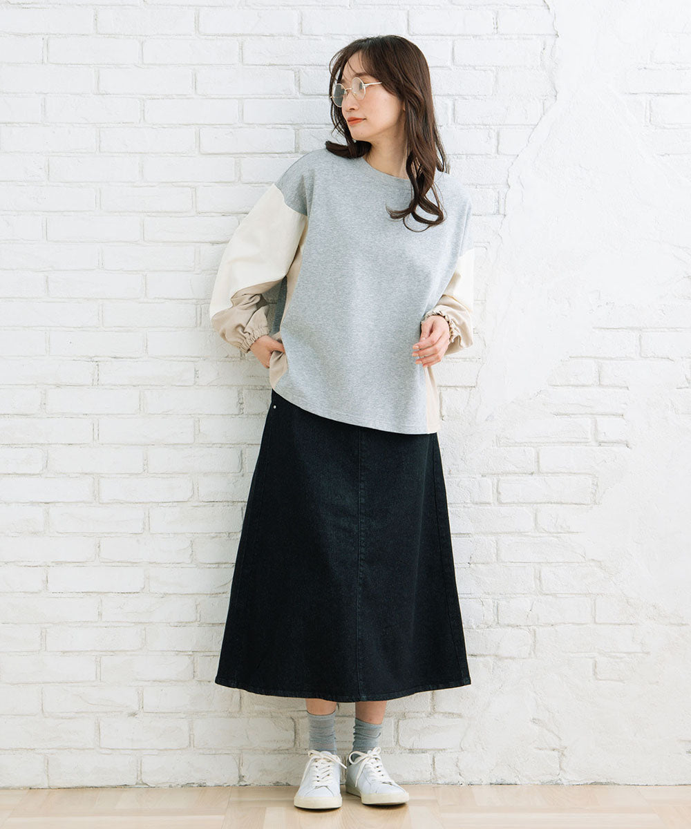 袖の異素材切り替えがアクセントのブロッキングスウェット。