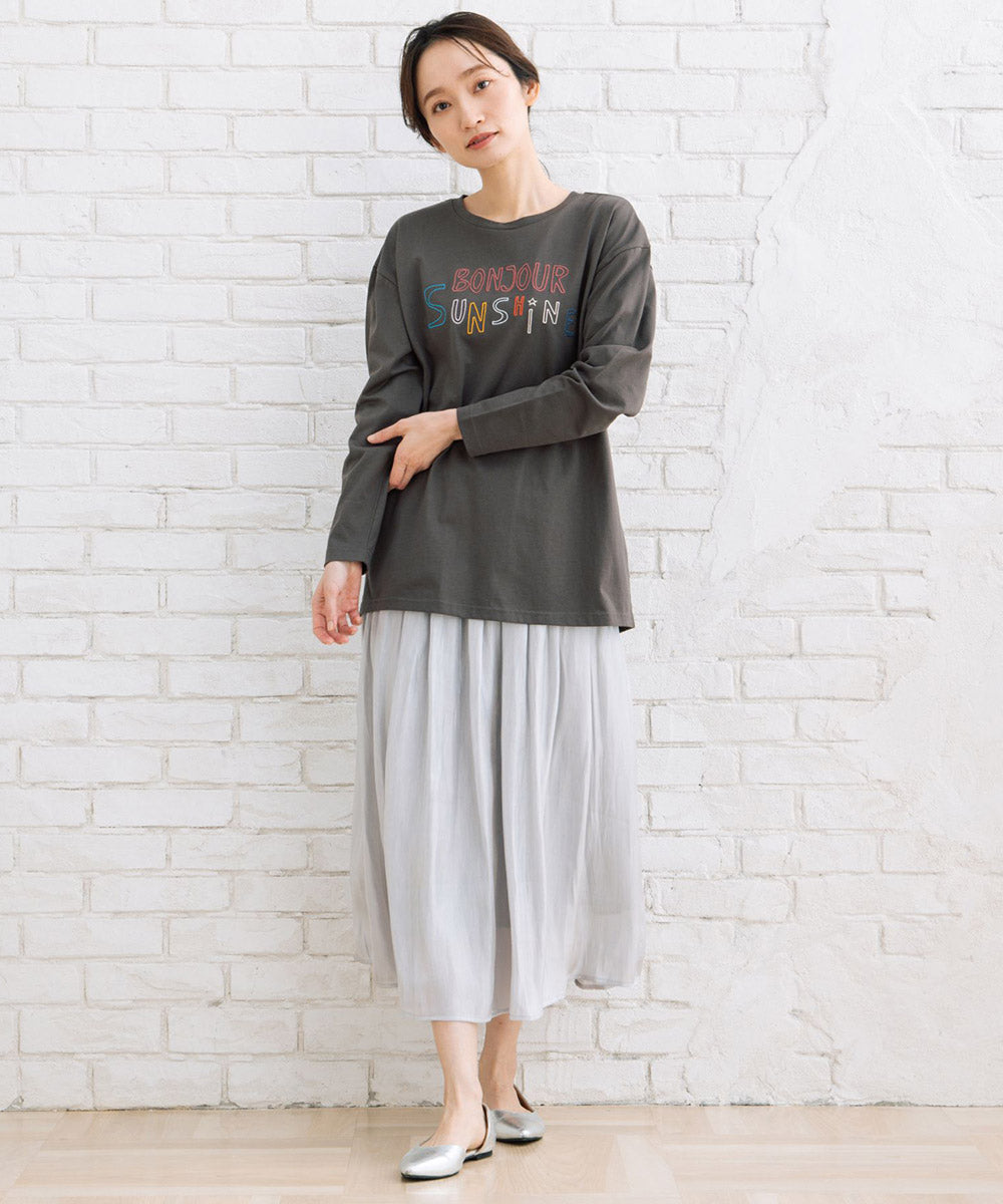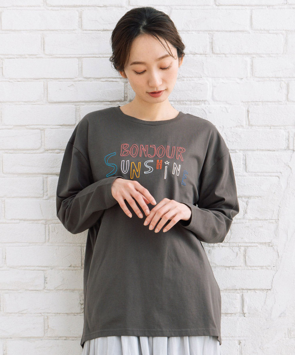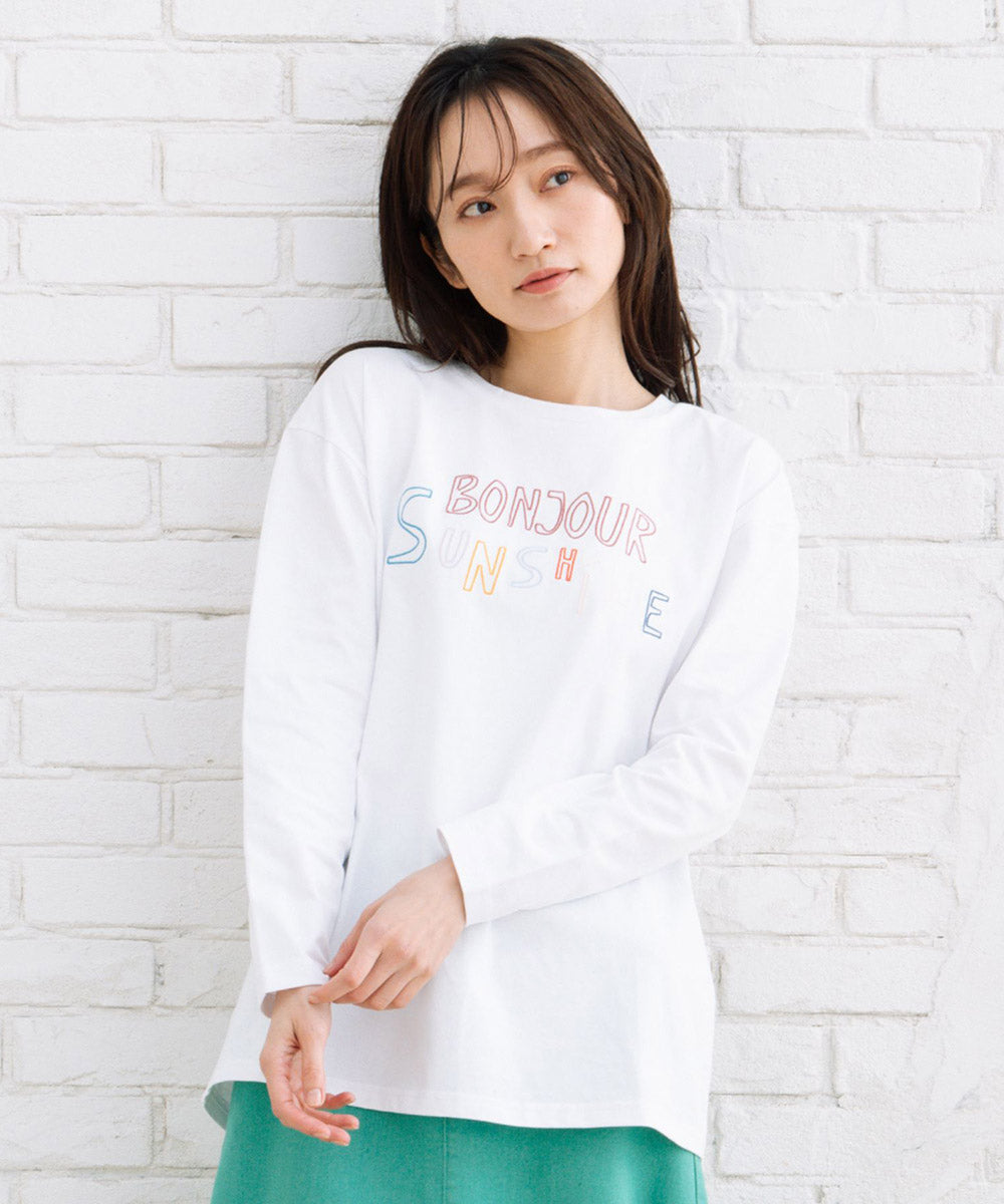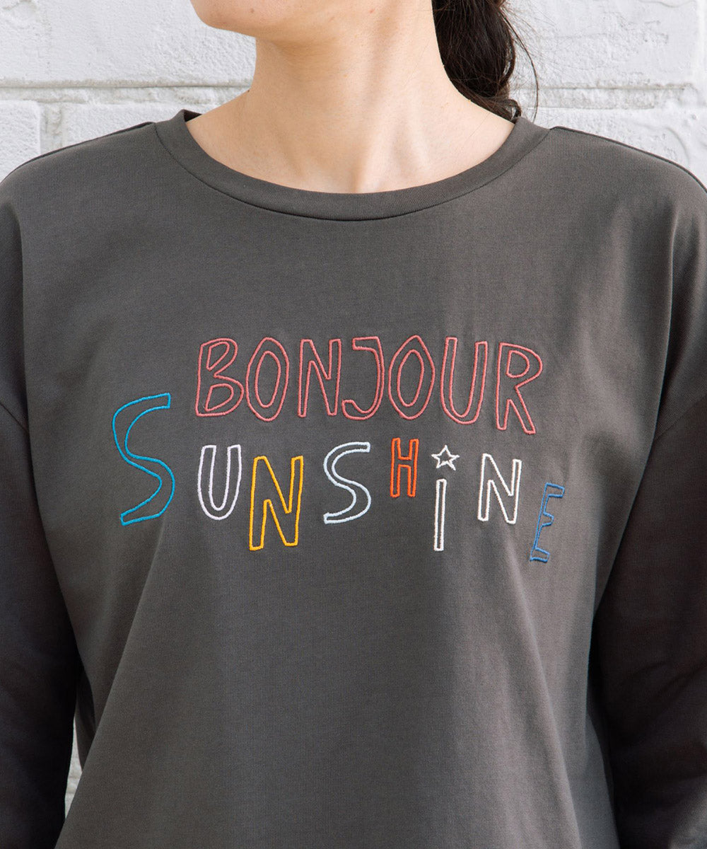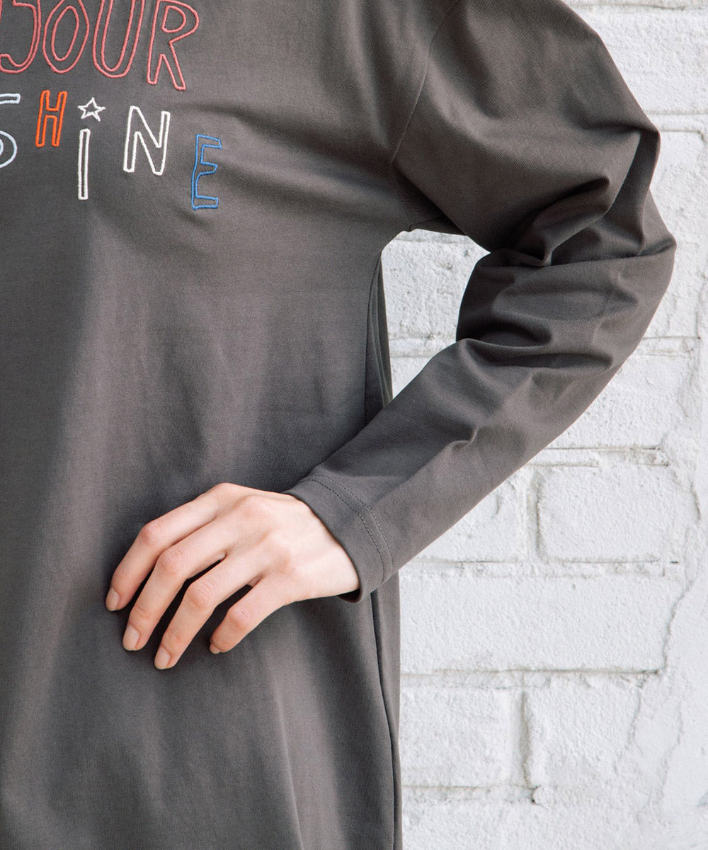 「BONJOUR SUNSHINE」のロゴ刺繍がかわいいロングTシャツ。