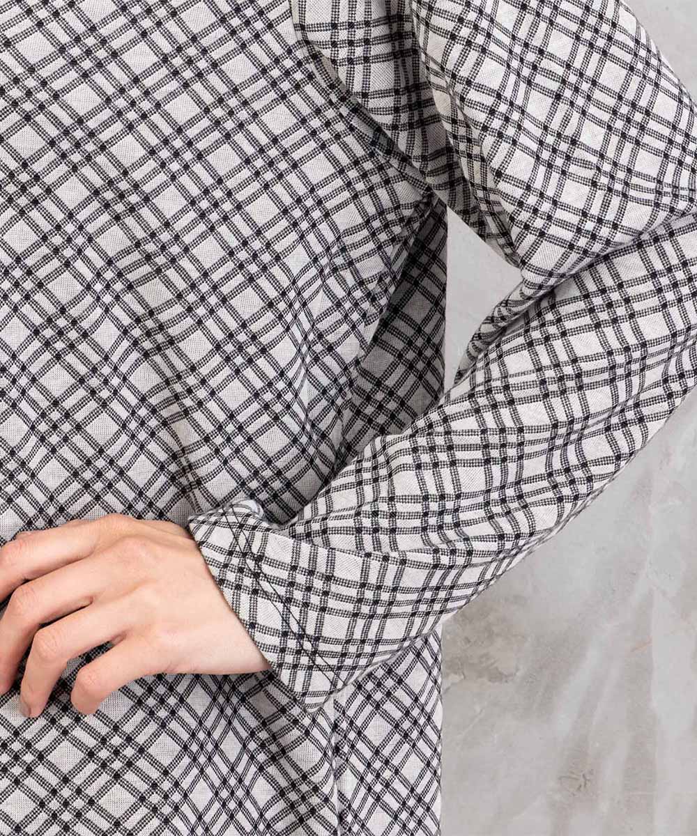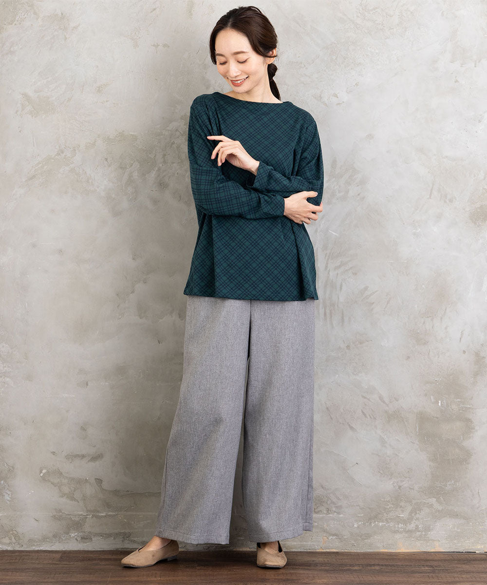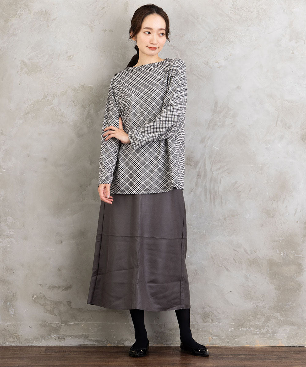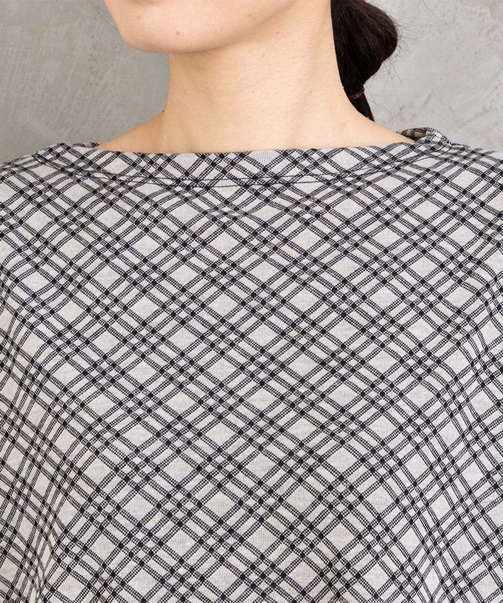 バイアス使いのチェック柄が、シンプルなスタイルに表情をプラス。