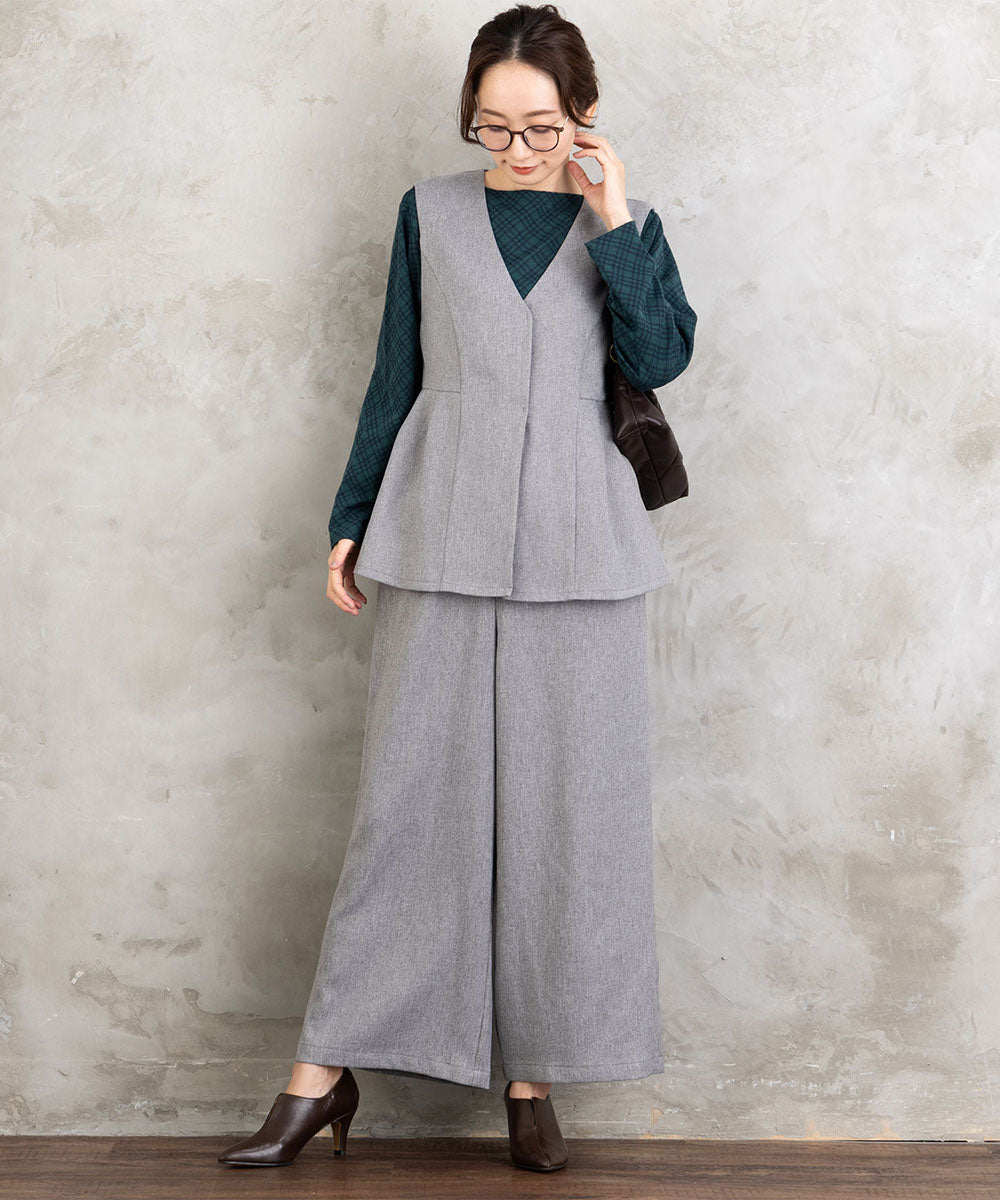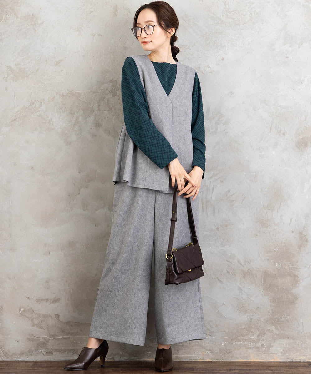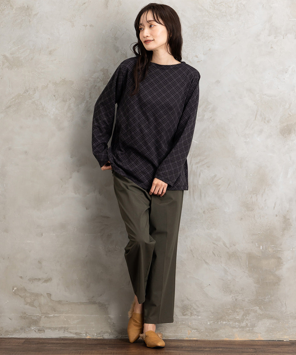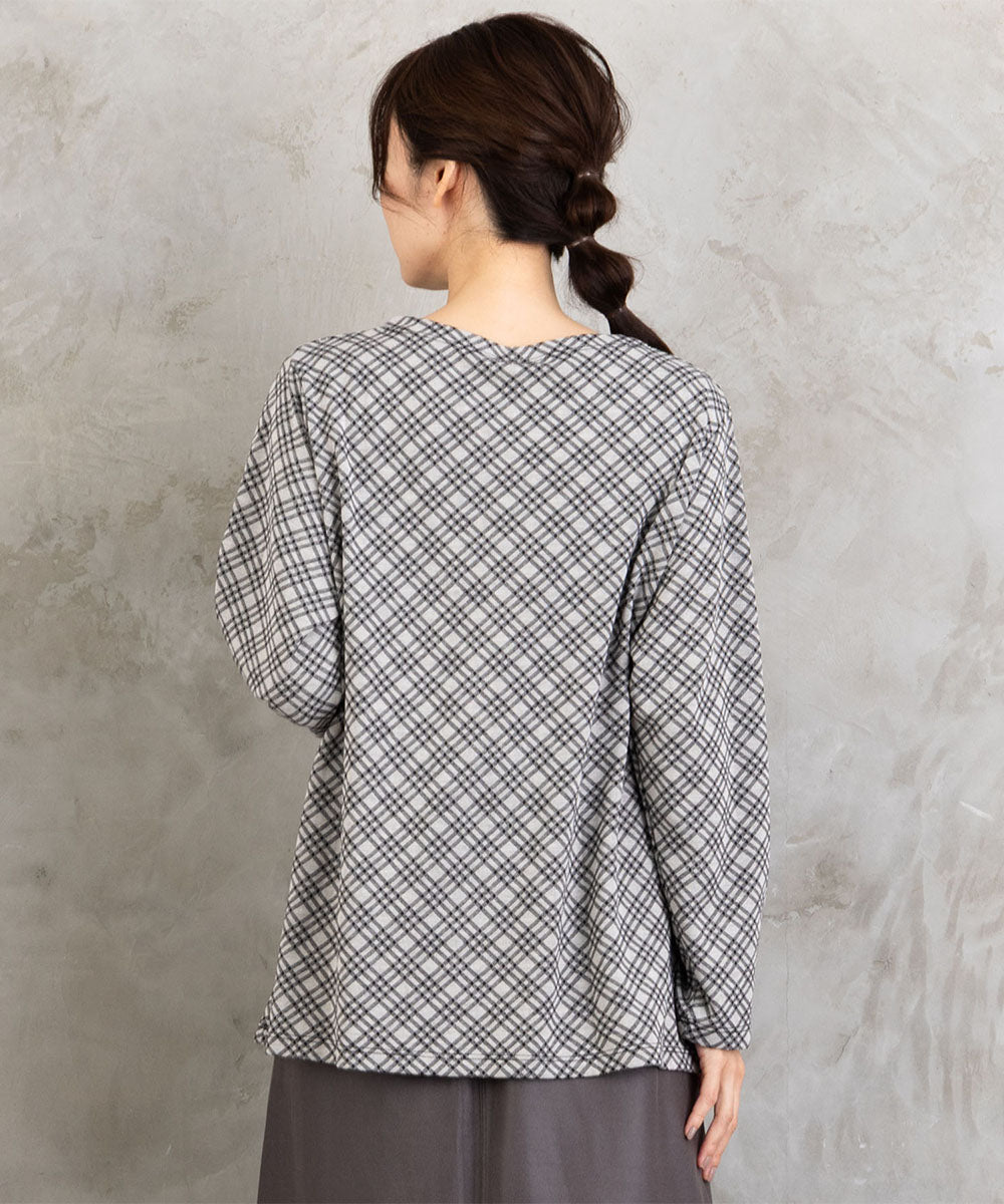 バイアス使いのチェック柄が、シンプルなスタイルに表情をプラス。