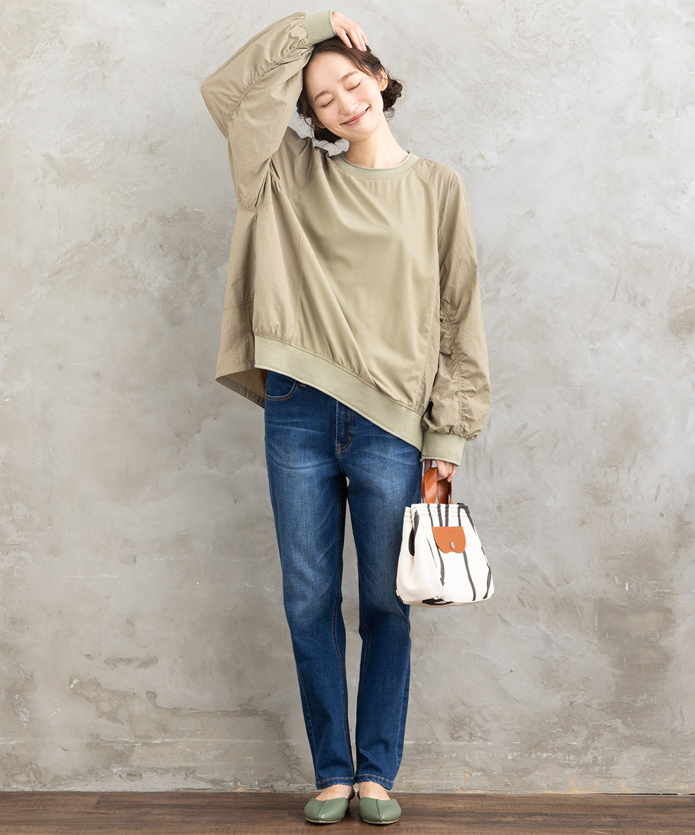 #大きいサイズコーデ #sabstreet #秋コーデ #異素材トップス #きれいめカジュアル #ナイロンタフタ #プルオーバーコーデ