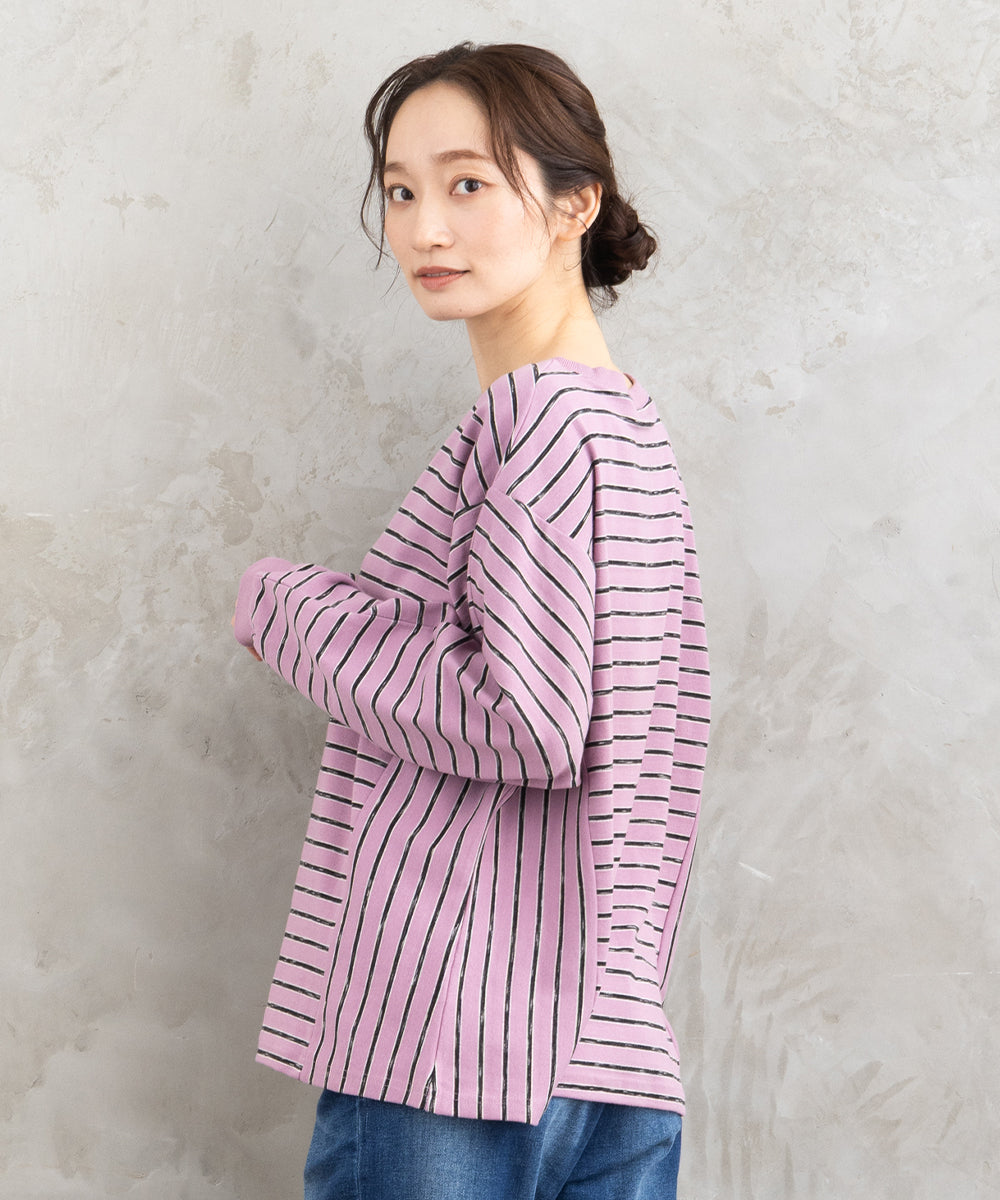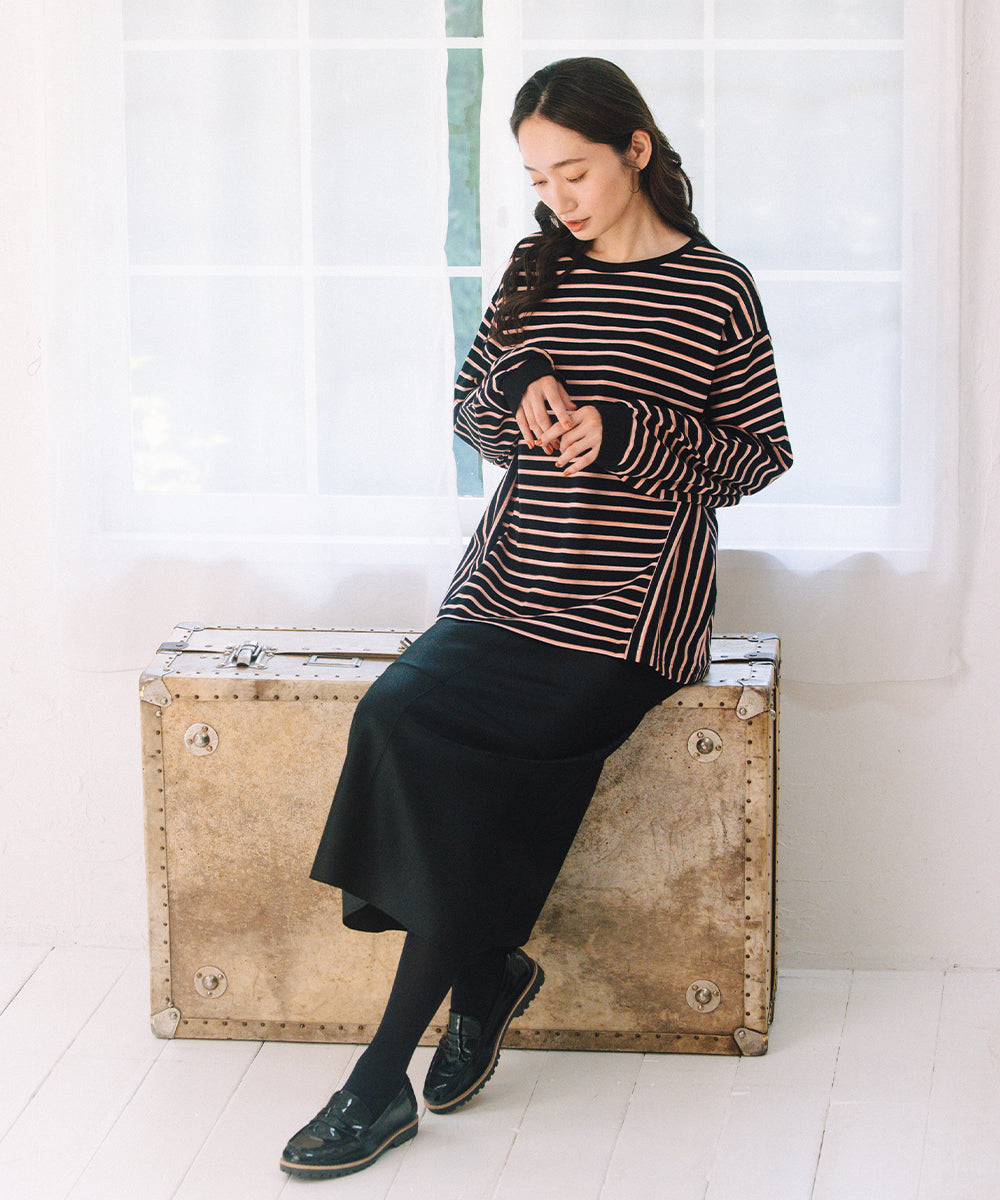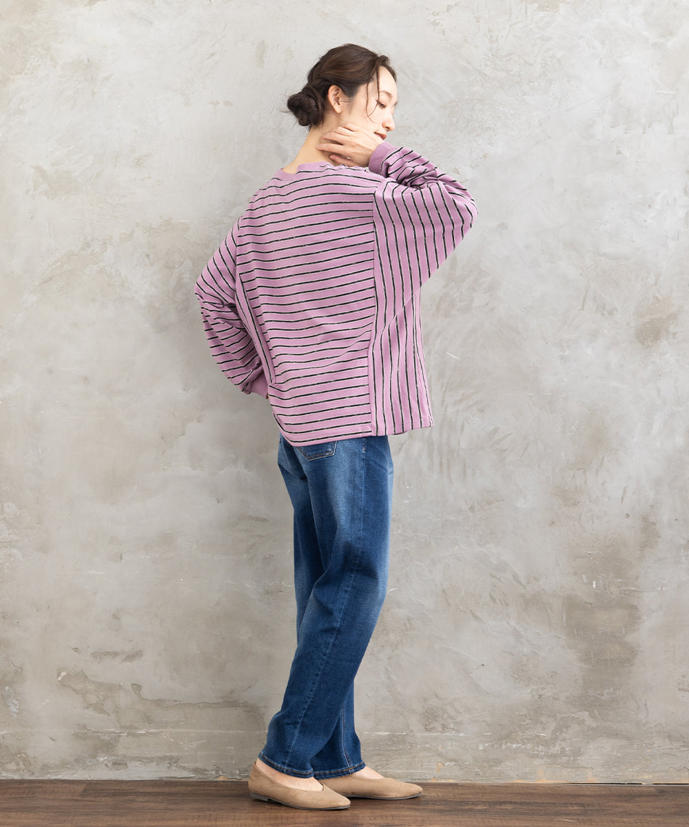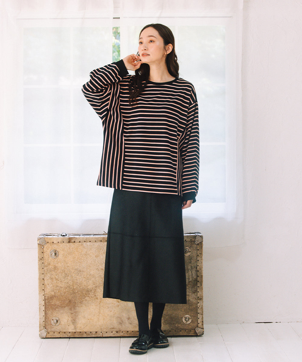 横ボーダー×サイド切り替えの縦ボーダーがさりげないアクセントになり、リラックス感のあるシルエットでもすっきり見せを叶えてくれます。