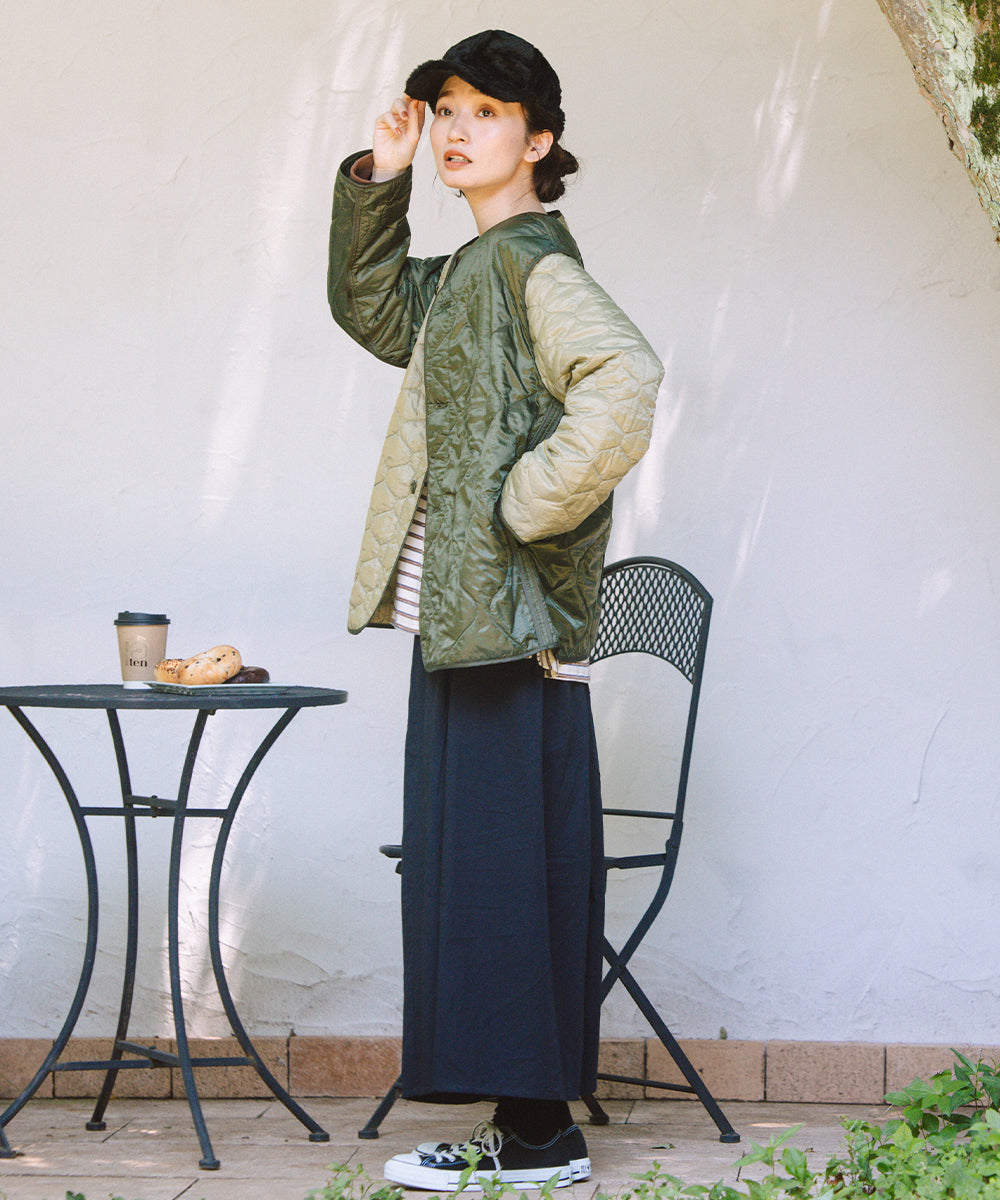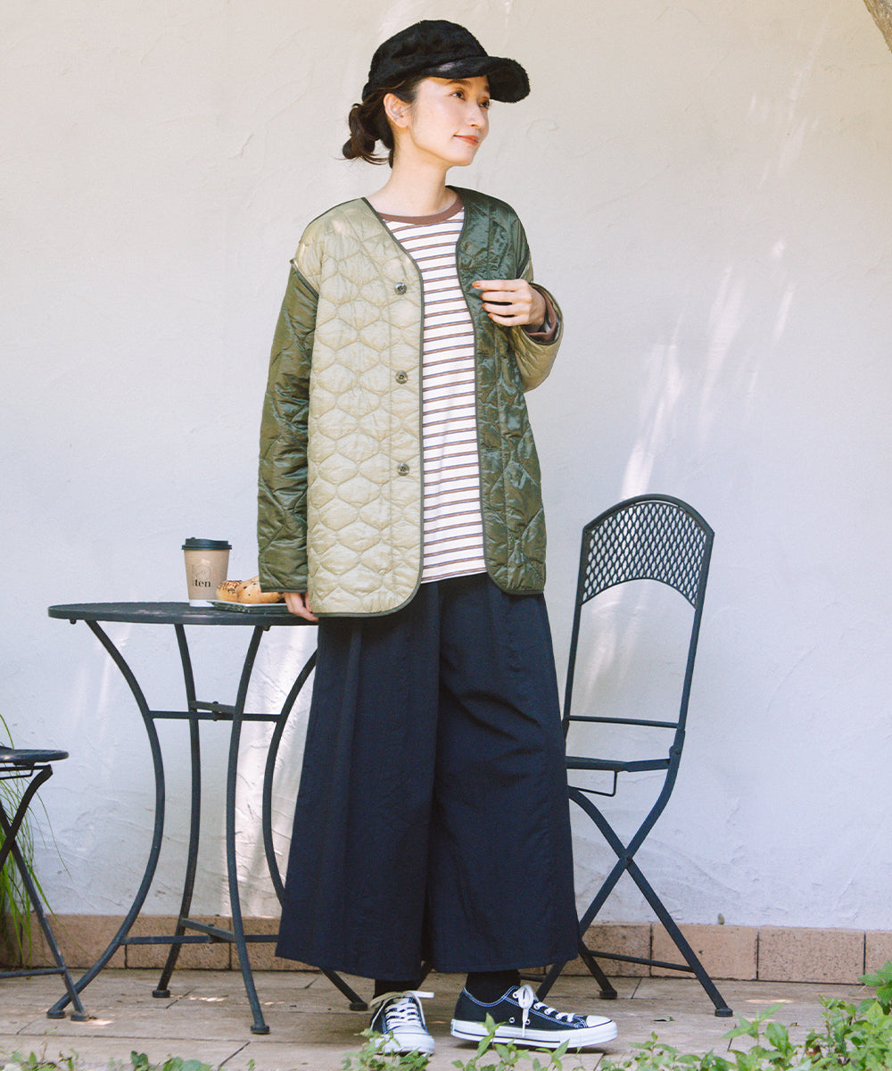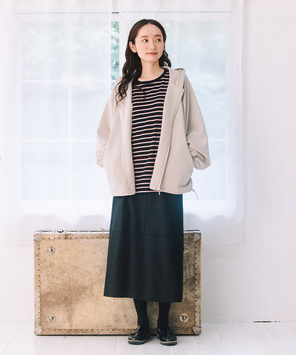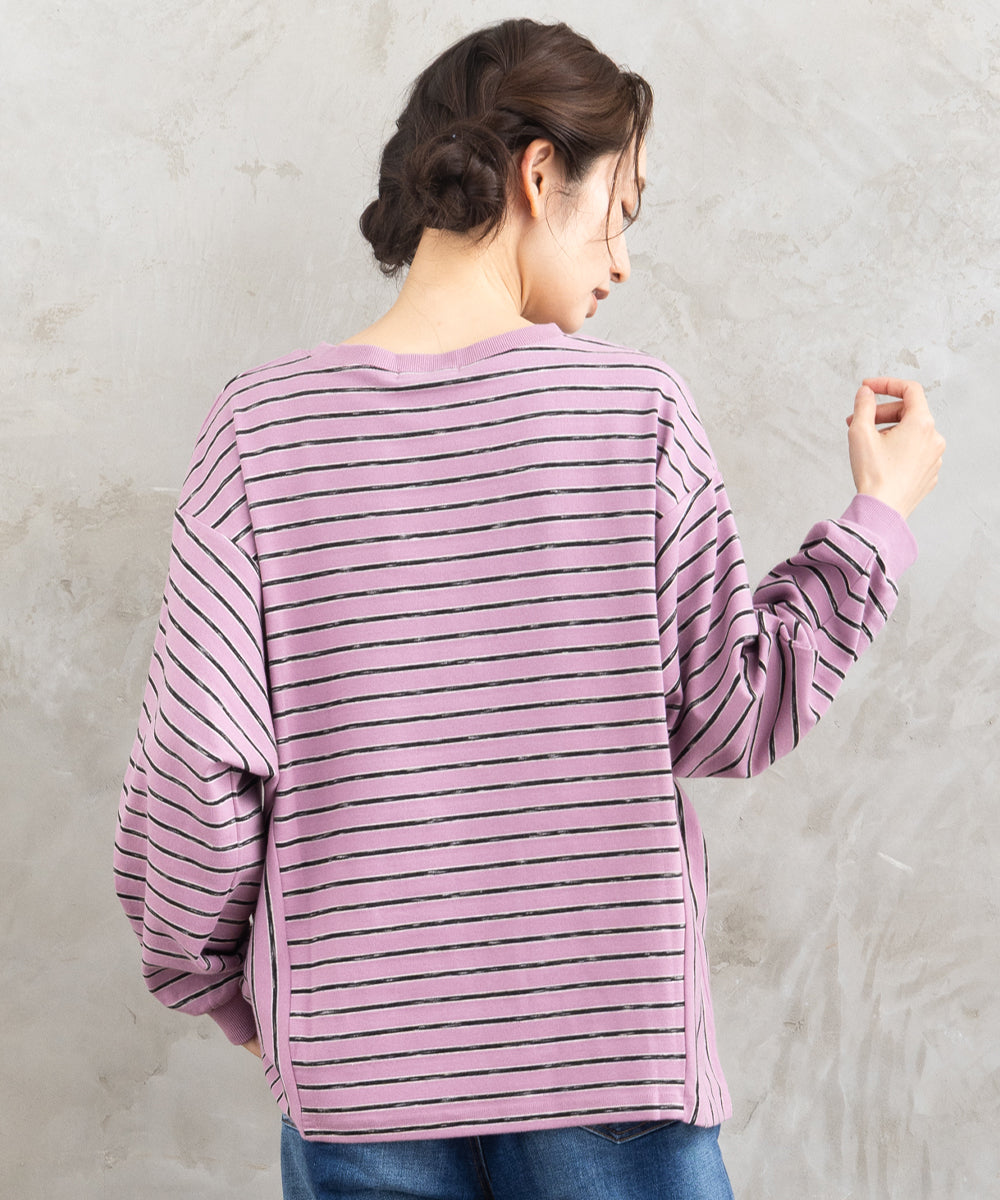 横ボーダー×サイド切り替えの縦ボーダーがさりげないアクセントになり、リラックス感のあるシルエットでもすっきり見せを叶えてくれます。
