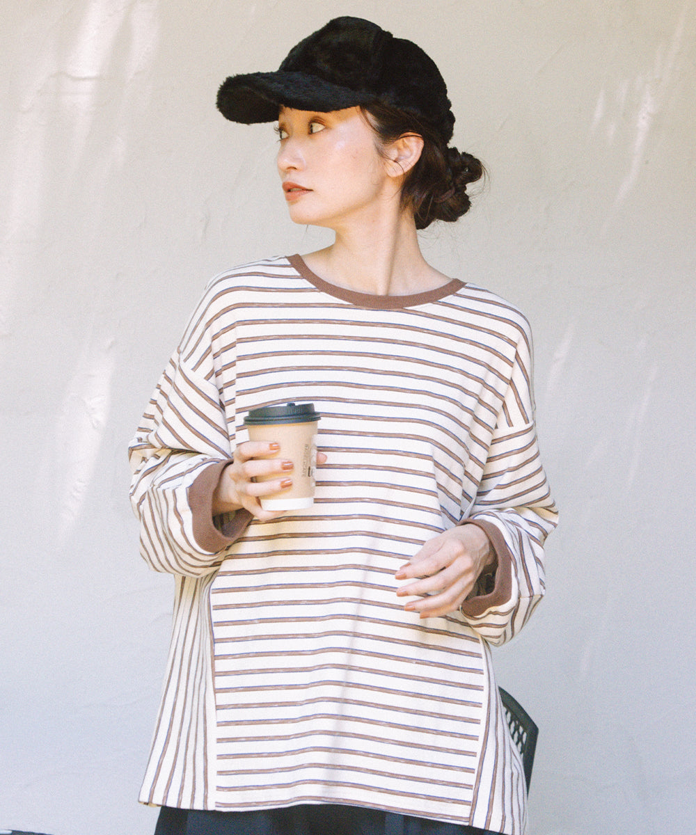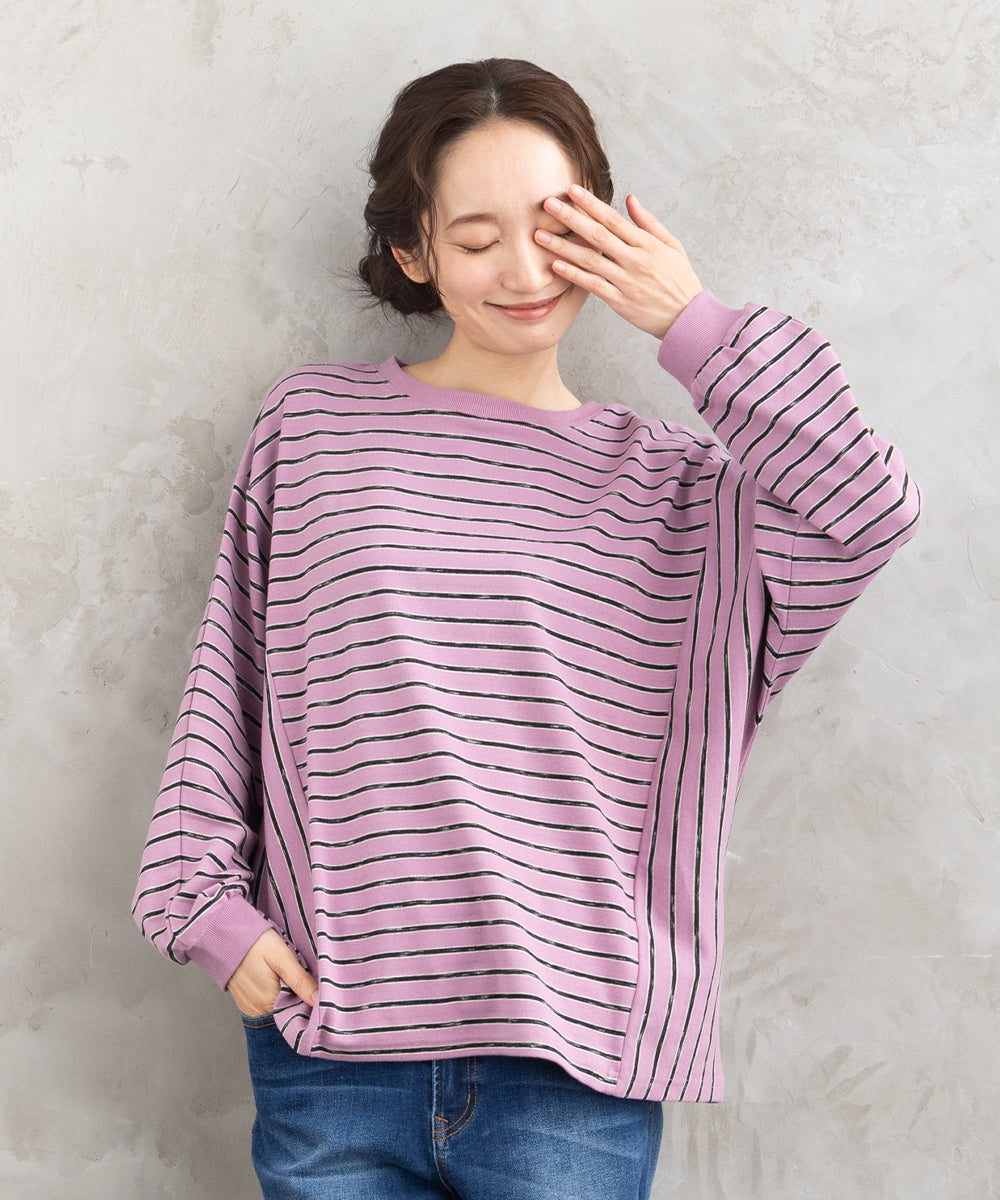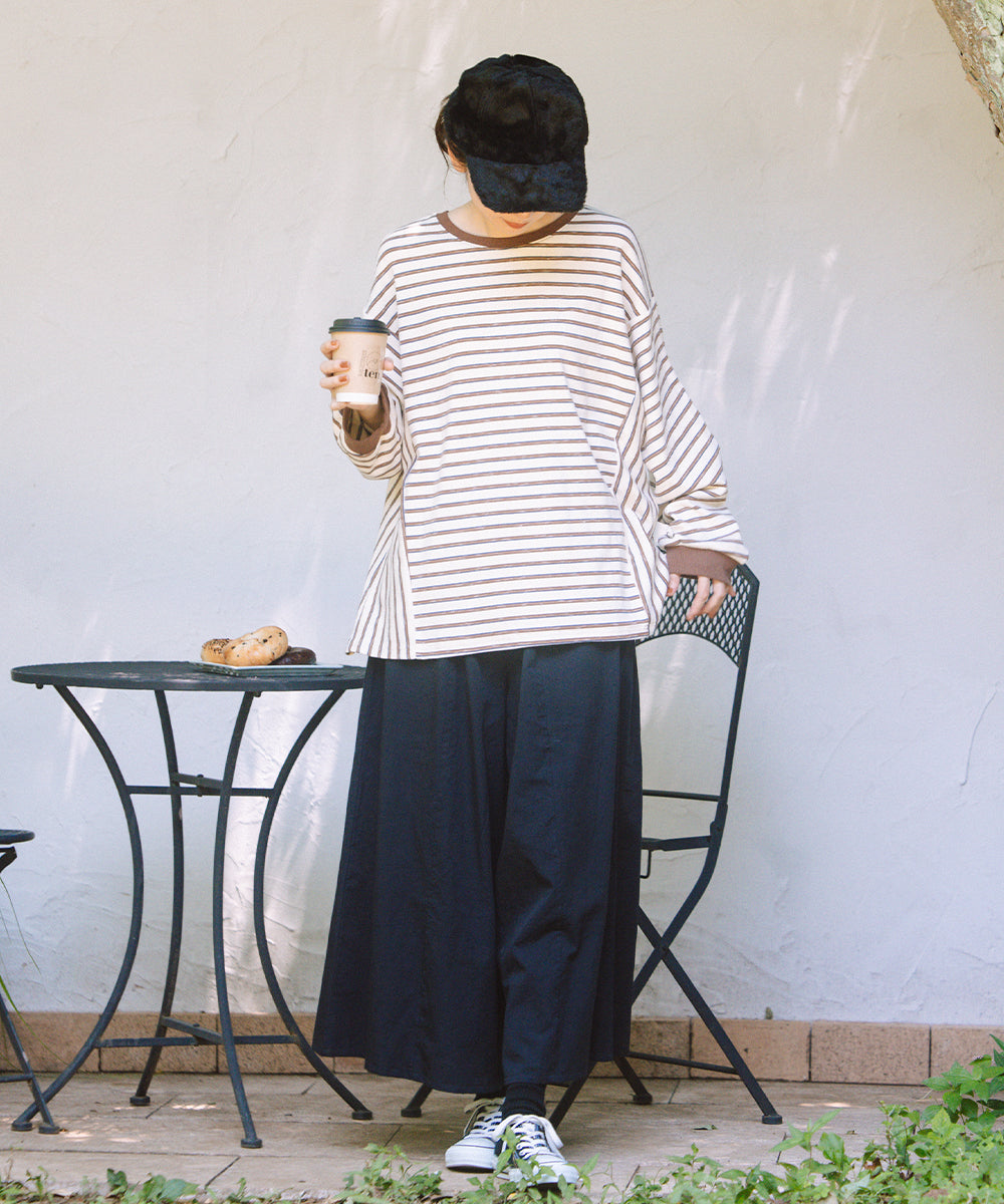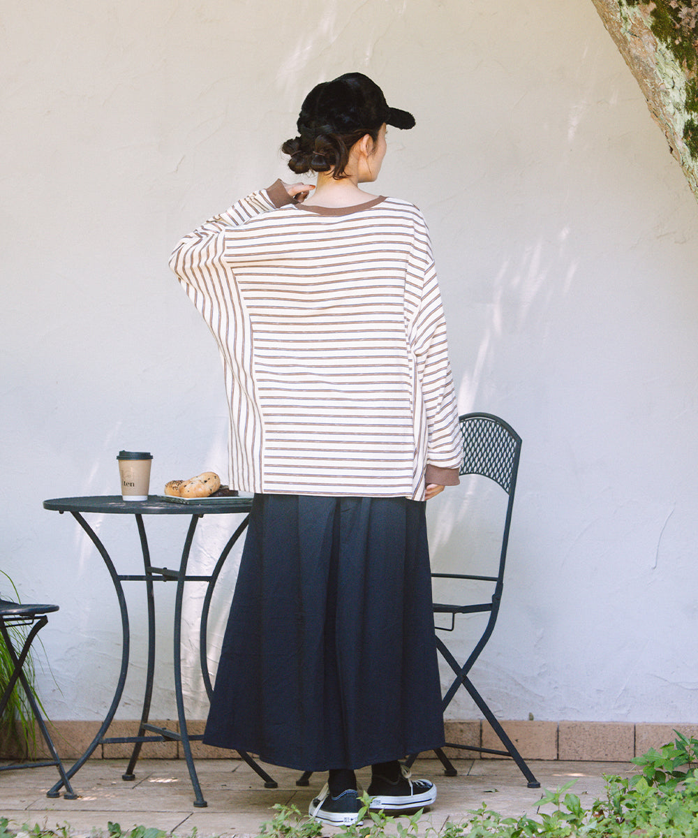 横ボーダー×サイド切り替えの縦ボーダーがさりげないアクセントになり、リラックス感のあるシルエットでもすっきり見せを叶えてくれます。