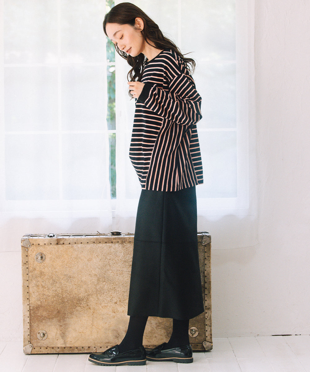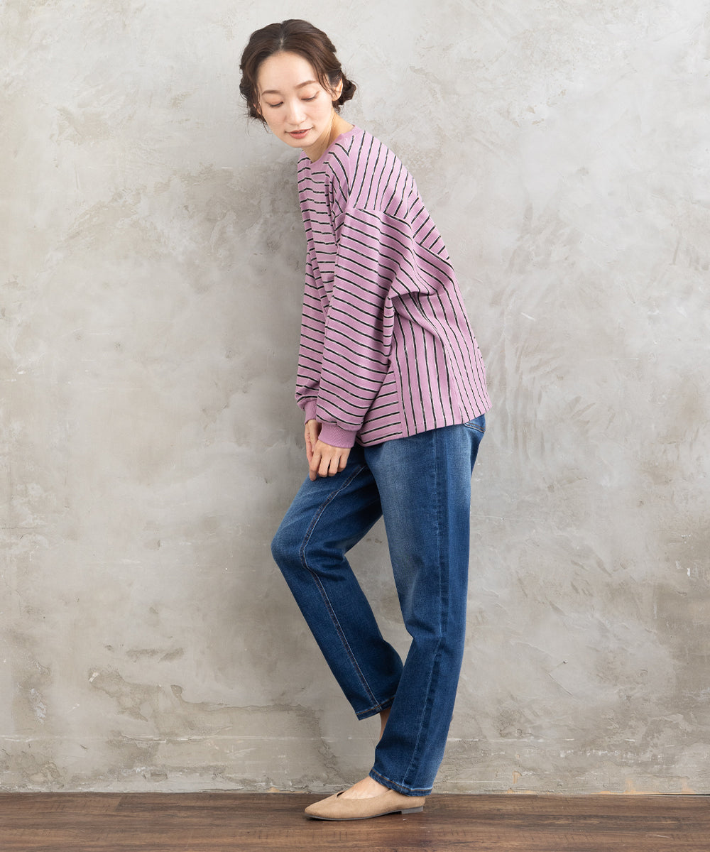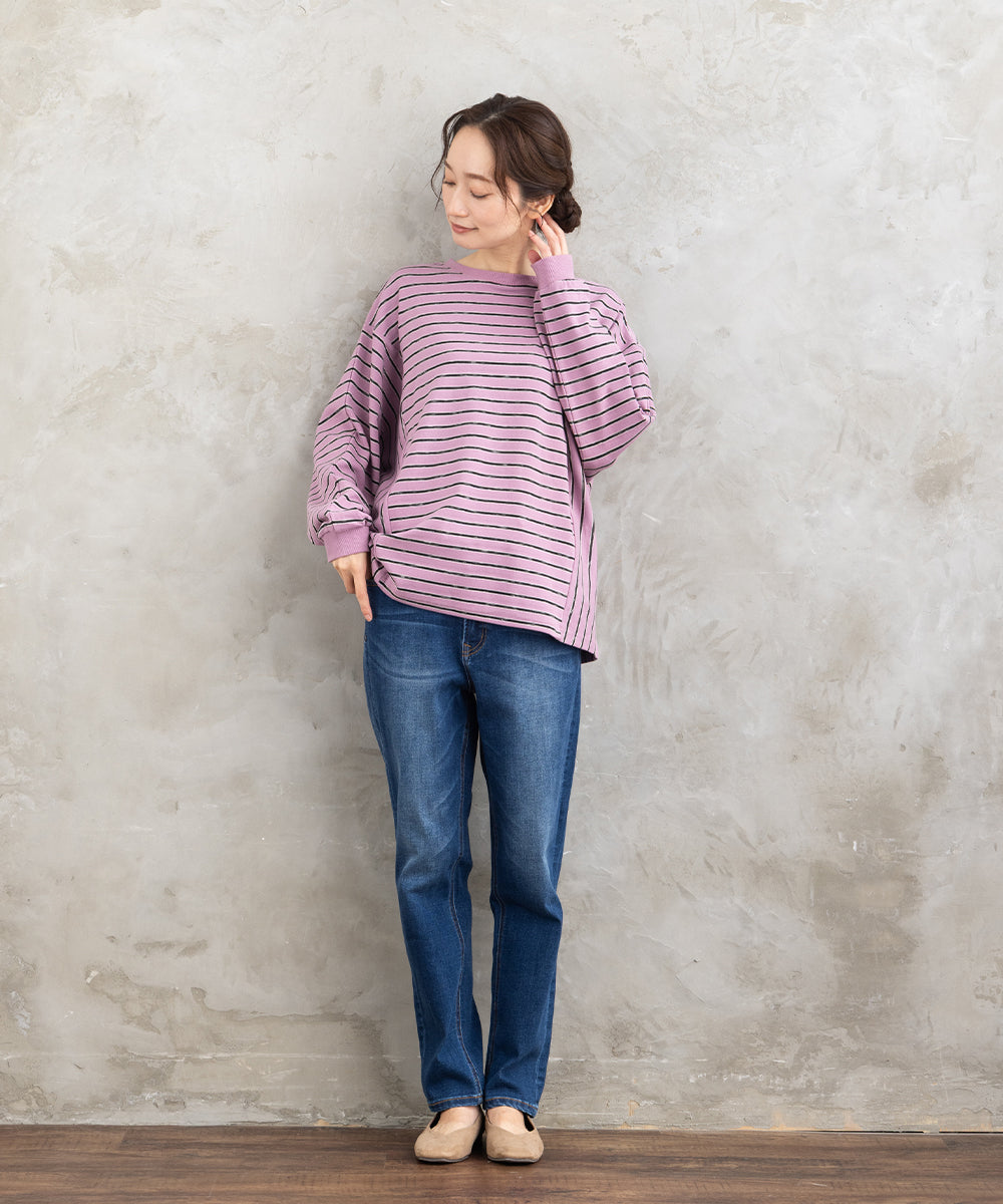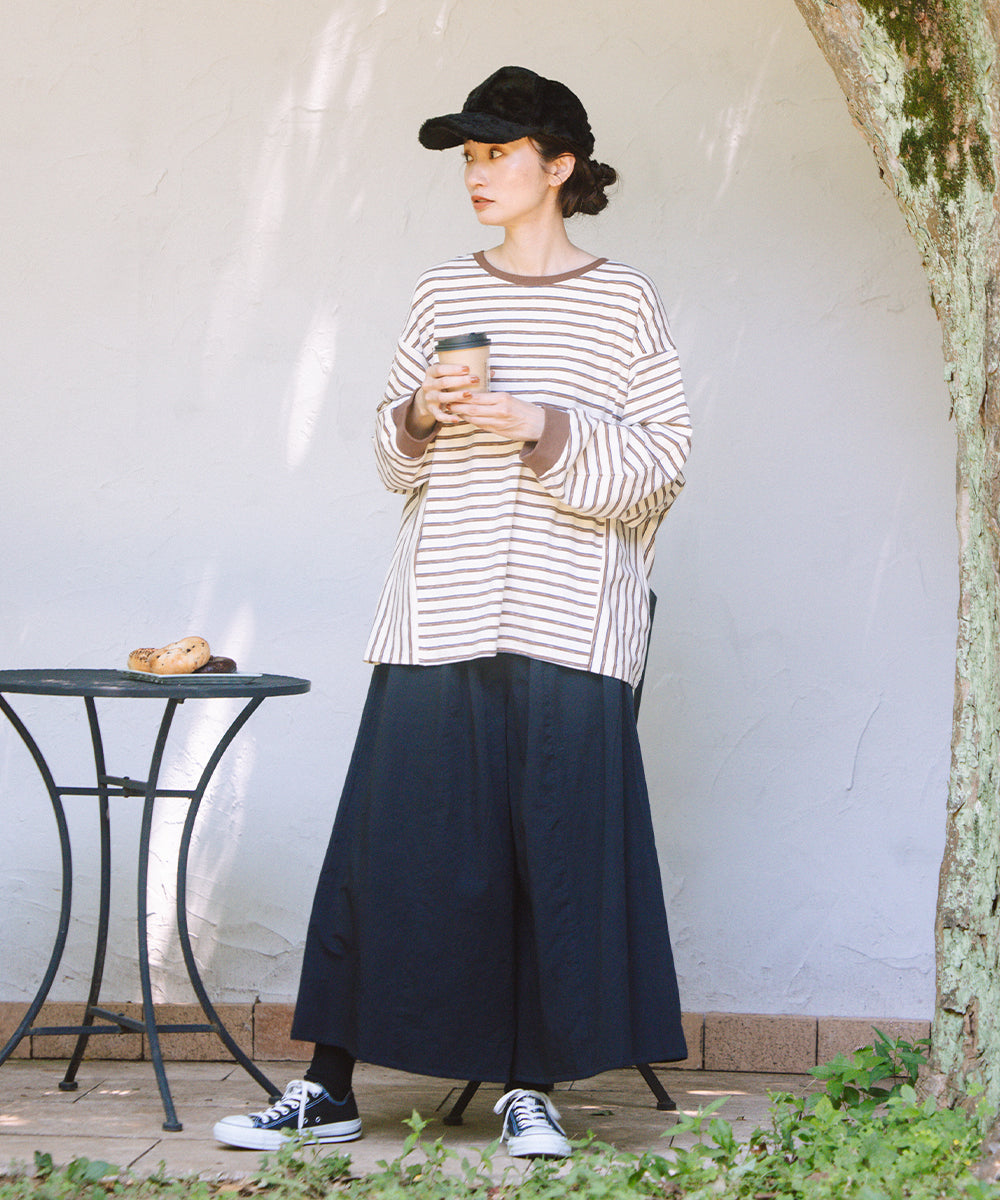 横ボーダー×サイド切り替えの縦ボーダーがさりげないアクセントになり、リラックス感のあるシルエットでもすっきり見せを叶えてくれます。