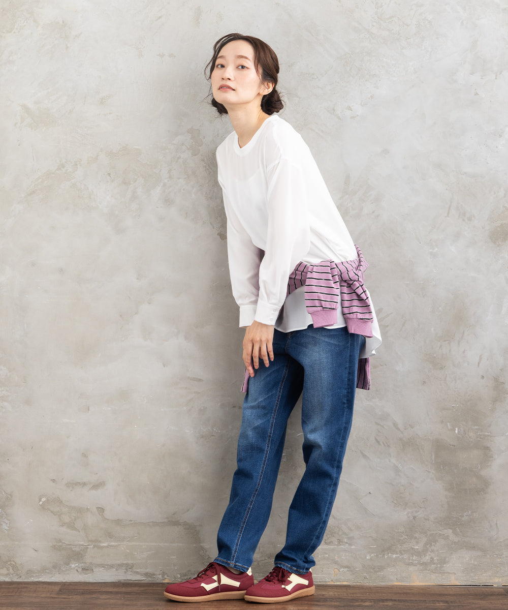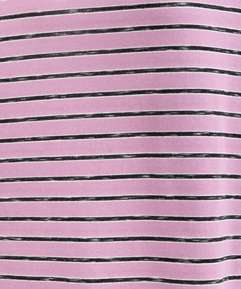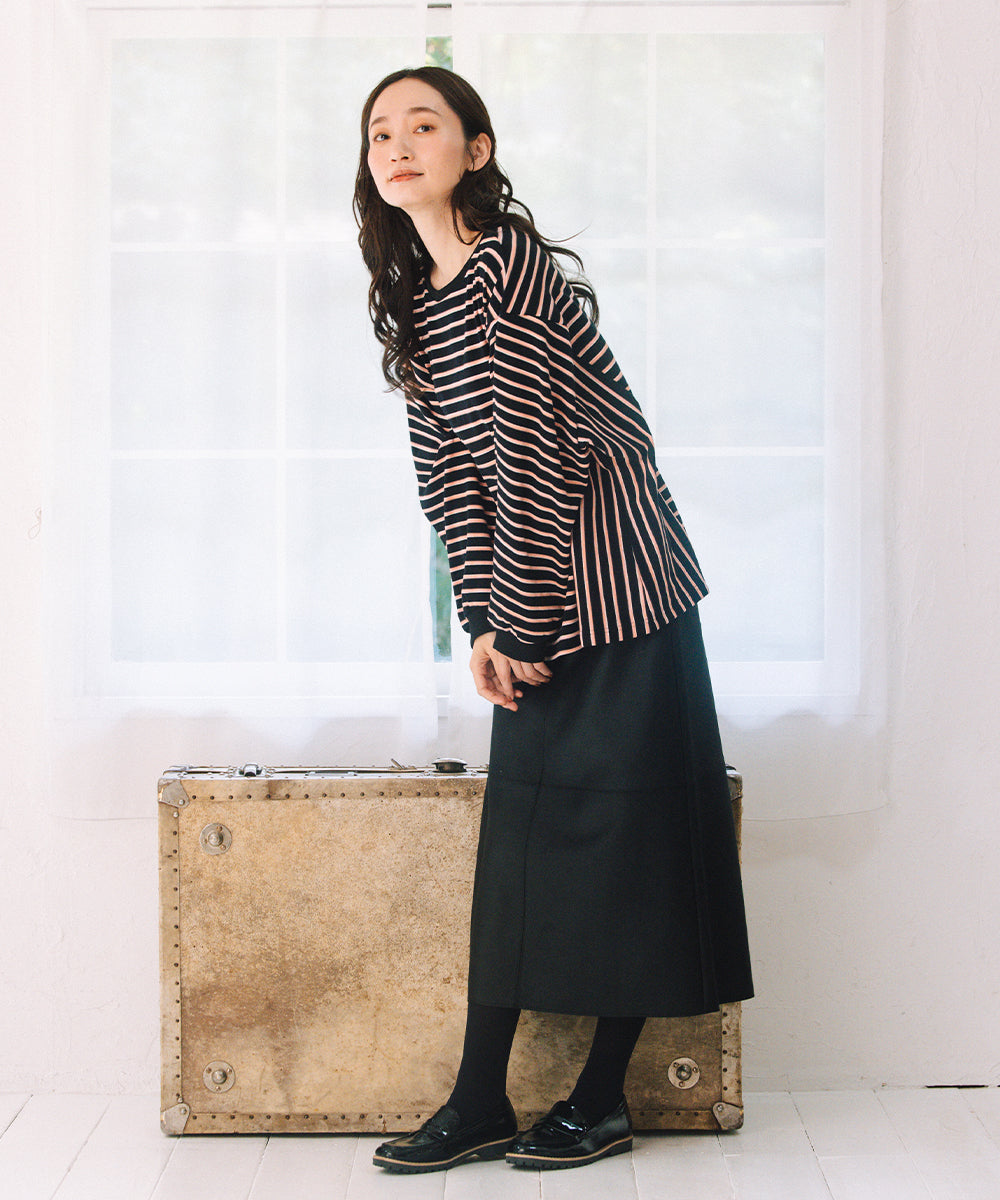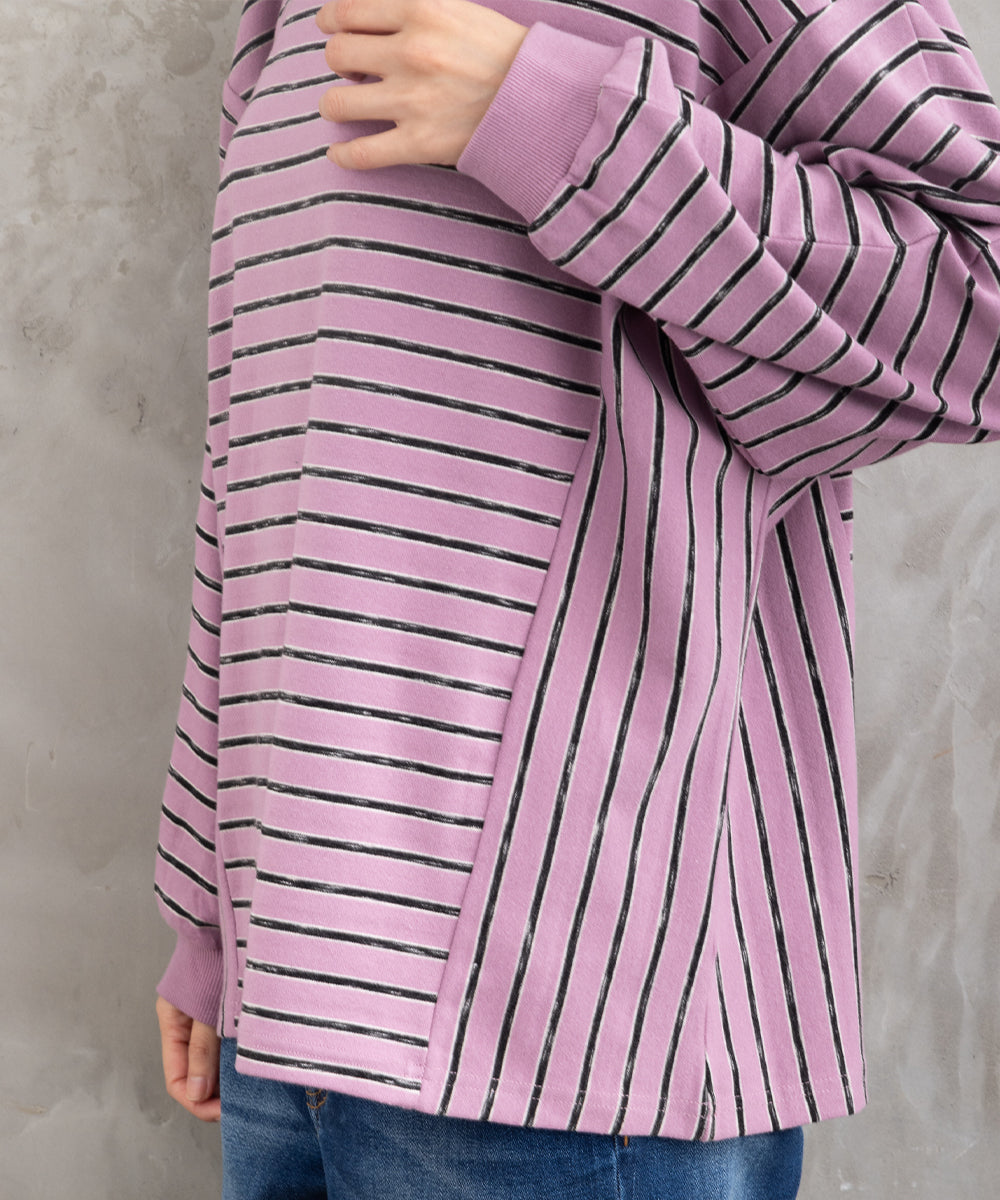 横ボーダー×サイド切り替えの縦ボーダーがさりげないアクセントになり、リラックス感のあるシルエットでもすっきり見せを叶えてくれます。