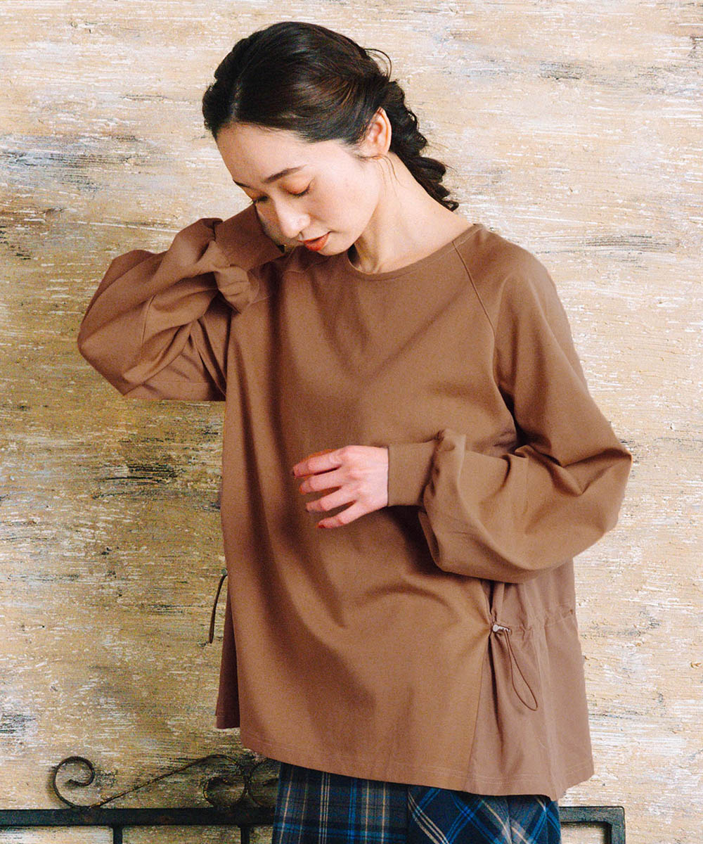 カットソーと布帛を組み合わせた異素材デザインが、さりげなくおしゃれ見えするプルオーバー。