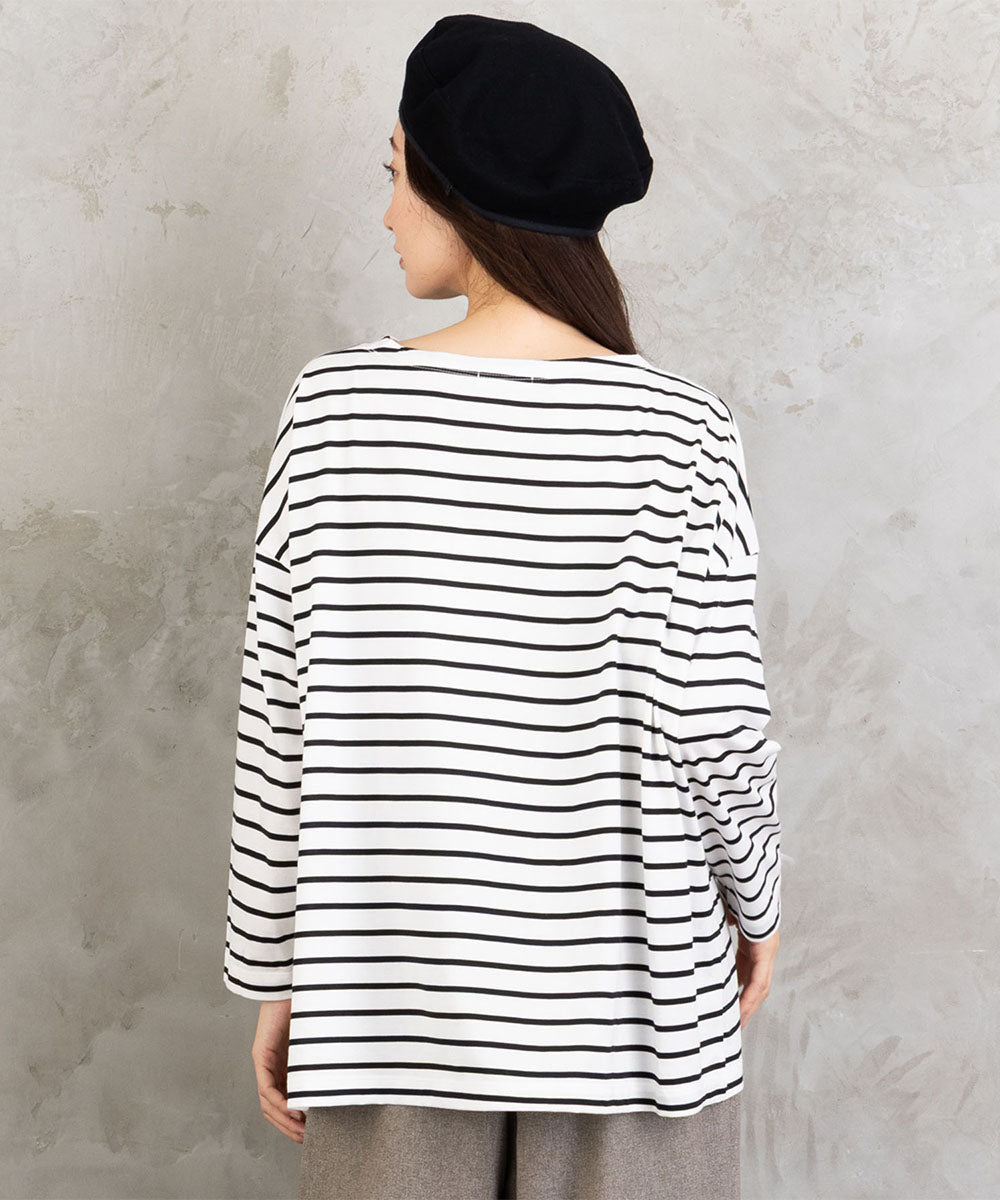 ・デザインポイント:ボーダー×ドットの掛け合わせ、ゆったりした袖と身幅