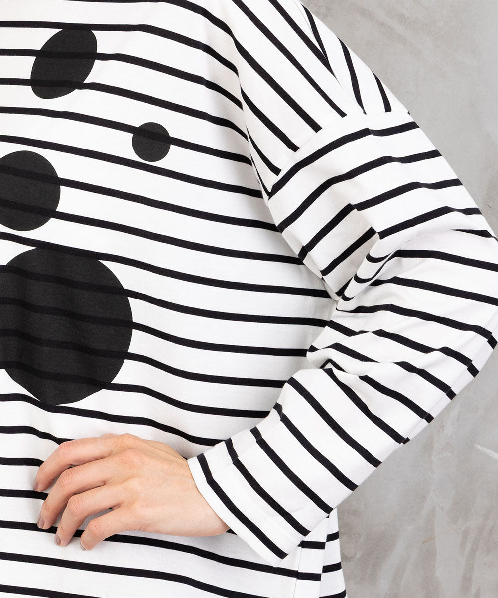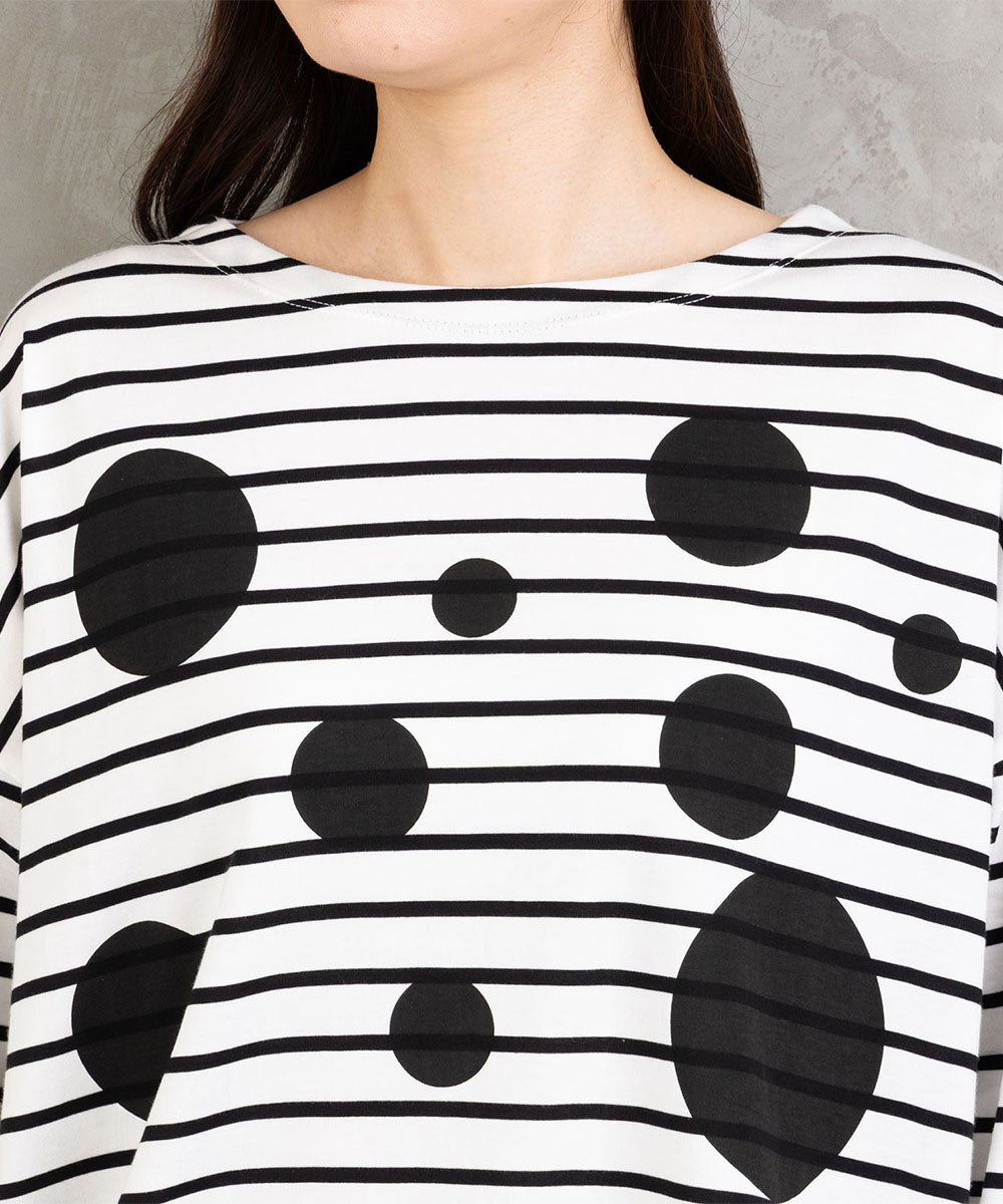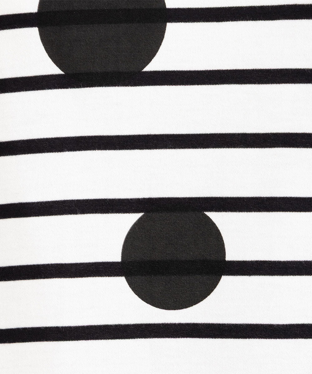定番のボーダーに、ドットを大胆にあしらったユニークなデザインが、シンプルな装いにリズムを加えてくれます。