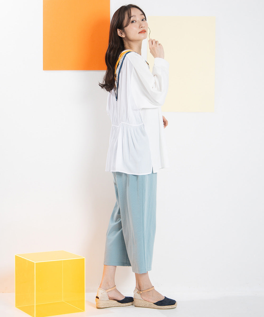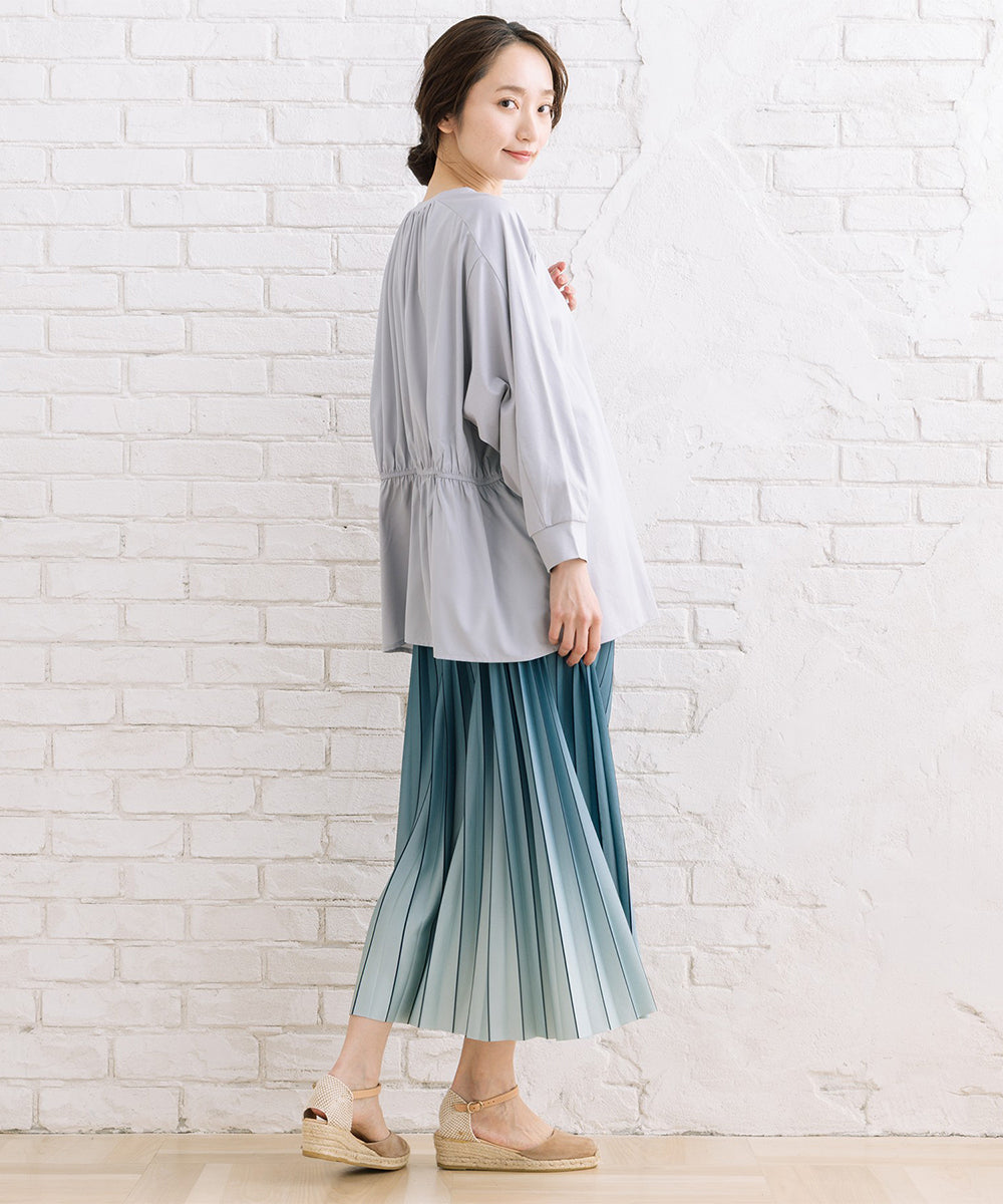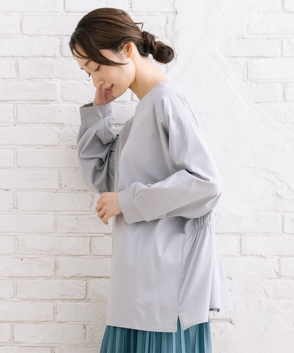 サイドに施したギャザー切り替えが、動きのあるシルエットとさりげない華やかさを演出します。