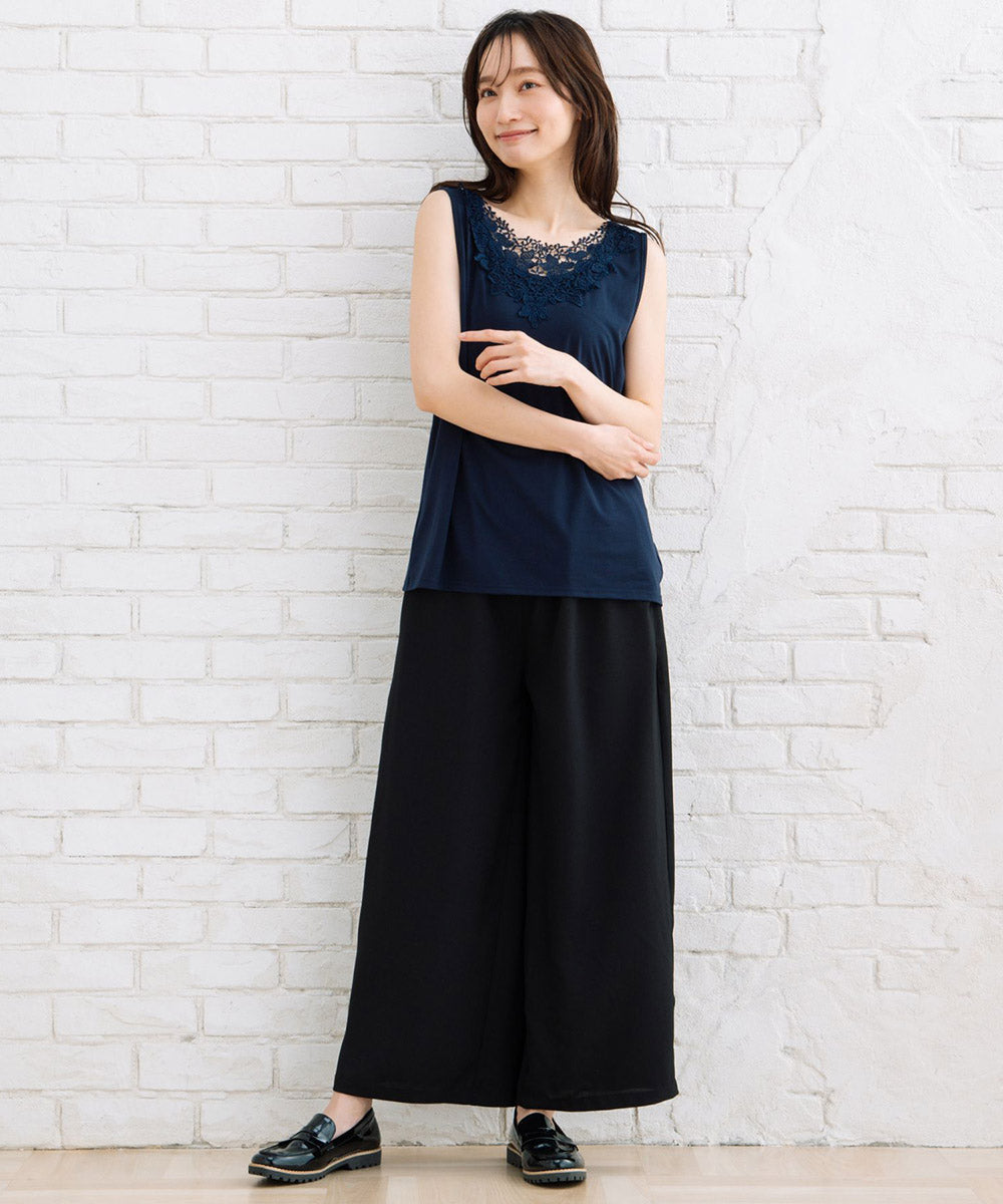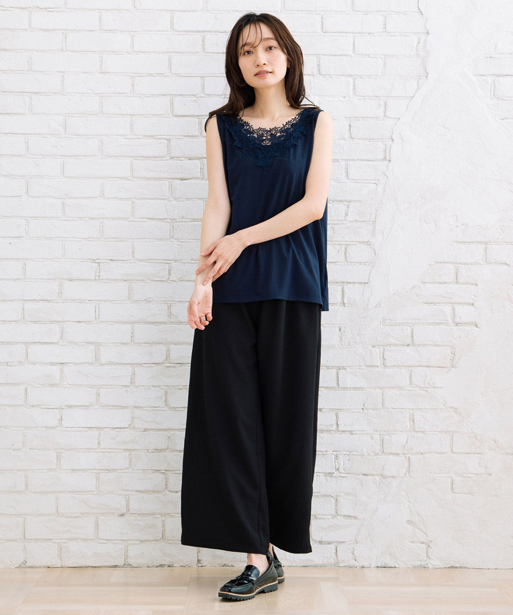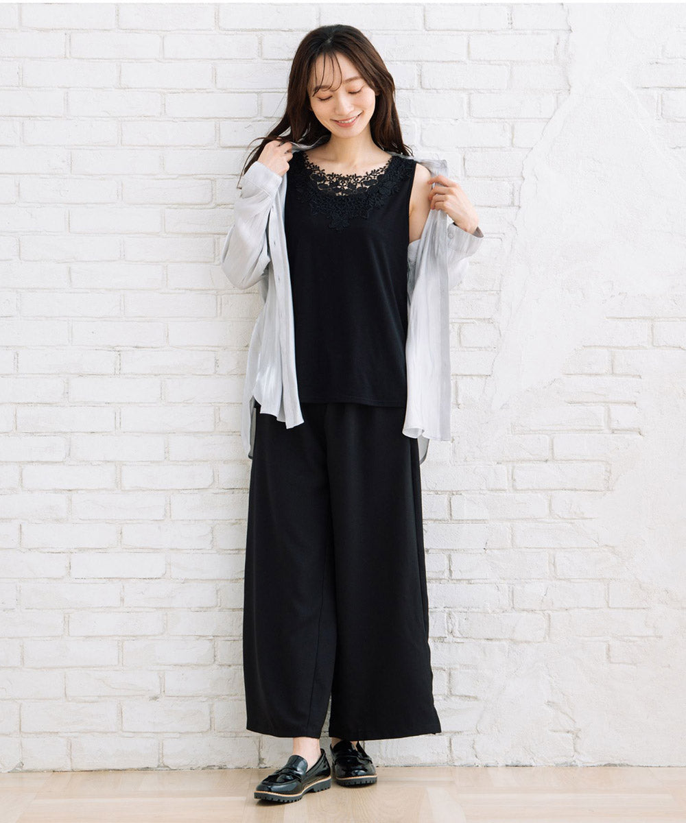 Vネックトップスやシャツブラウスなどのインナーに合わせて、レースをのぞかせたコーディネイトで女性らしい印象に。