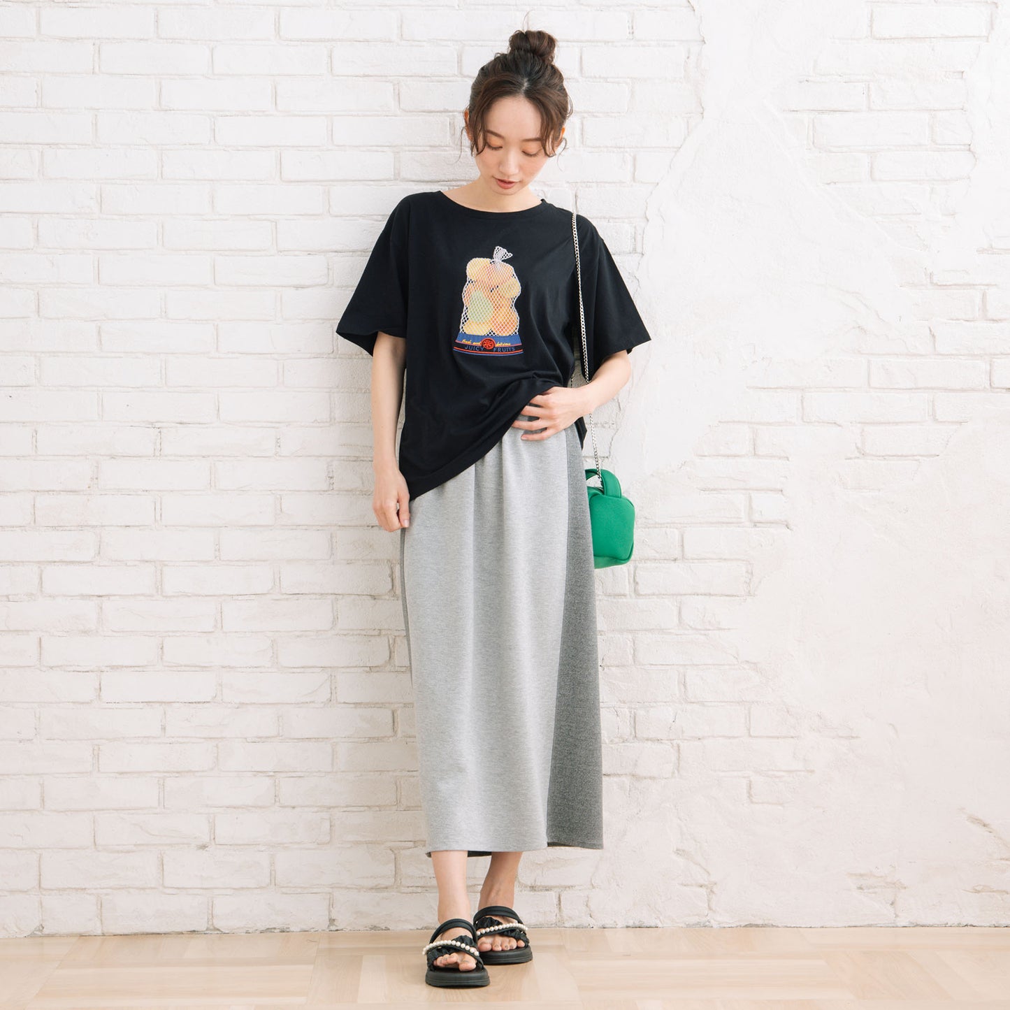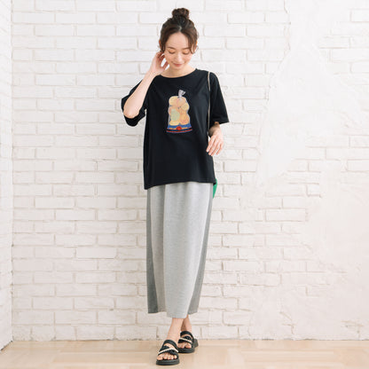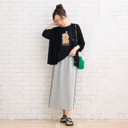 定番のデニムパンツを合わせてカジュアルに、夏場はプリントスカートやワイドパンツとのコーディネートがおすすめです。