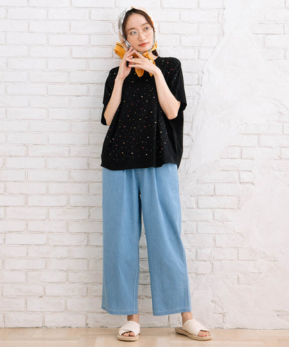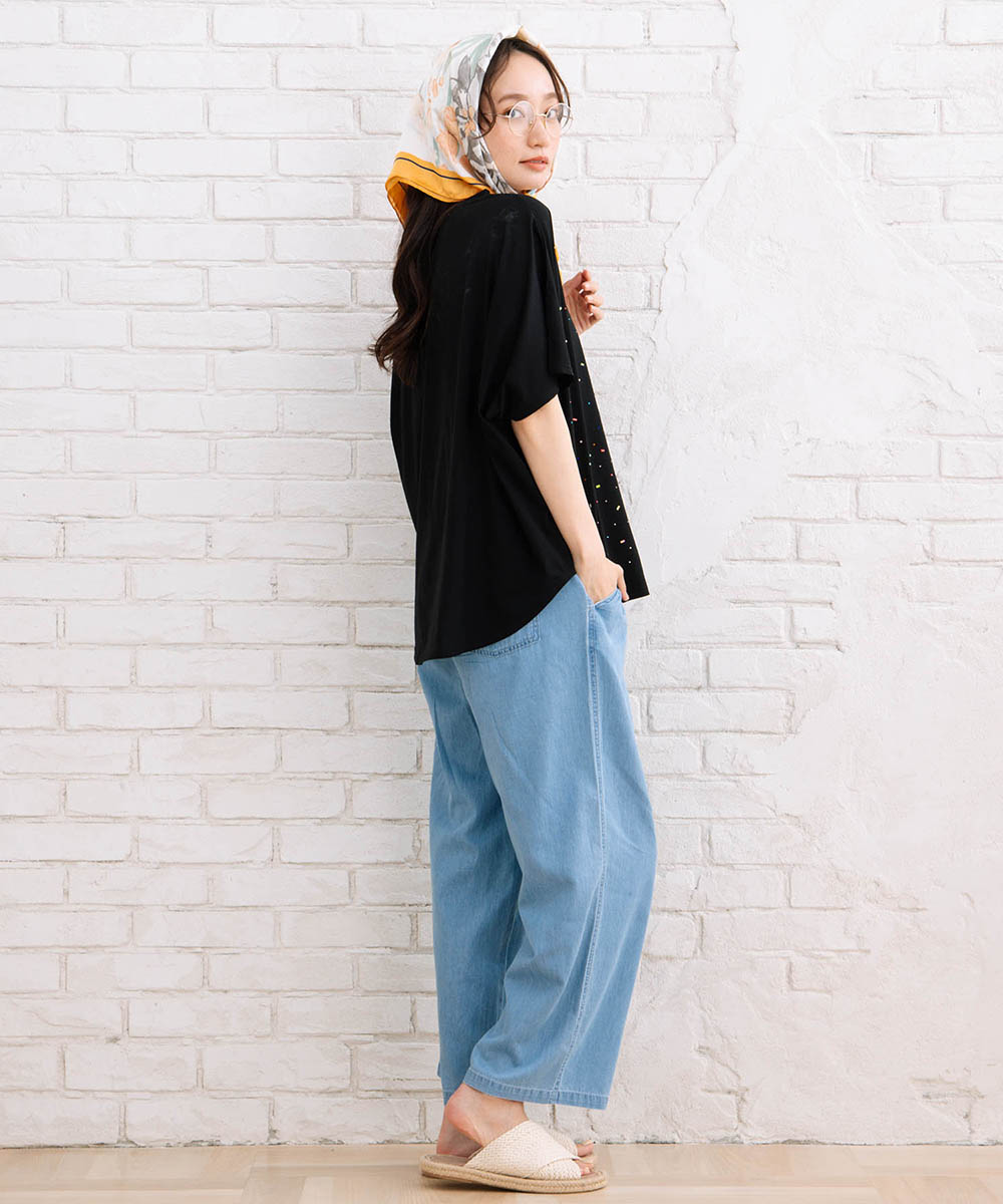 フロントには、まるでスプレーで描いたようなランダムなビジューが散りばめられ、カジュアルながらも華やかな印象を与えます。