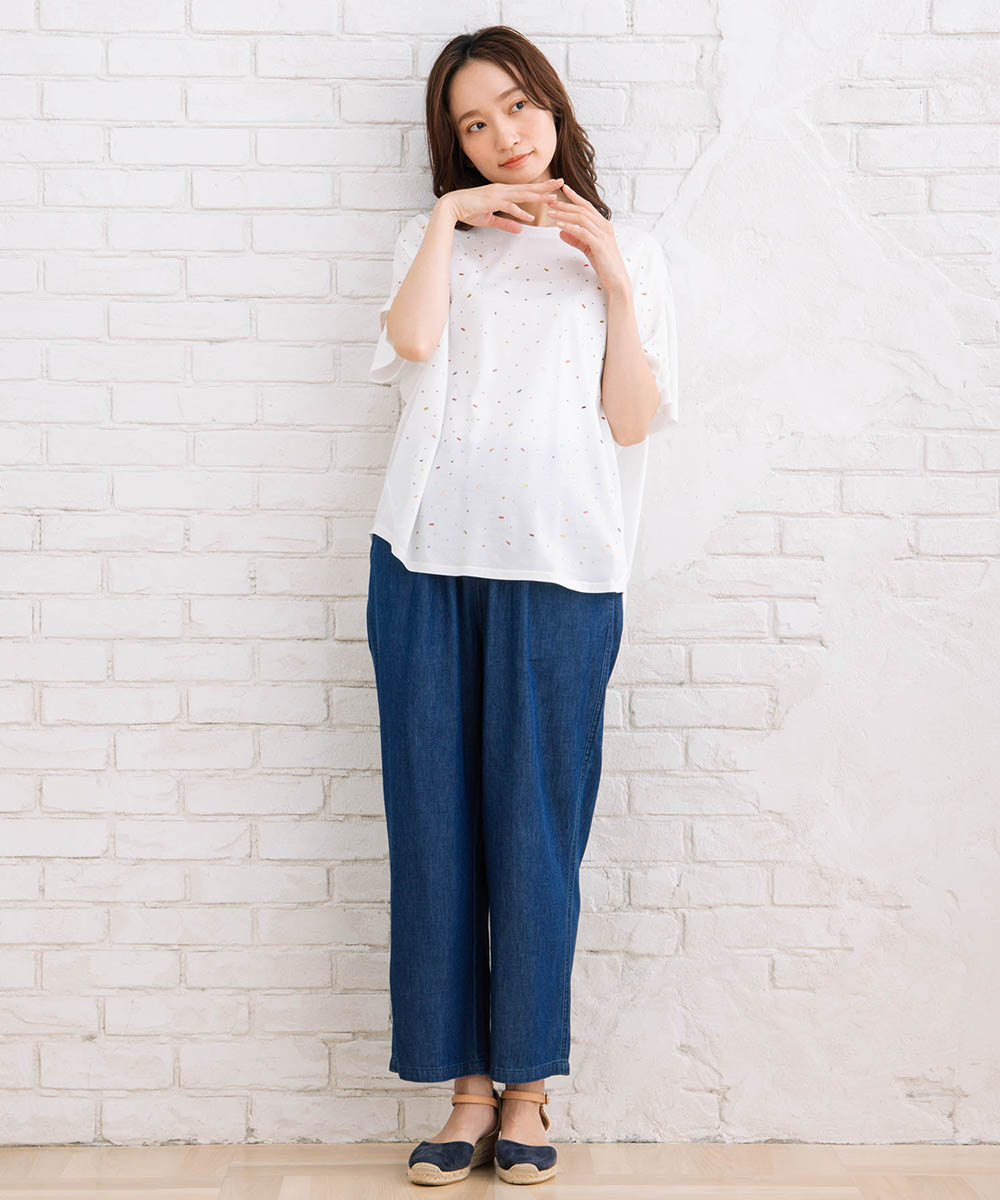 よく見ると、円や四角️などのカラフルなビジューが使用されており、気負わないシルエットに、きらめくカラフルビジューがアクセントです。