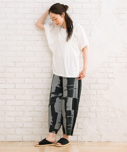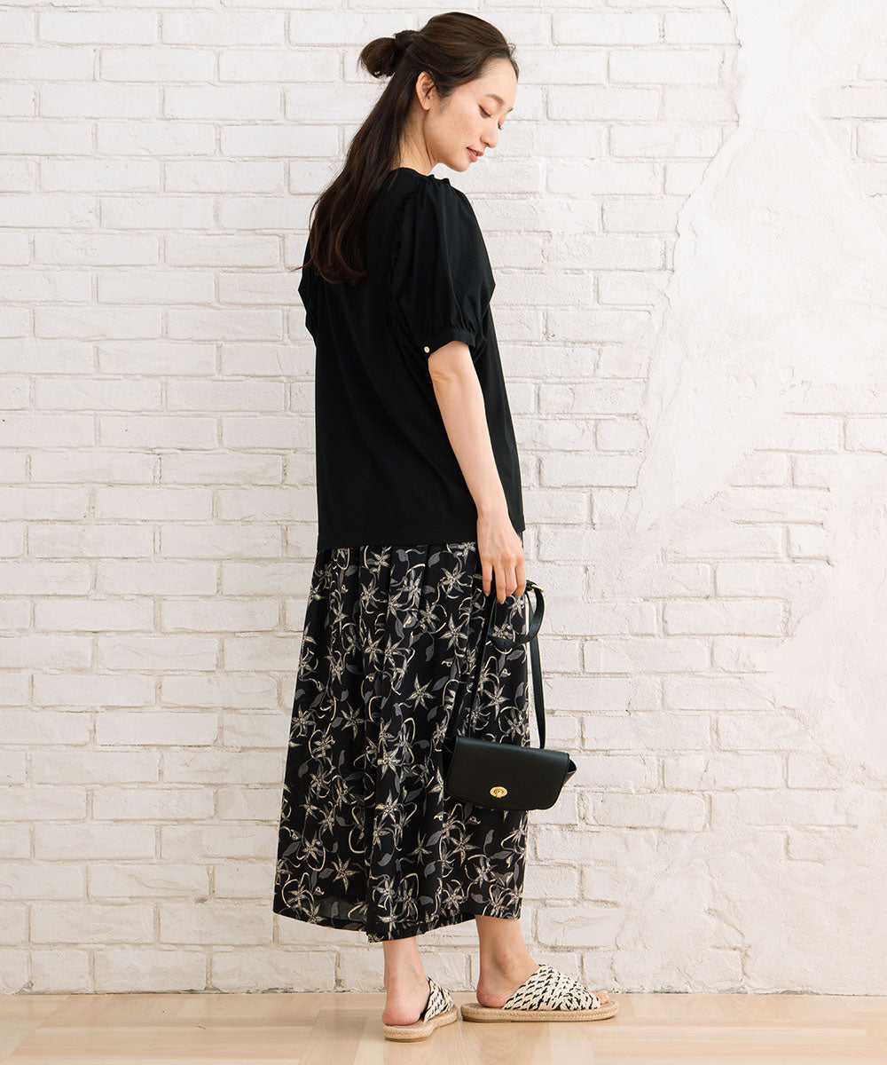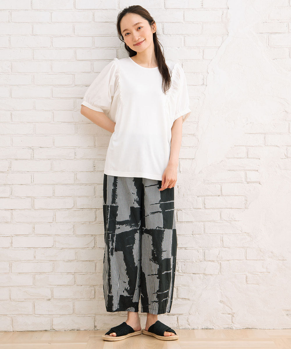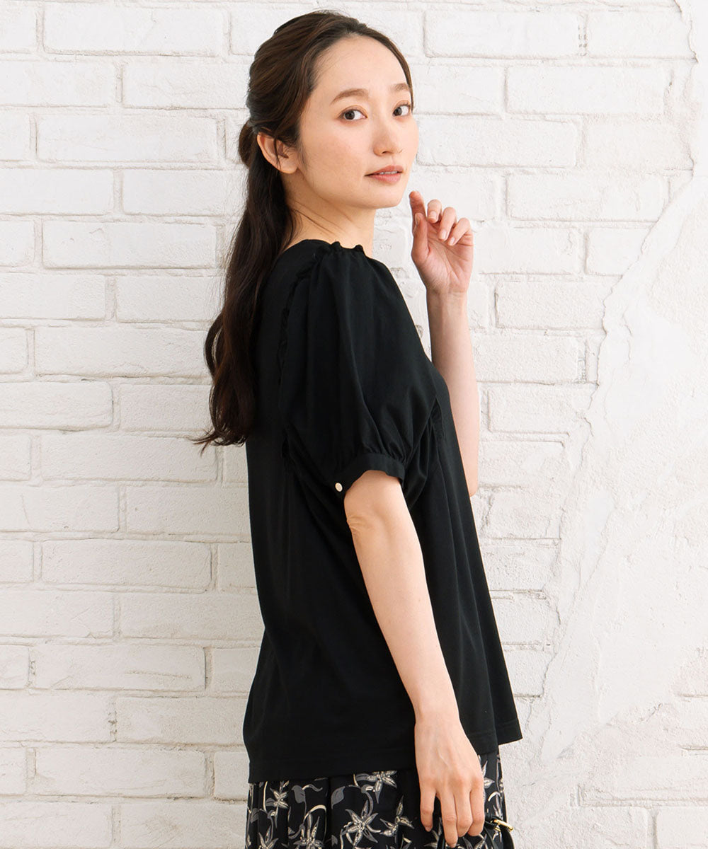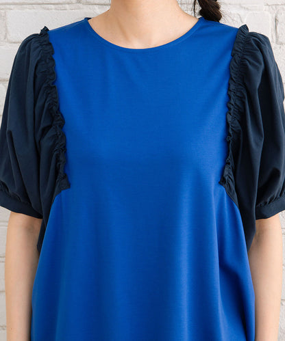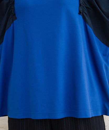 夏に映える!布帛コンビのギャザースリーブカットソー。