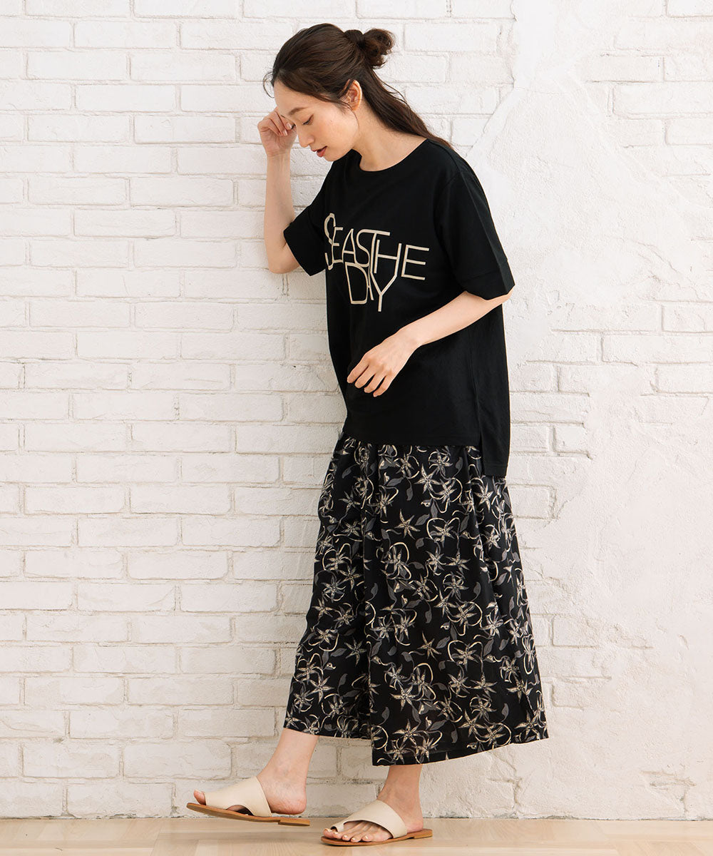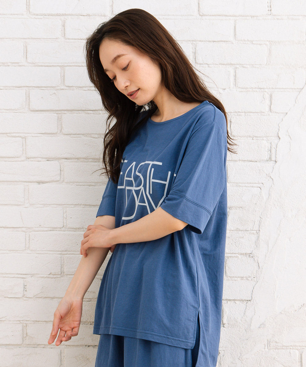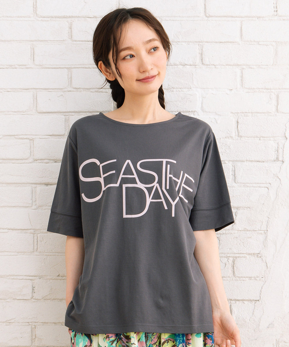 「SEAS THE DAY」のポジティブなメッセージが、シンプルなコーディネートにアクセントをプラスします。