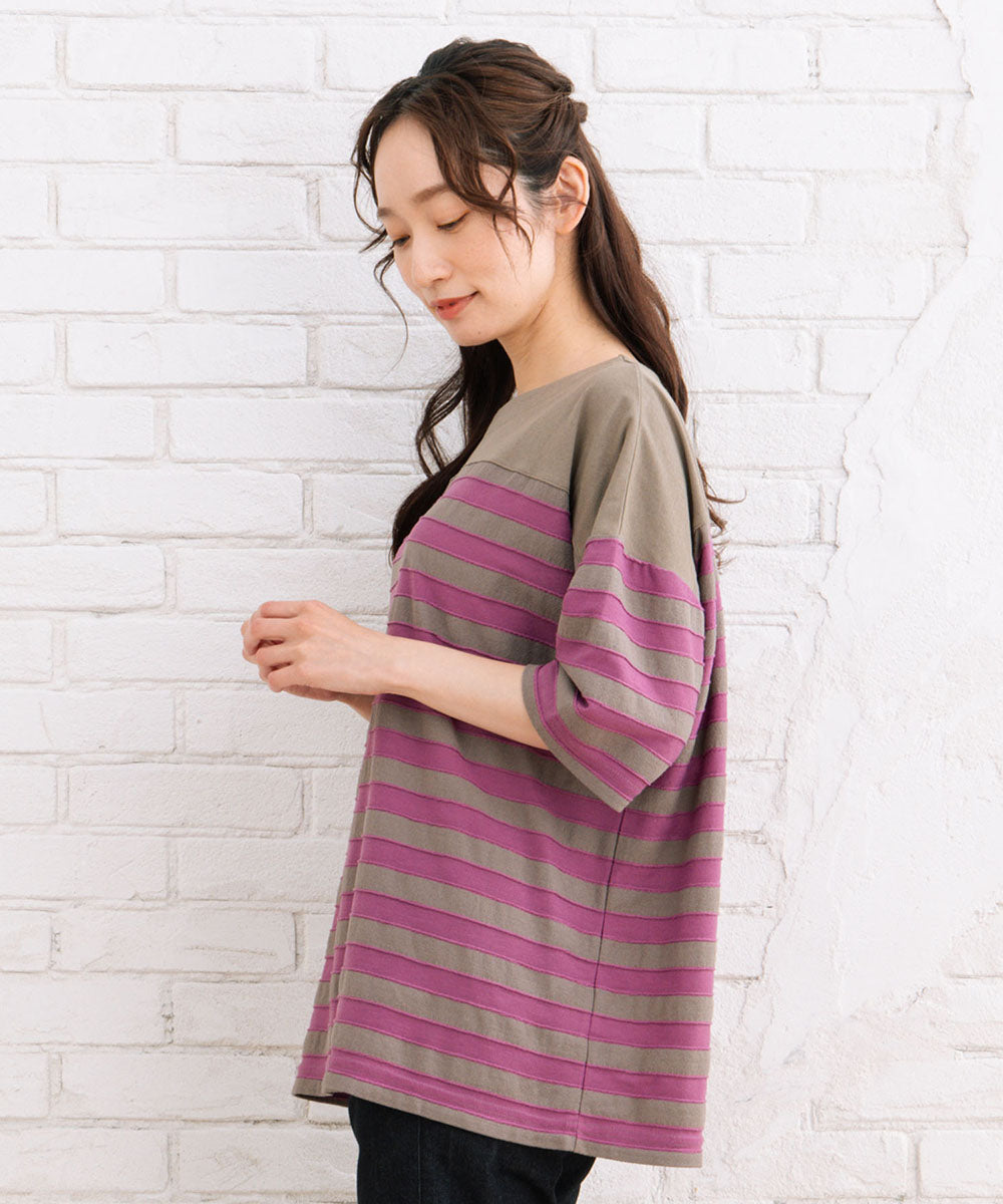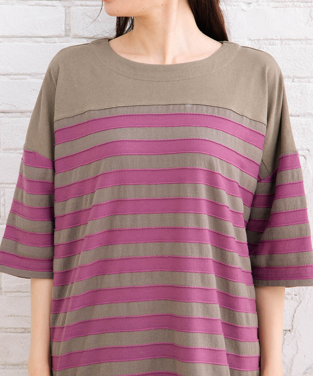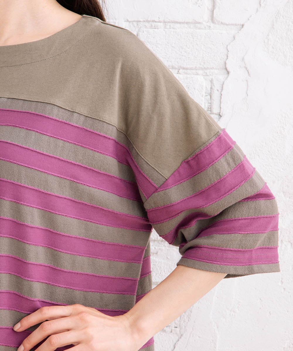 立体感のあるボーダー生地と、滑らかな無地のカットソーを組み合わせた、デザイン性の高いTシャツです。